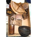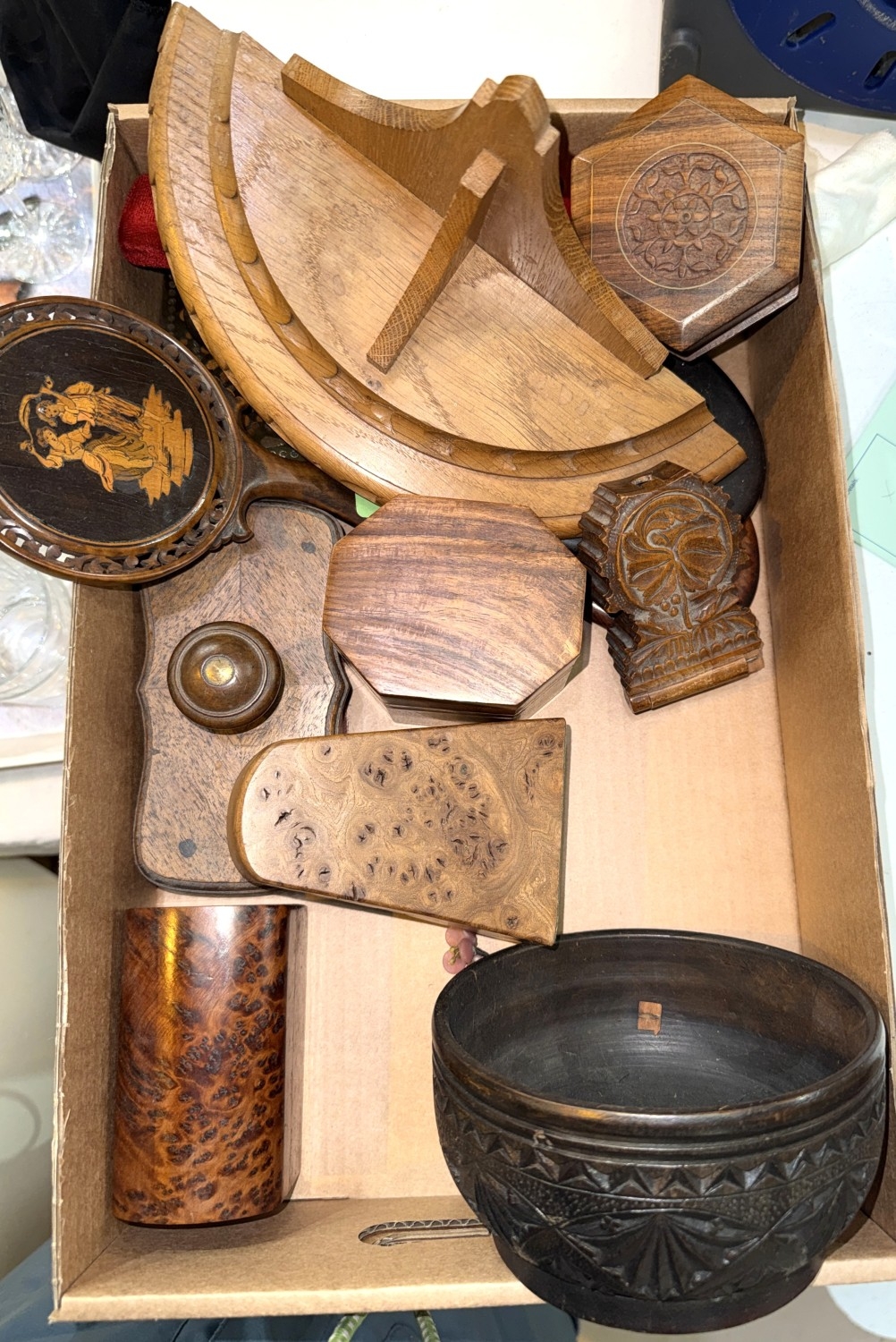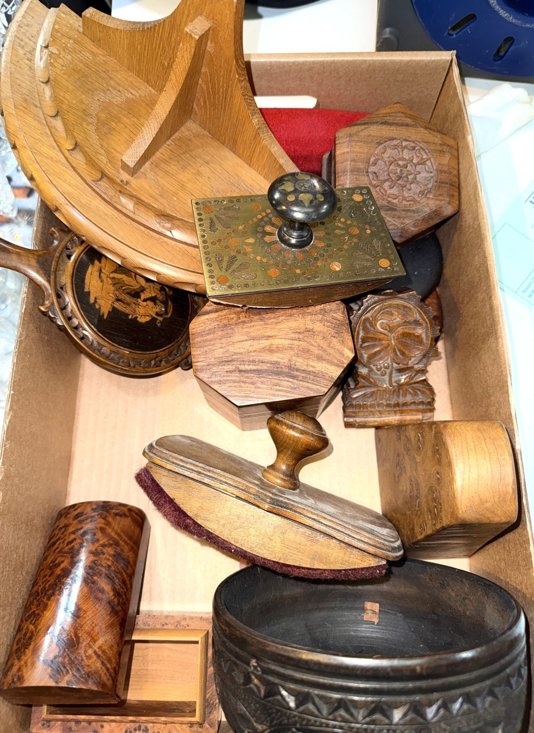 A 19th century inlaid hand mirror decorated with a dancing couple, other hand mirrors, carved wood ink presses etc