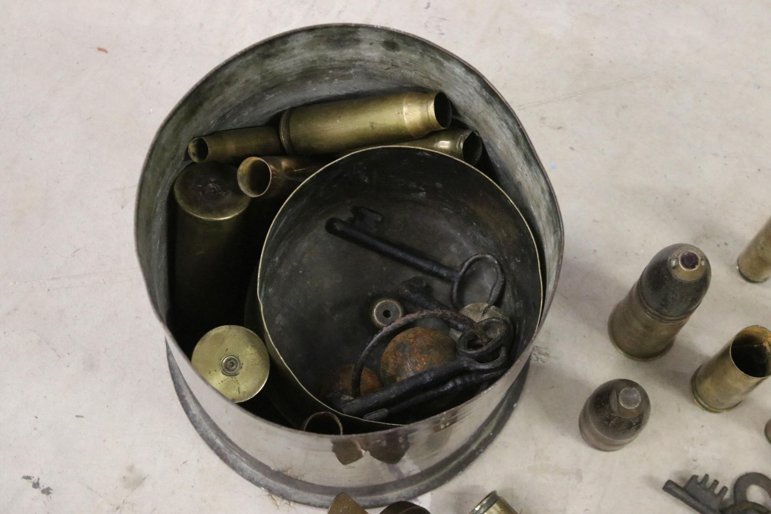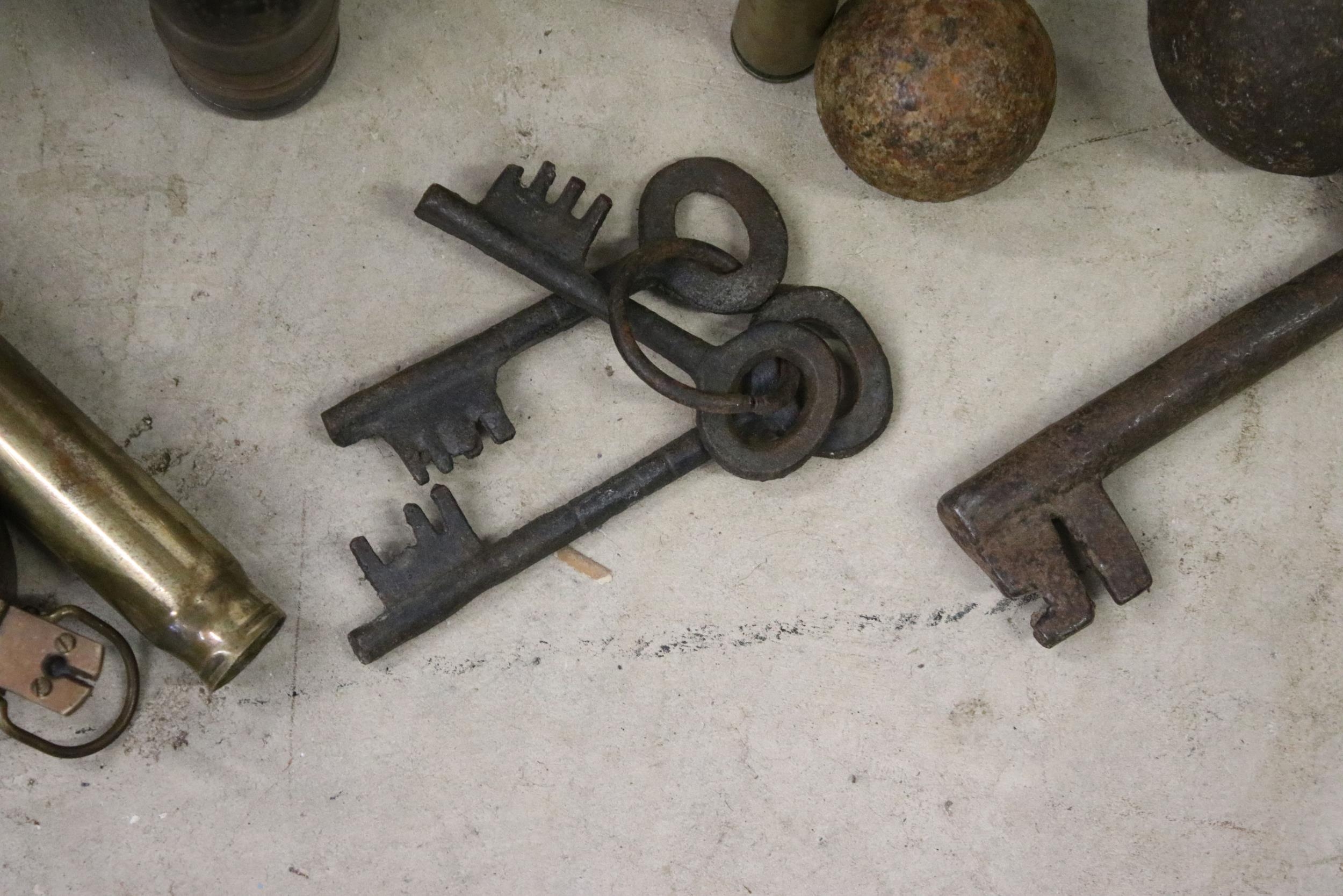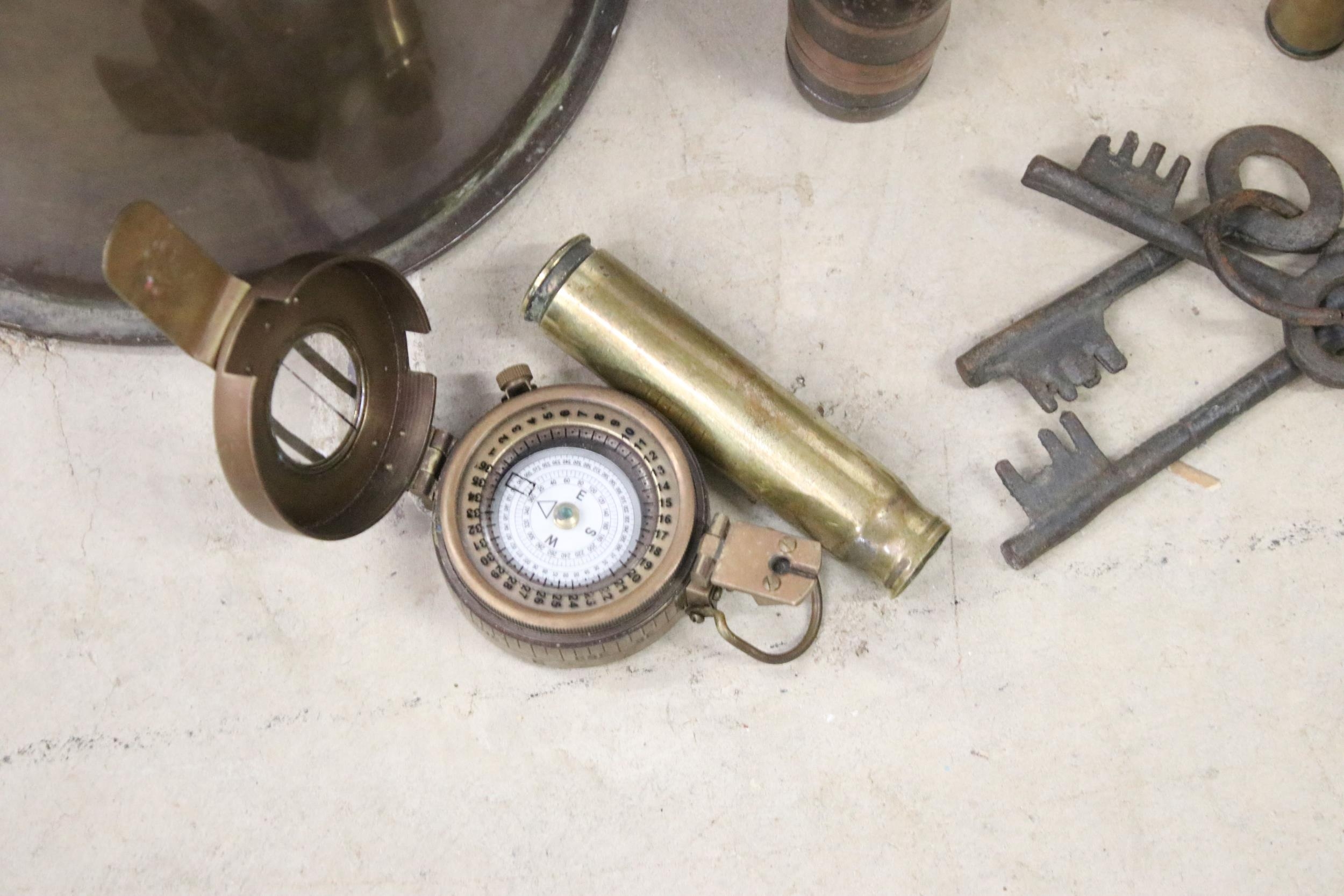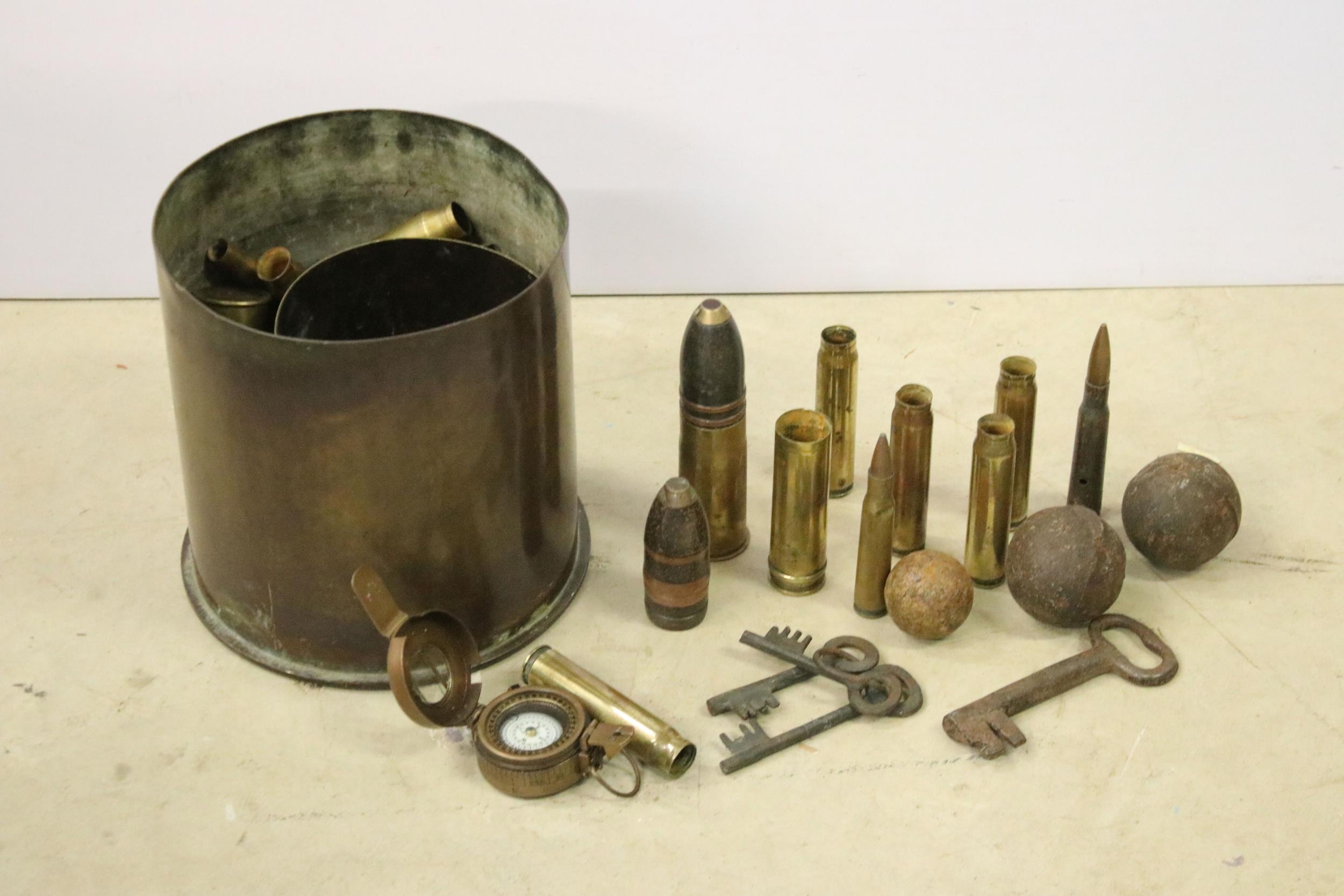 Collection of WWI shell cases and shell cartridges together with a MKIII 1941 TG.Co.Ltd London Compass and a small quantity of keys.