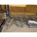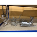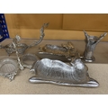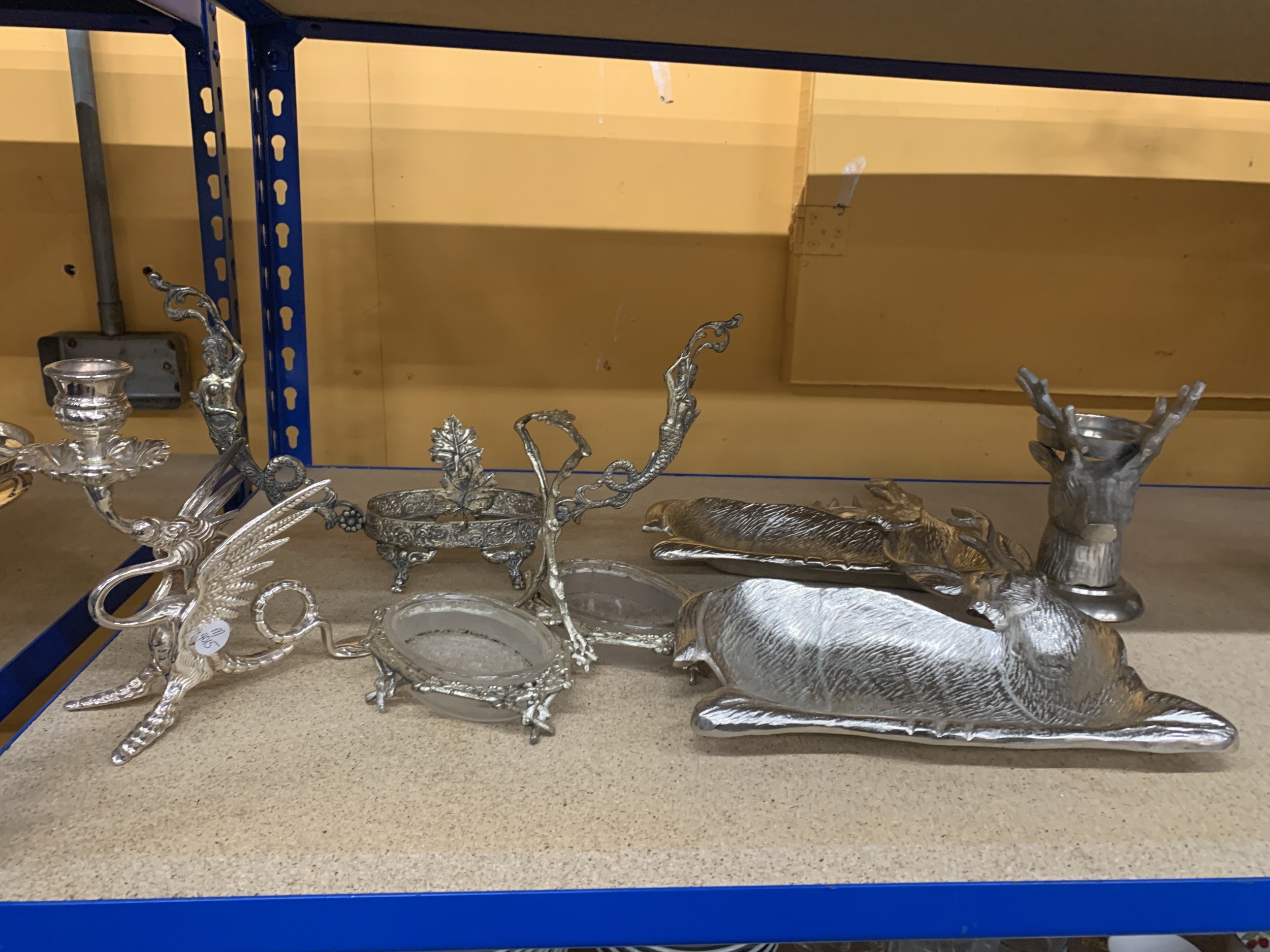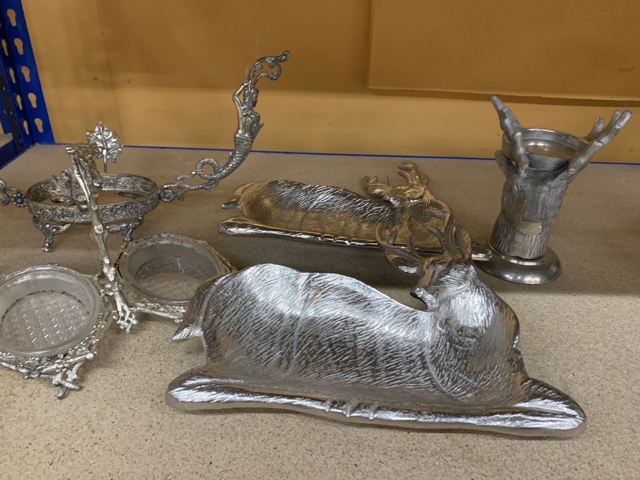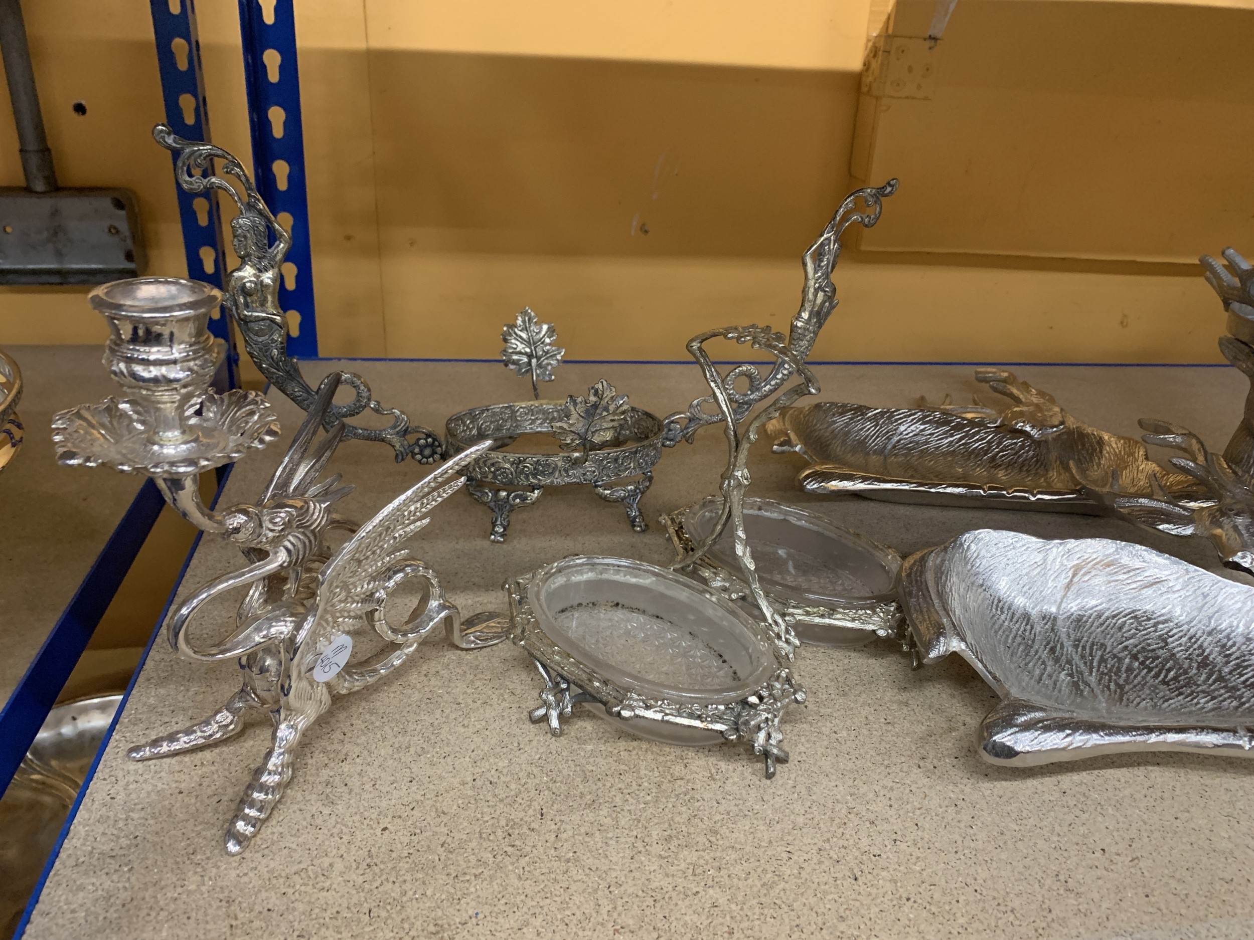 A QUANTITY OF SILVER PLATED AND SILVER COLOURED ITEMS TO INCLUDE, STAG THEMED SERVING DISHES AND CANDLE HOLDER, A CENTREPIECE FEATURING MERMAIDS, A DRAGON CANDLE HOLDER, ETC