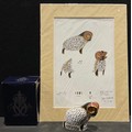 A Royal Crown Derby paperweight, Derby Ram, 7cm high, exclusively available from The Royal Crown Derby Visitors Centre, gold stopper, red printed marks and stamp to the base, boxed, with accompanying designer's mounted artwork print