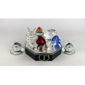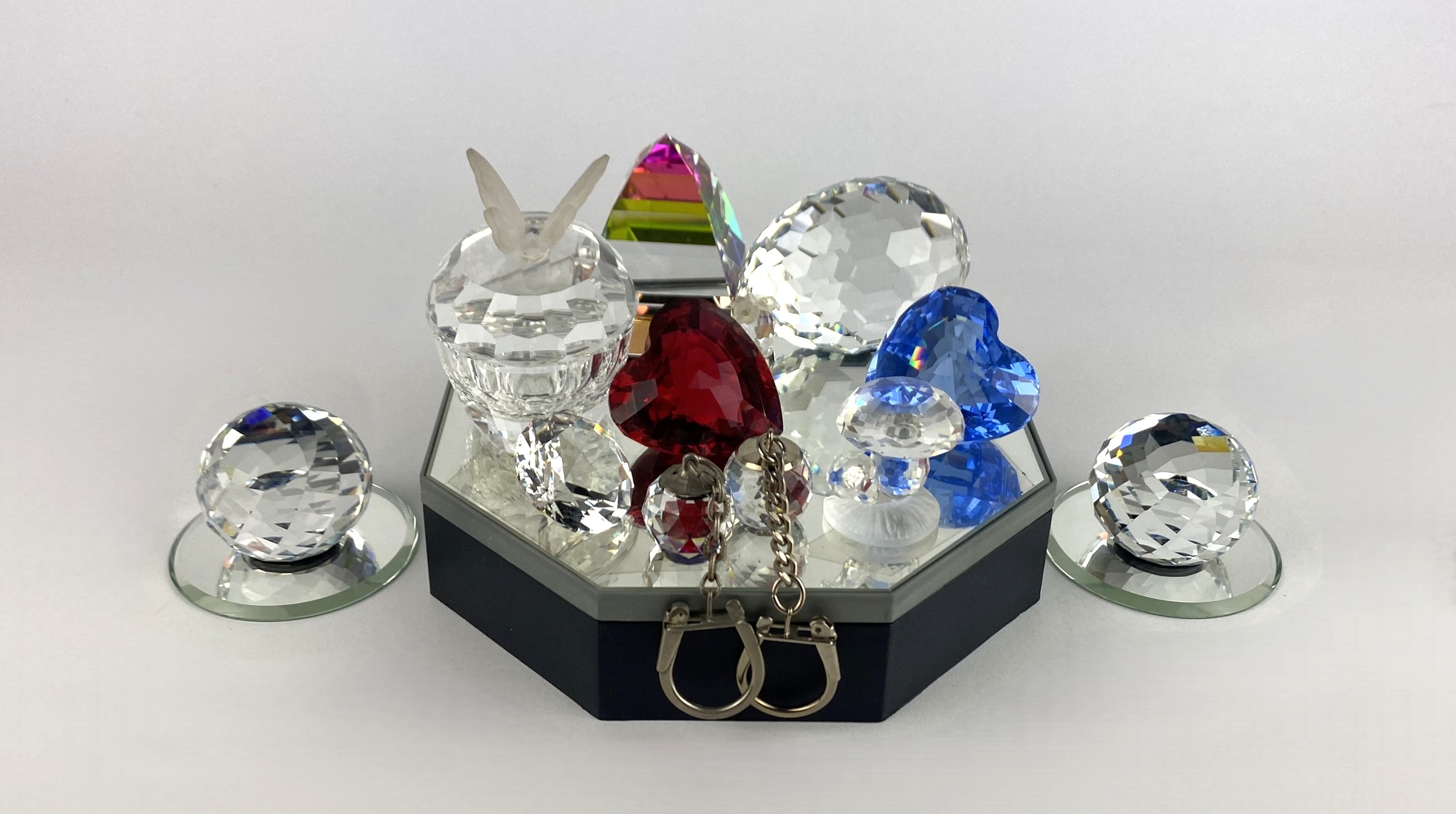 A collection of Swarovski crystal ornaments to include coloured hearts, key rings, trinket box and egg, most with boxes, and a Swarovski mirrored stand