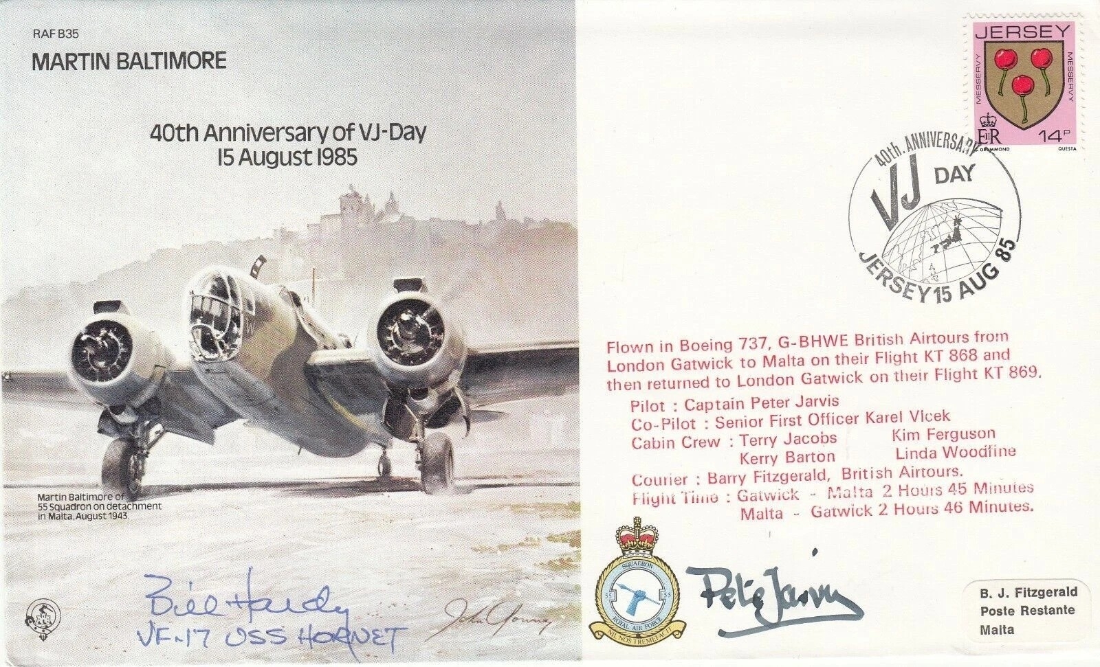 B35a 40th Anniv VJ - Day Signed by Bill Hardy USA Ace 6½ Victories . 15 Aug 85 Jersey 40th Anniv VJ - Day. Flown in Boeing 737 to Malta. Personally Signed by in Boeing 737 Pilot Captain Peter Jarvis and Bill Hardy USA Naval Ace 6½ inches Commissioned an Ens on 16 Dec 1943 served with VF-17 from February 1944 based on the Hornet by Feb 1945 he had 748. 4 flying hours. Details enclosed. Single Vendor RAF cover collection. Good condition. All autographs come with a Certificate of Authenticity. We combine postage on multiple winning lots and can ship worldwide. UK postage from £5.99, EU from £7.99, Rest of World from £9.99