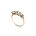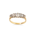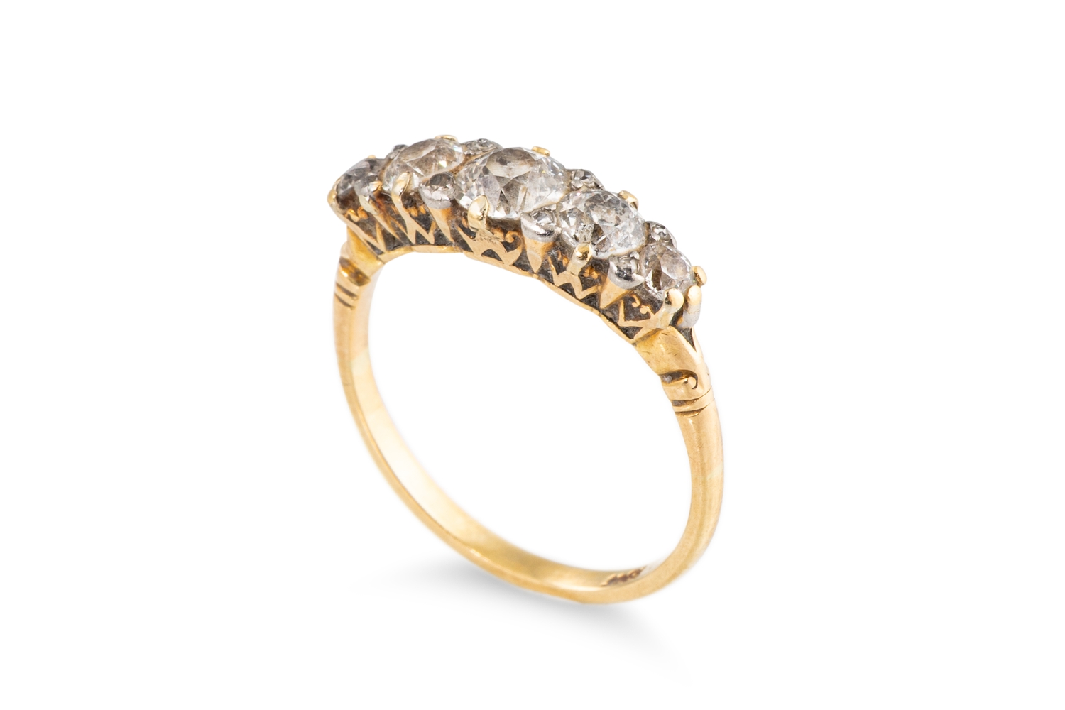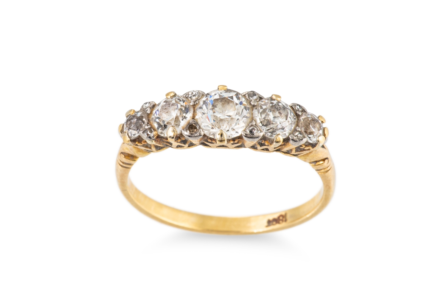 A GRADUATED FIVE STONE DIAMOND RING, mounted in a carved 18ct yellow gold mount. Estimated: 1.80 ct, H colour, VS - SI clarity. Size S Estimated: 1.80 ct, H colour, VS - SI clarity