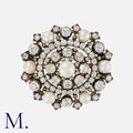 An Antique Pearl and Diamond Brooch in yellow gold and silver, set with seven pearls to an oval form with old cut diamonds set throughout weighing approx. 6.0ct in total. With antique presentation box. Owned by the same family for over 60 years.