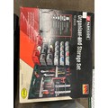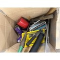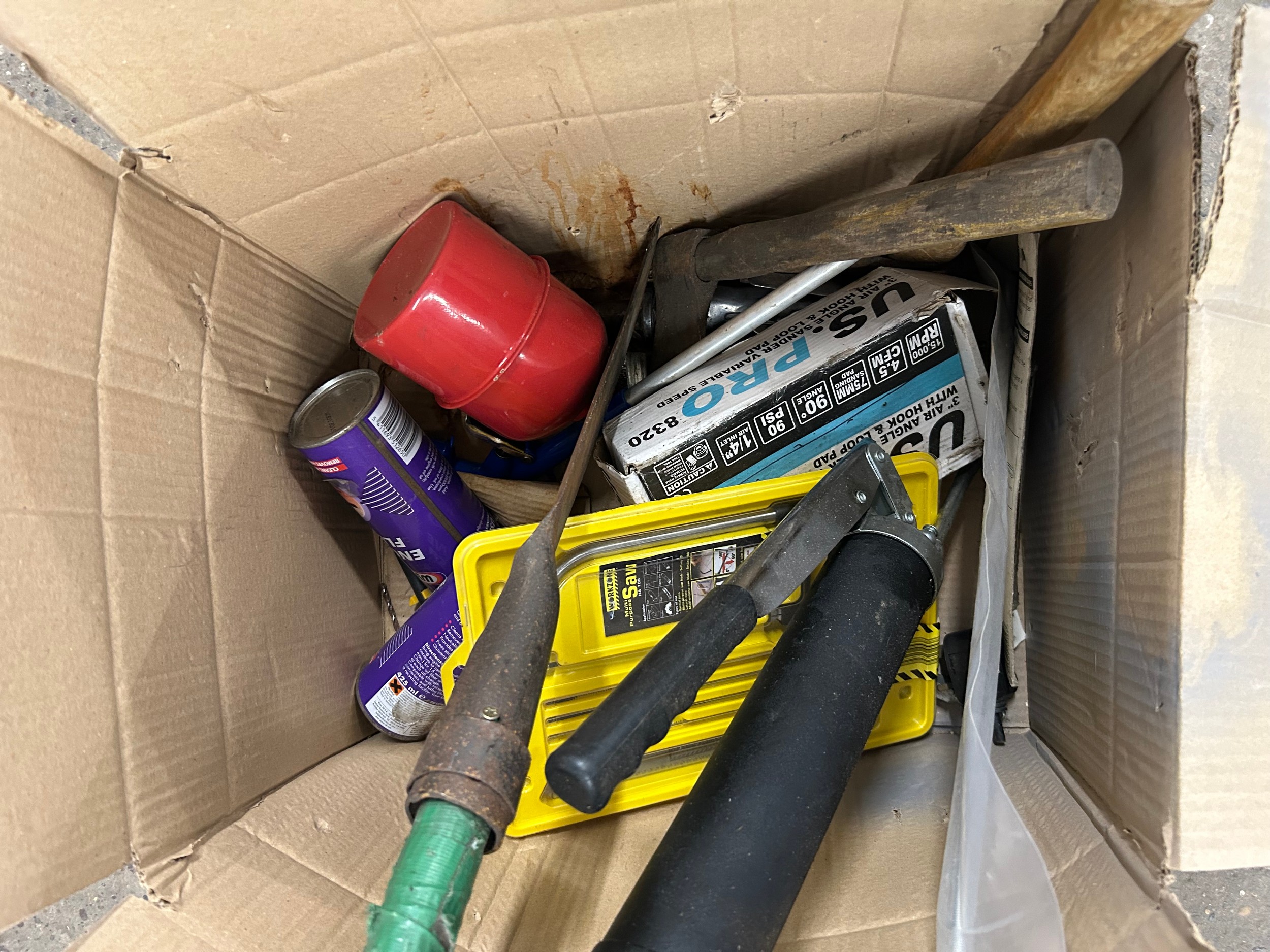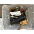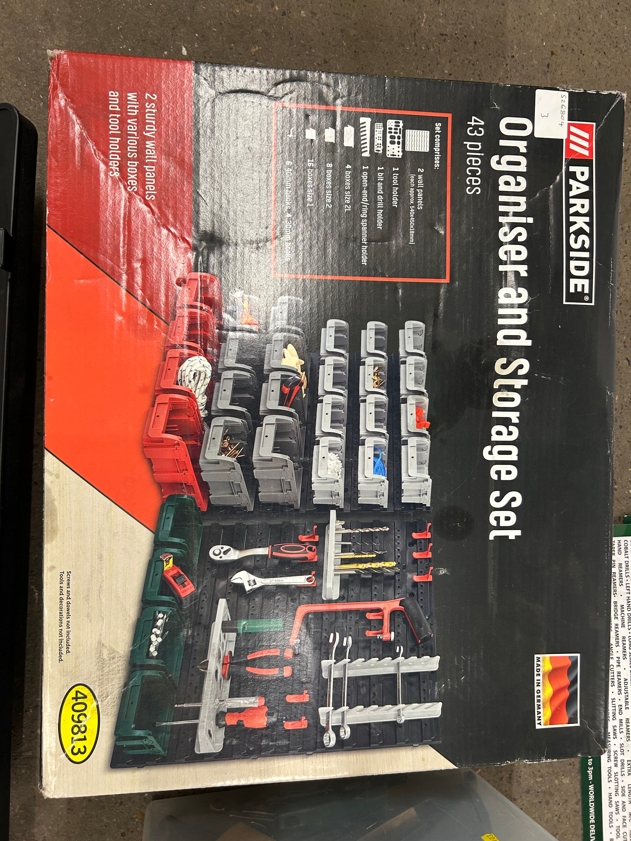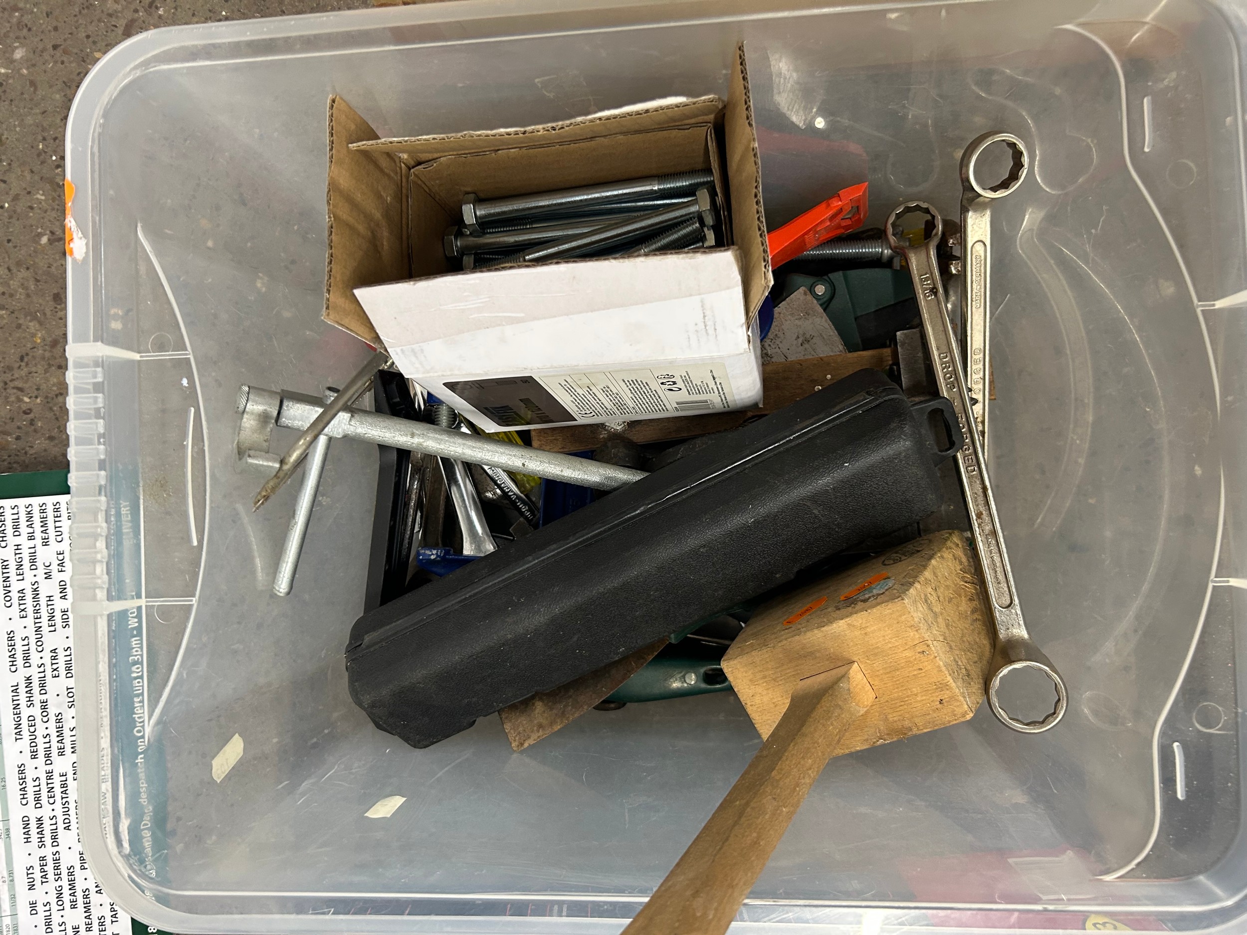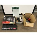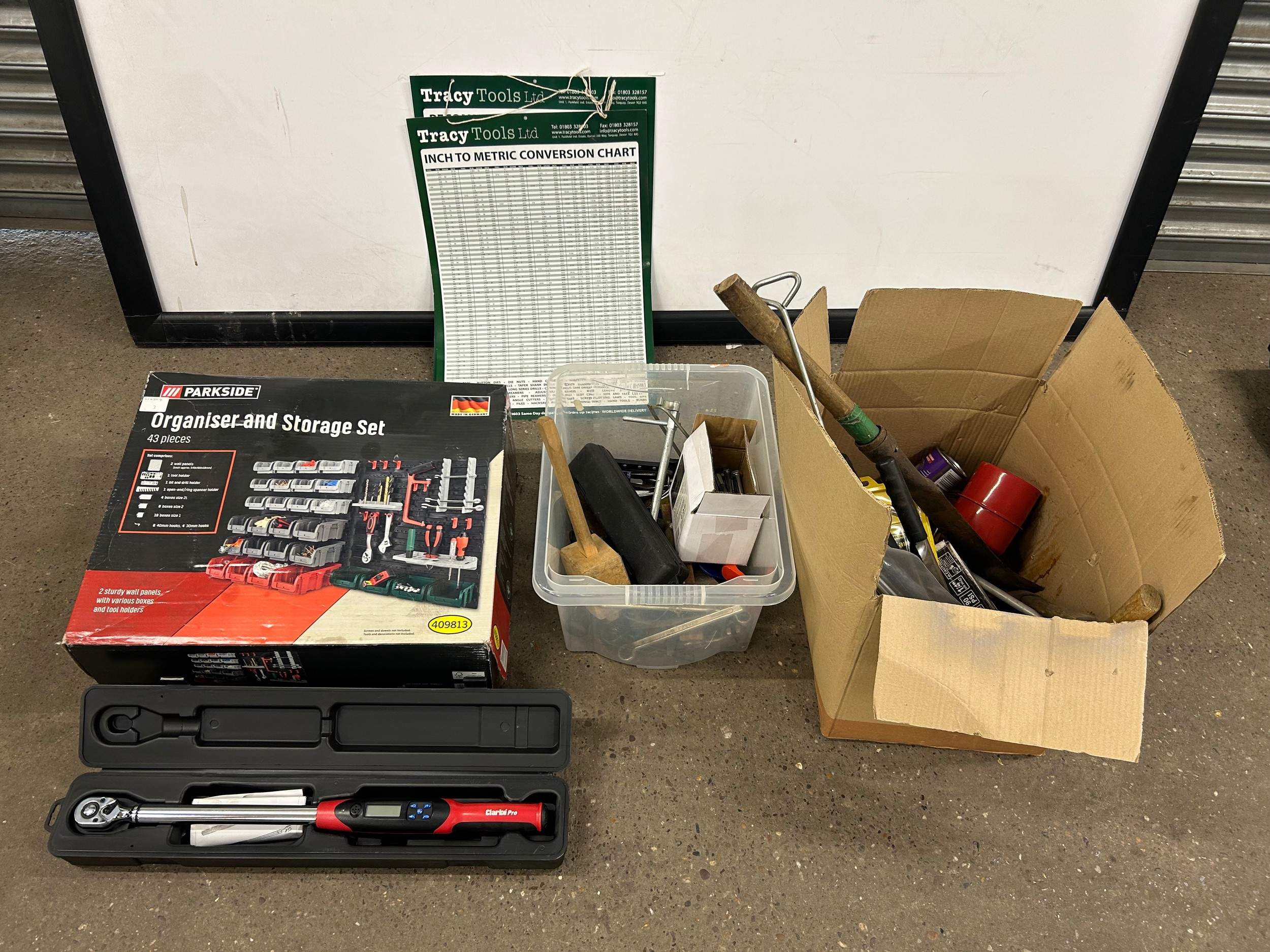 2 boxes of tools including axes, saw, large socket in a case, bolts and a Parkside organiser and storage set