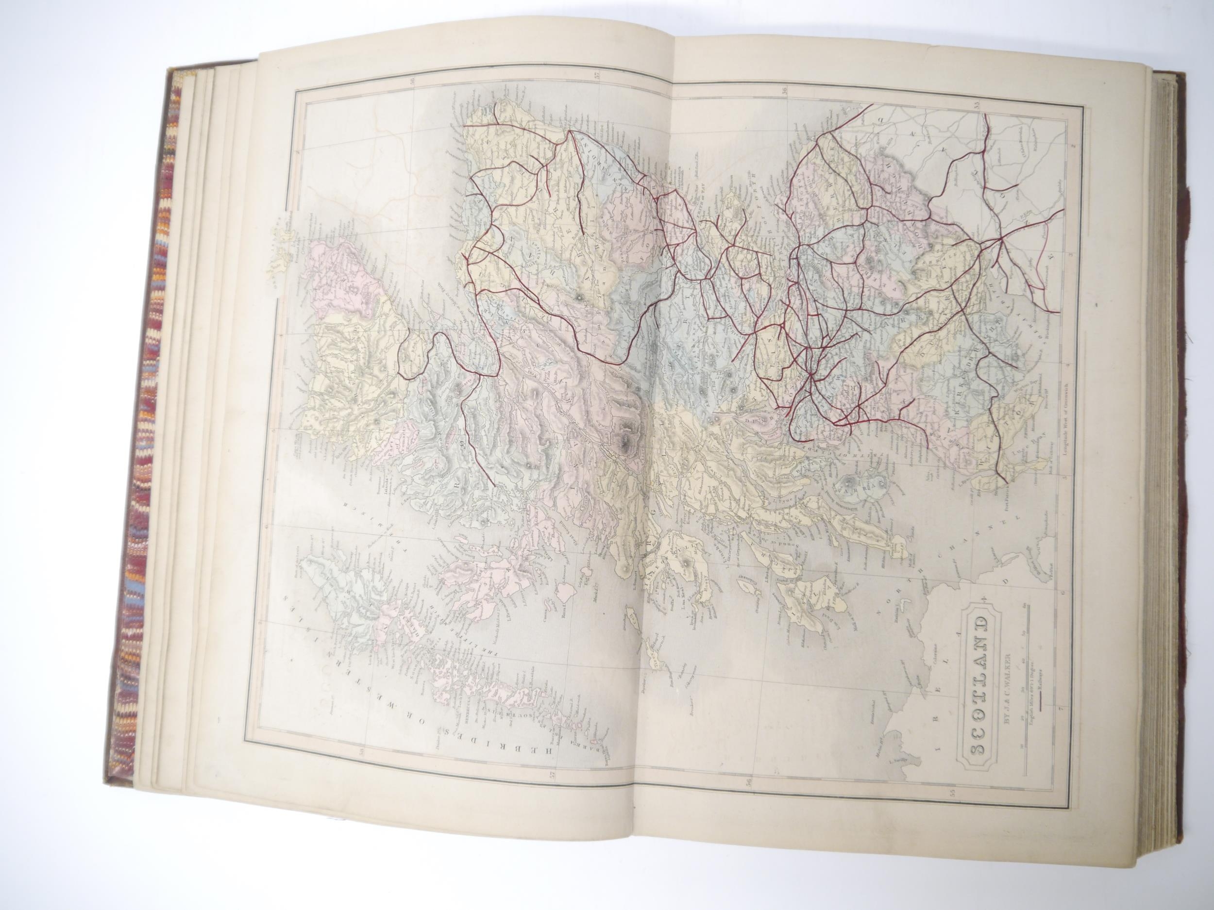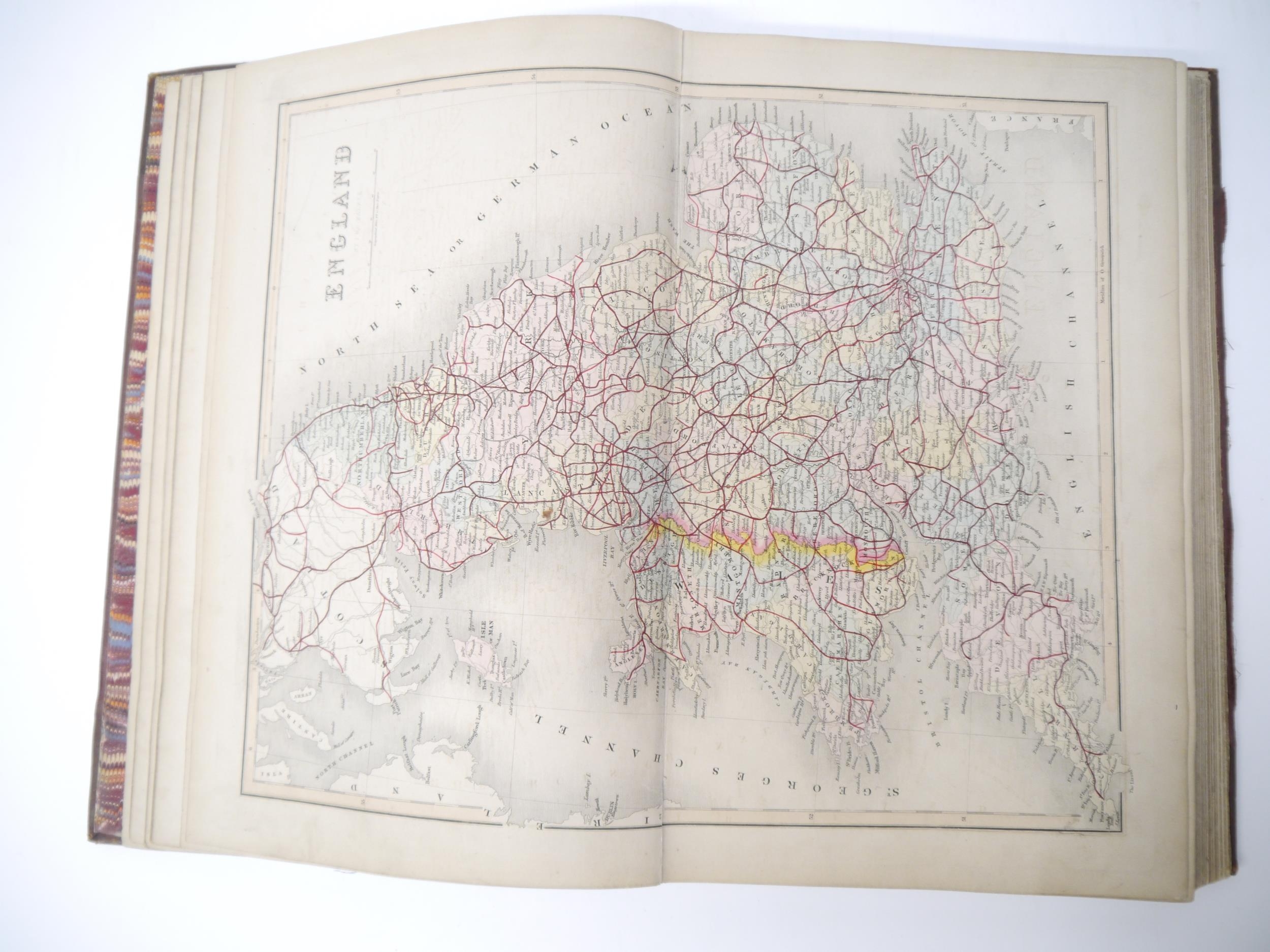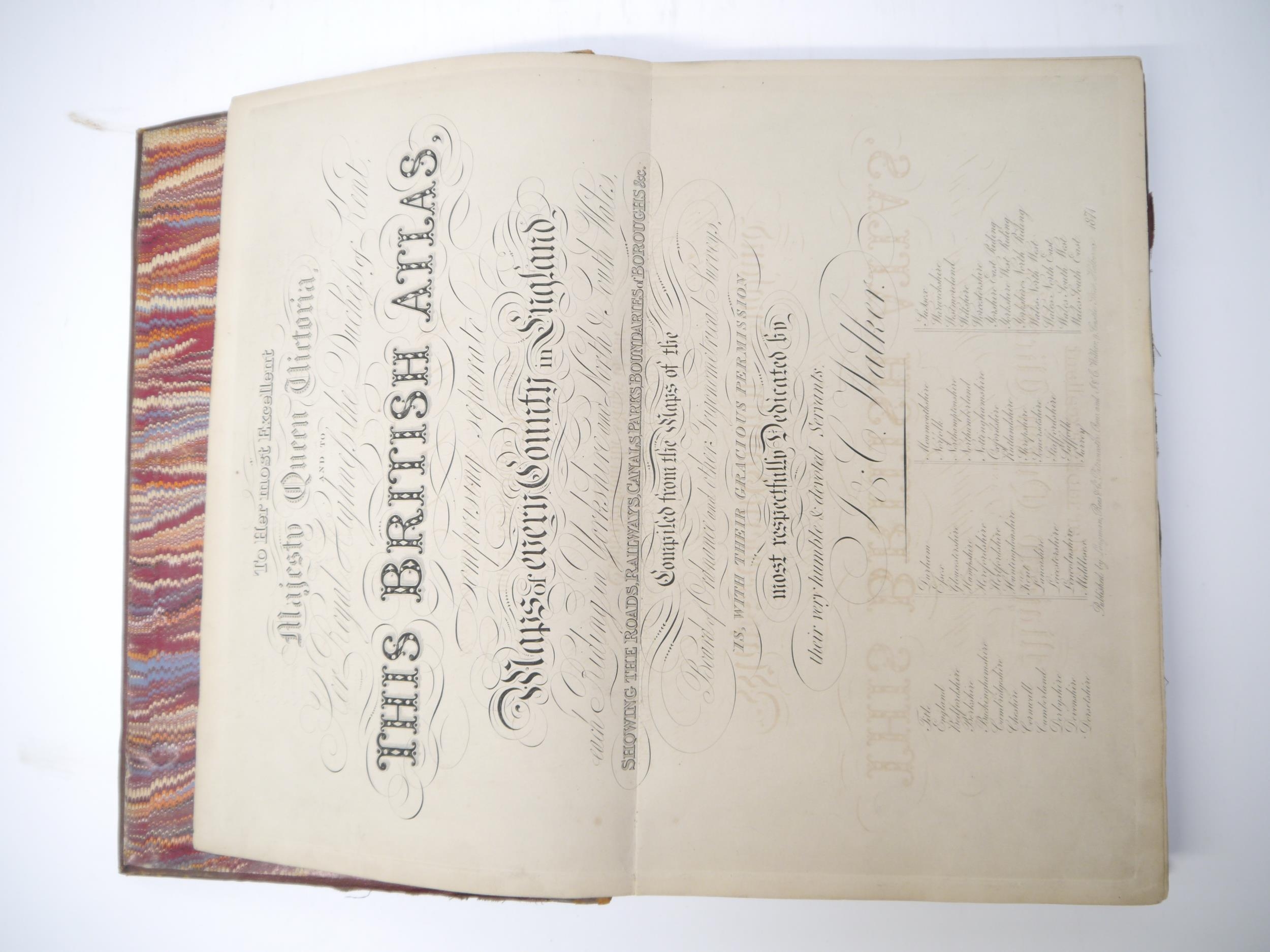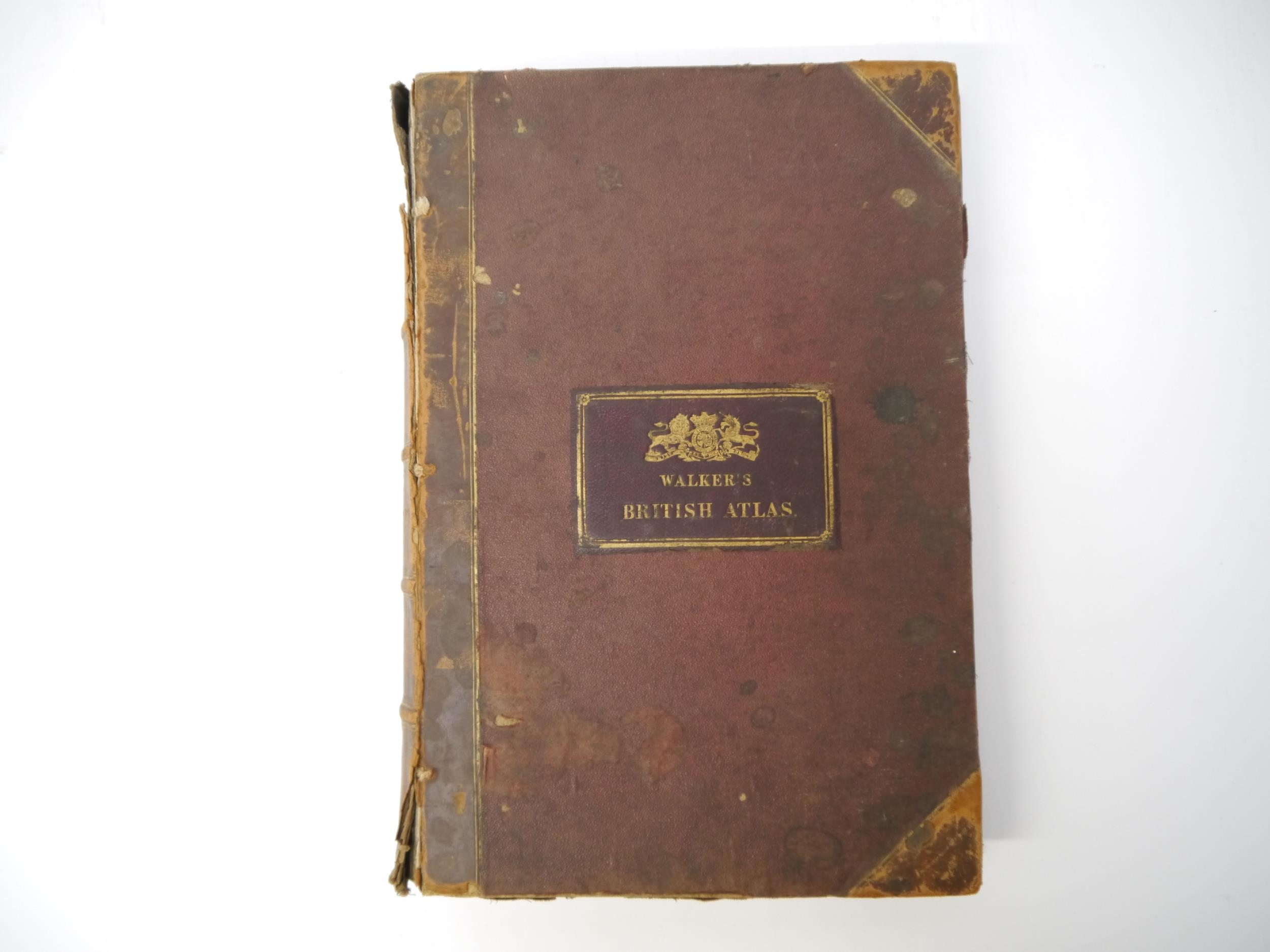 (Atlases, Great Britain), J. & C. Walker (published): 'British Atlas, comprising separate maps of every county in England, each Riding in Yorkshire and North & South Wales, showing the roads, railways, canals, parks, boundaries of boroughs &c. compiled from the maps of the Board of Ordnance and other trigonometrical surveys', London, Longman Rees & Co and J & C Walker, 1874, double page copper engraved title page/dedication page, 5 double page tables of populations of market towns in each county etc, 49 double page engraved hand coloured maps as called for (comprising England, Scotland, Ireland, plus 46 county maps), folio, contemporary half calf gilt (worn), gilt leather title label with gilt Coat of Arms of Queen Victoria above title mounted to front cover