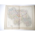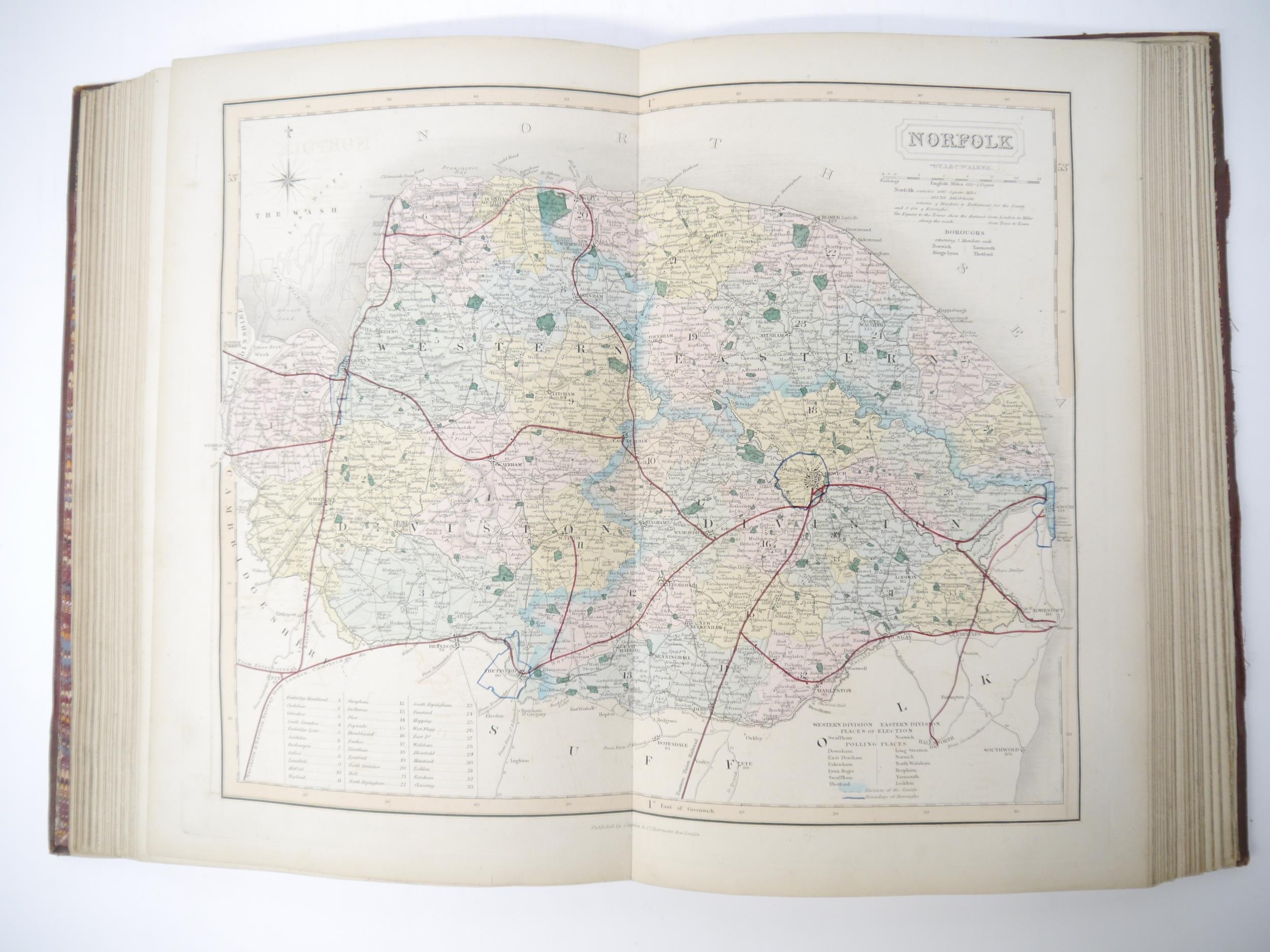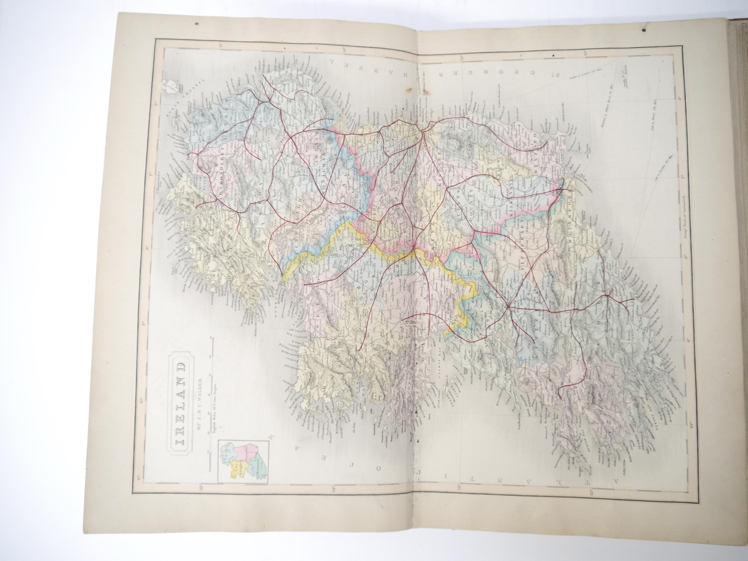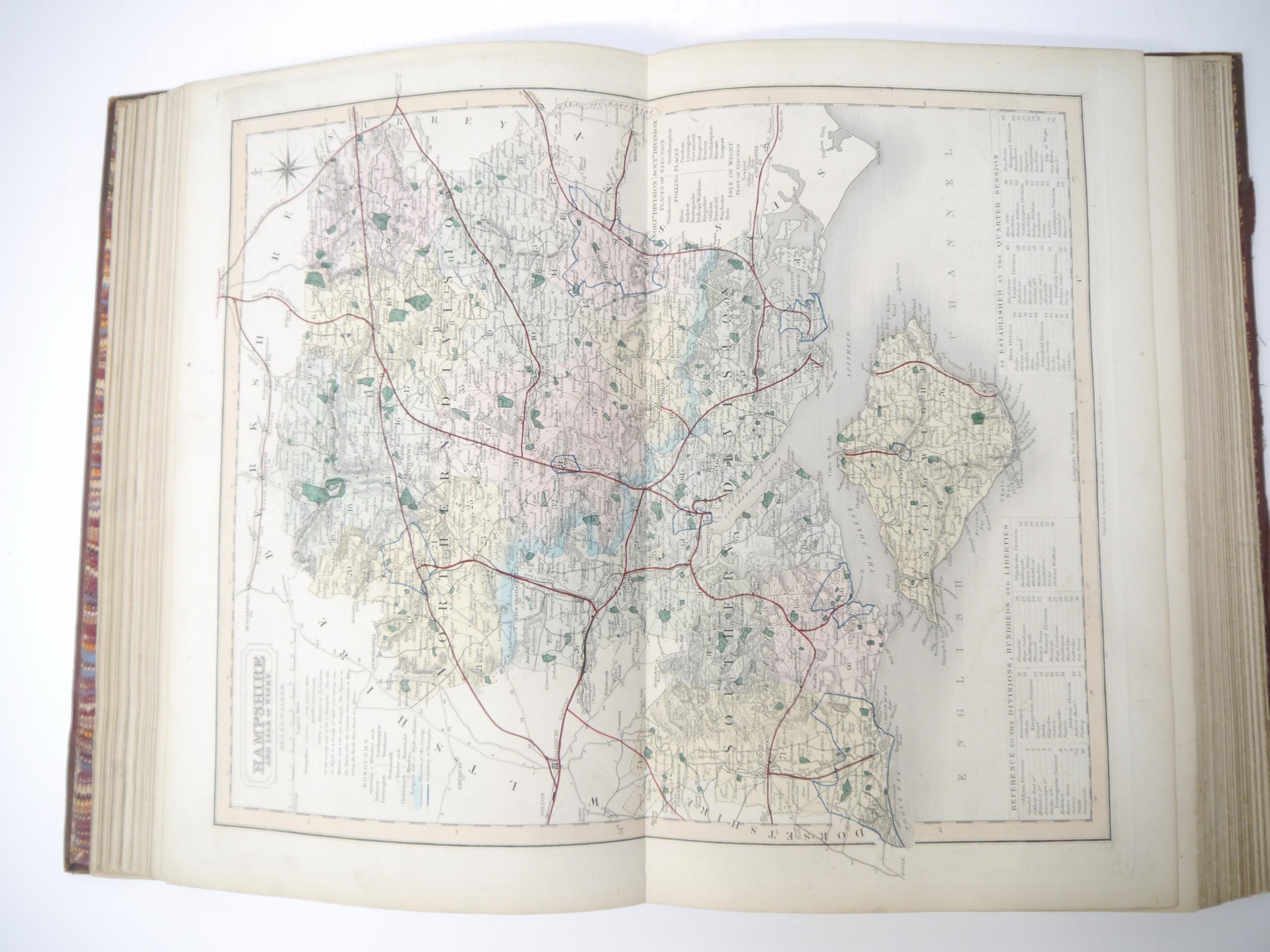 (Atlases, Great Britain), J. & C. Walker (published): 'British Atlas, comprising separate maps of every county in England, each Riding in Yorkshire and North & South Wales, showing the roads, railways, canals, parks, boundaries of boroughs &c. compiled from the maps of the Board of Ordnance and other trigonometrical surveys', London, Longman Rees & Co and J & C Walker, 1874, double page copper engraved title page/dedication page, 5 double page tables of populations of market towns in each county etc, 49 double page engraved hand coloured maps as called for (comprising England, Scotland, Ireland, plus 46 county maps), folio, contemporary half calf gilt (worn), gilt leather title label with gilt Coat of Arms of Queen Victoria above title mounted to front cover