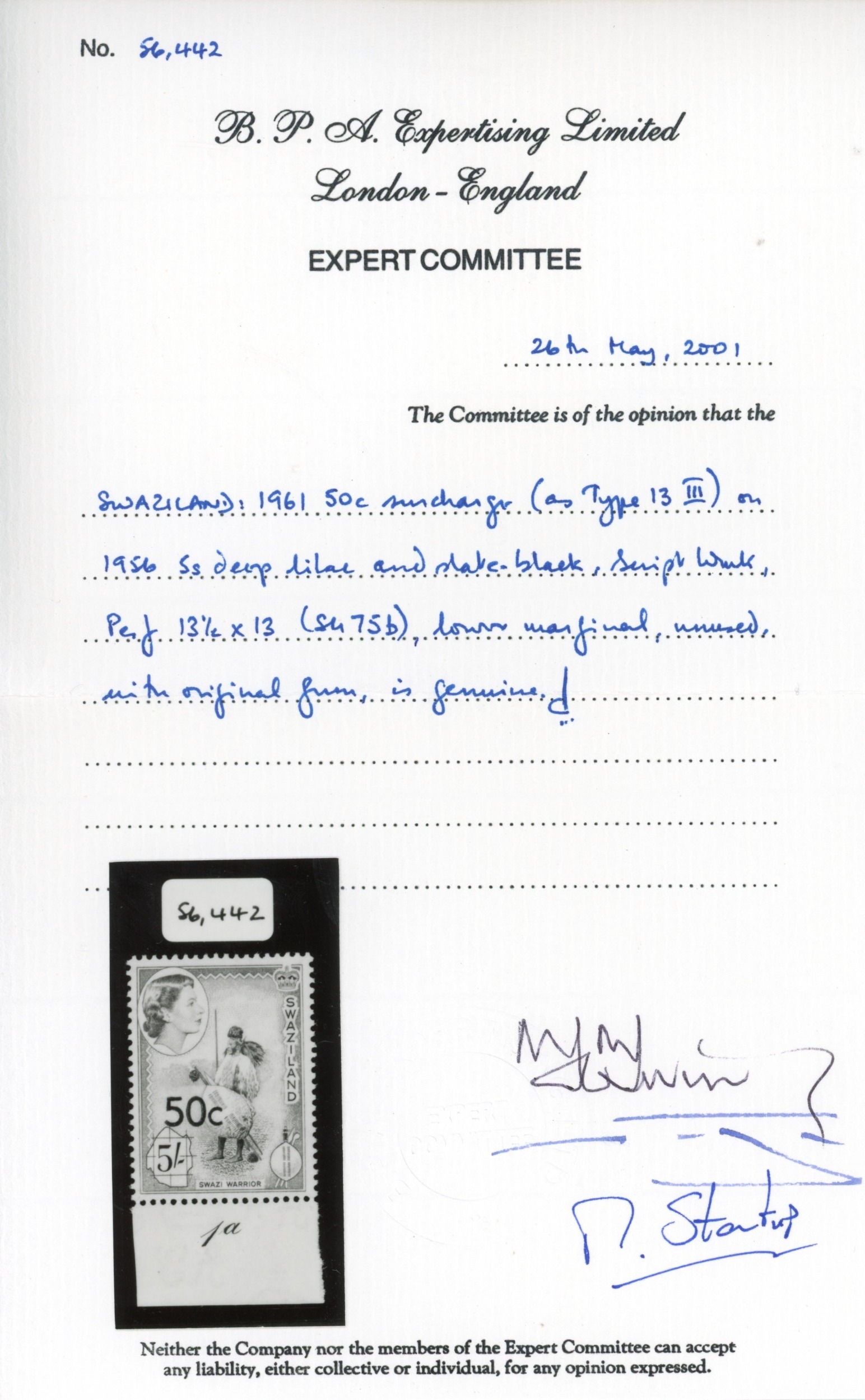 Swaziland SG 75b 1961 50c on 5s Type III surcharge mint