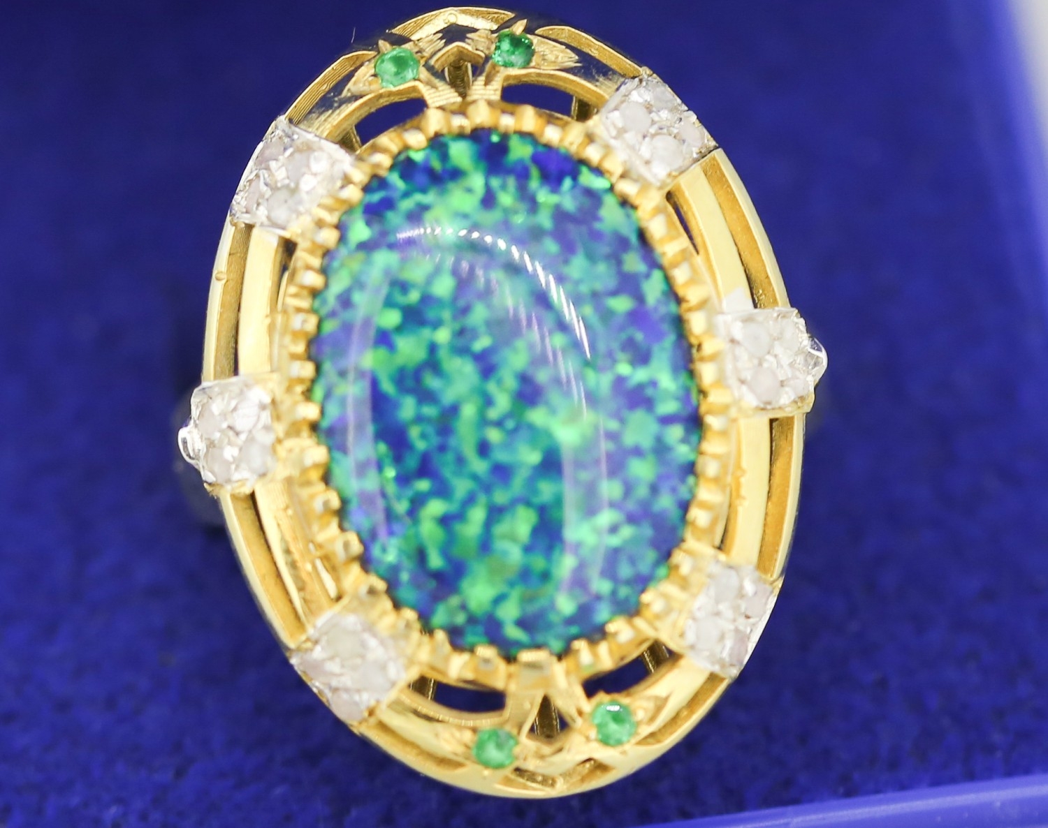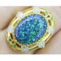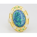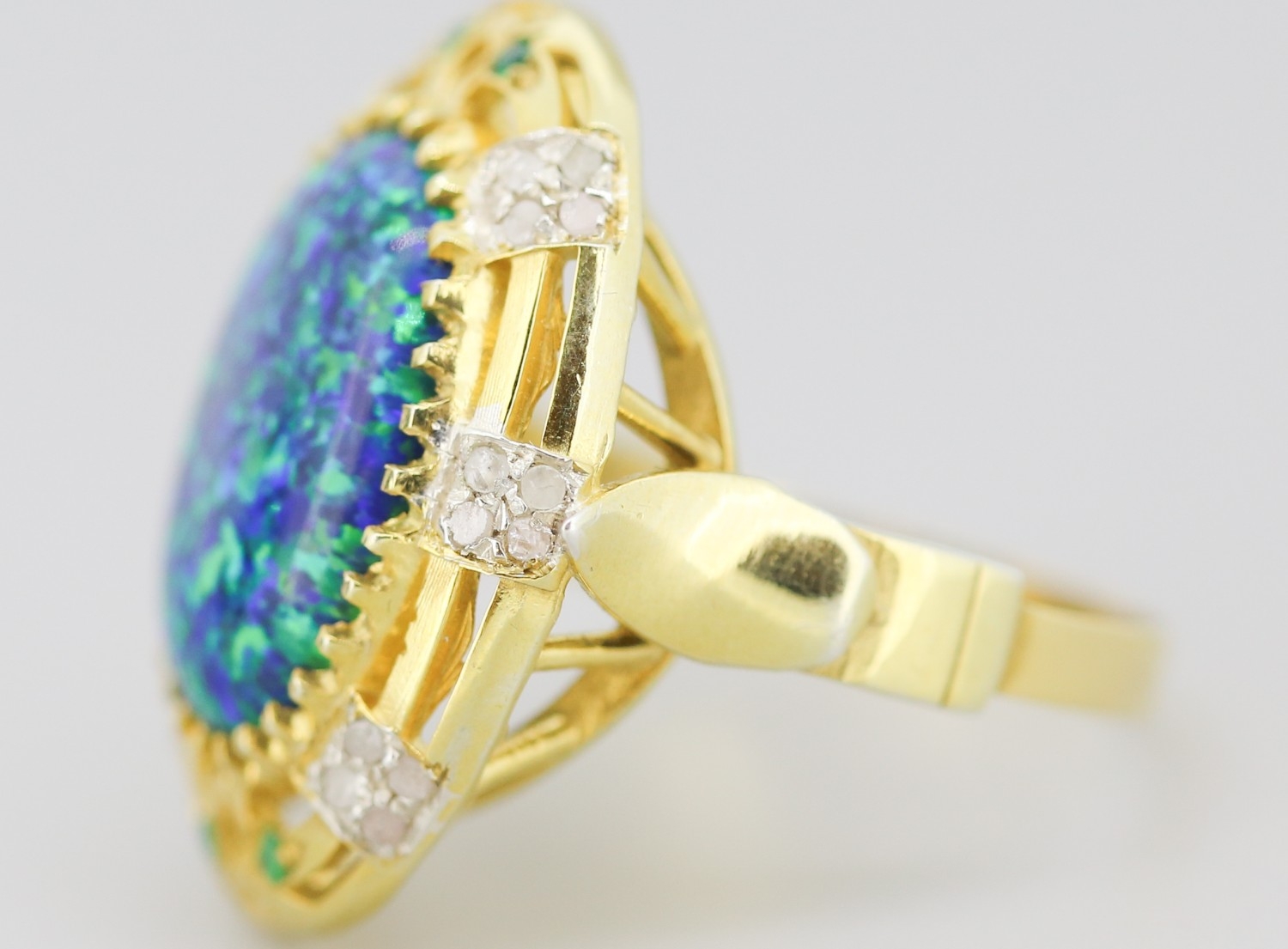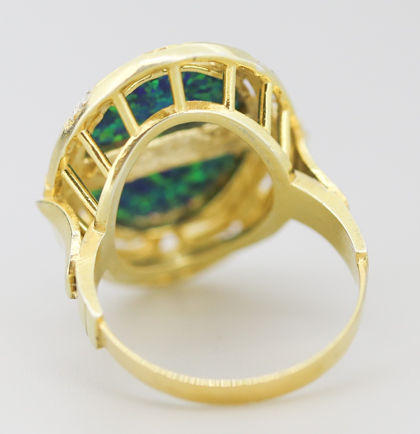 Finely Detailed Syntenic Opal Set Cocktail Ring with Further Diamond Insets Mounted in 9 Carat Yellow Gold Ring Size T and a Half