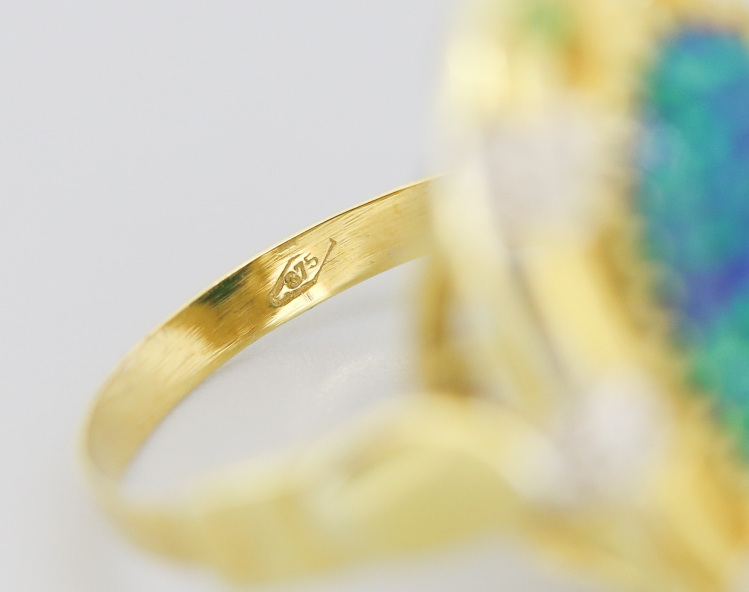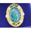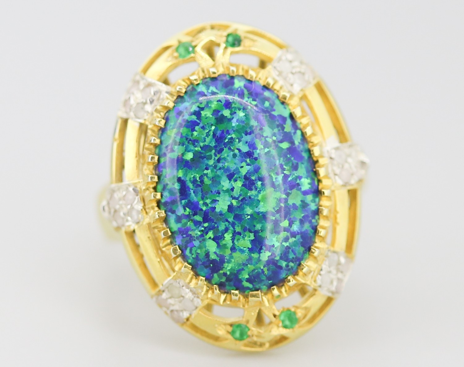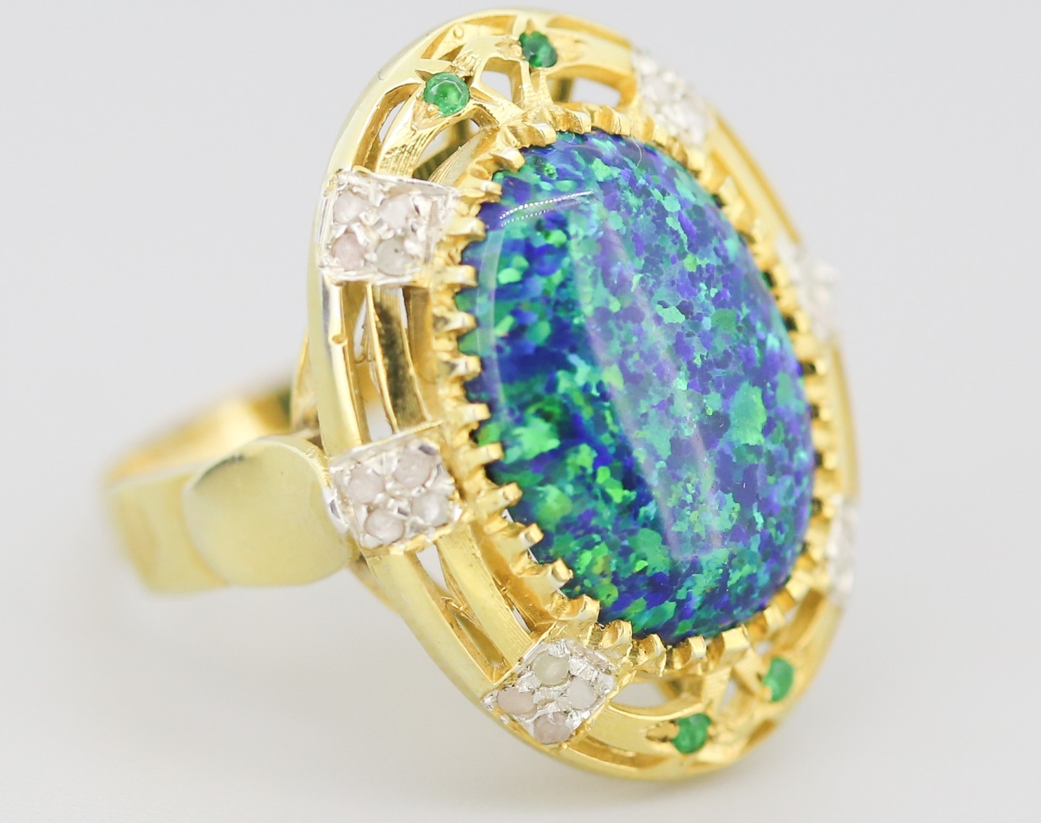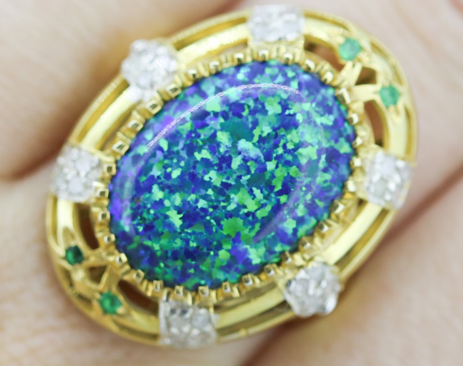 Finely Detailed Syntenic Opal Set Cocktail Ring with Further Diamond Insets Mounted in 9 Carat Yellow Gold Ring Size T and a Half