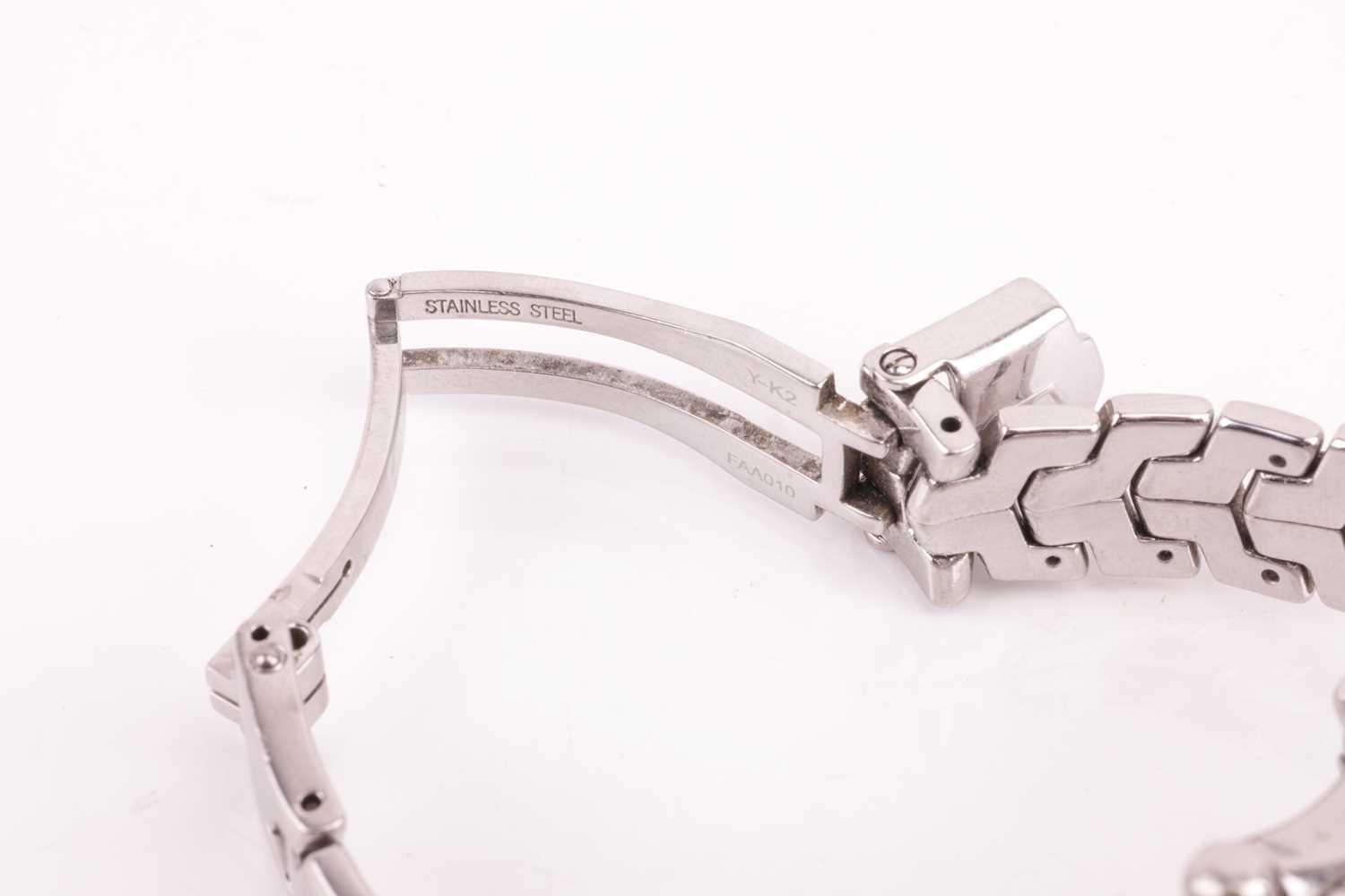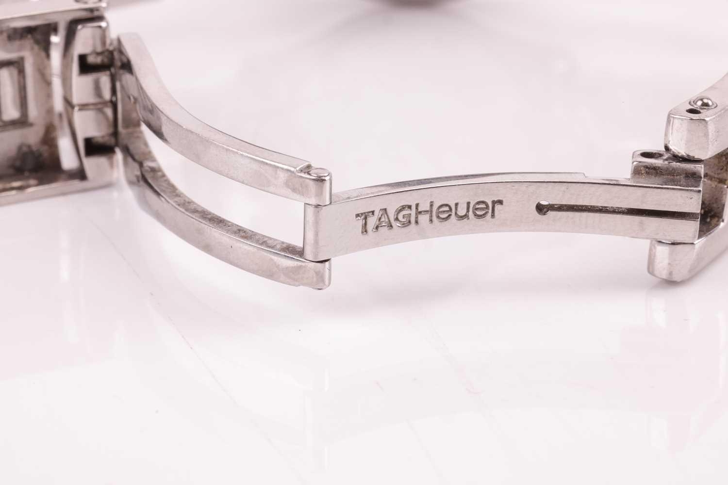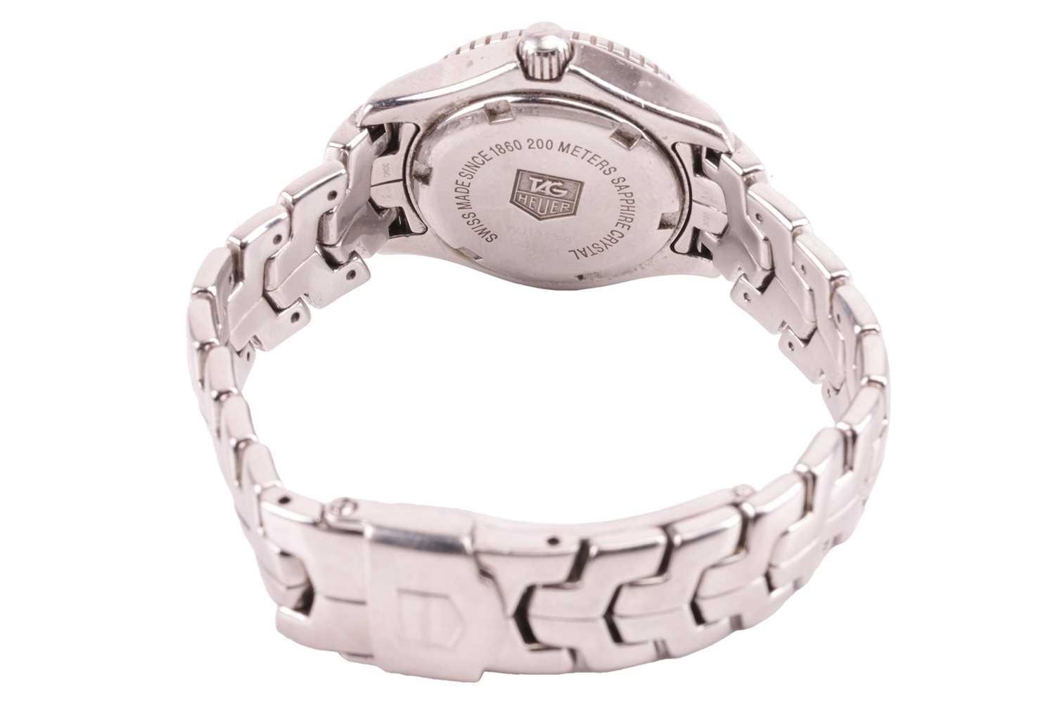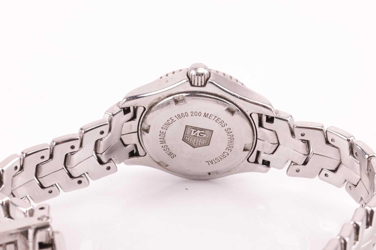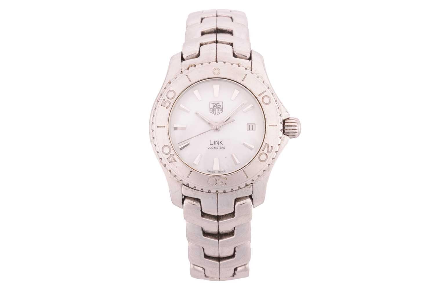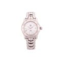 A Tag Heuer Link 200m Mother of Pearl dial lady's watch Model: WJ13130 Serial: GQ3294 Case Material: Steel Case diameter: 28mm Dial: Mother Of Pearl Numerals: Baton Movement: Quartz Functions: Date Strap: Steel Buckle: Folding Length of bracelet: 15cm Box: No Papers: No The watch appears to be in good working order, no long-term tests have been performed and accuracy cannot be guaranteed, a full service is advised on all watches and pocket watches once purchased. Surface scratches & wear consistent with age The online condition report may not mention mechanical replacements or imperfections to the movement, case, dial, pendulum, separate base(s) or dome. Watches with water-resistant cases may have been opened to examine movements, but no warranties are given regarding their water resistance. It is also important to note that we cannot guarantee the authenticity or originality of individual components, such as wheels, hands, crowns, crystals, screws, bracelets, and wrist bands, since subsequent repairs and restoration may have changed the original components. Also, we cannot guarantee the authenticity or originality of any engraving or re-engraving on watch cases, case backs, bracelets, straps or internal movements