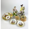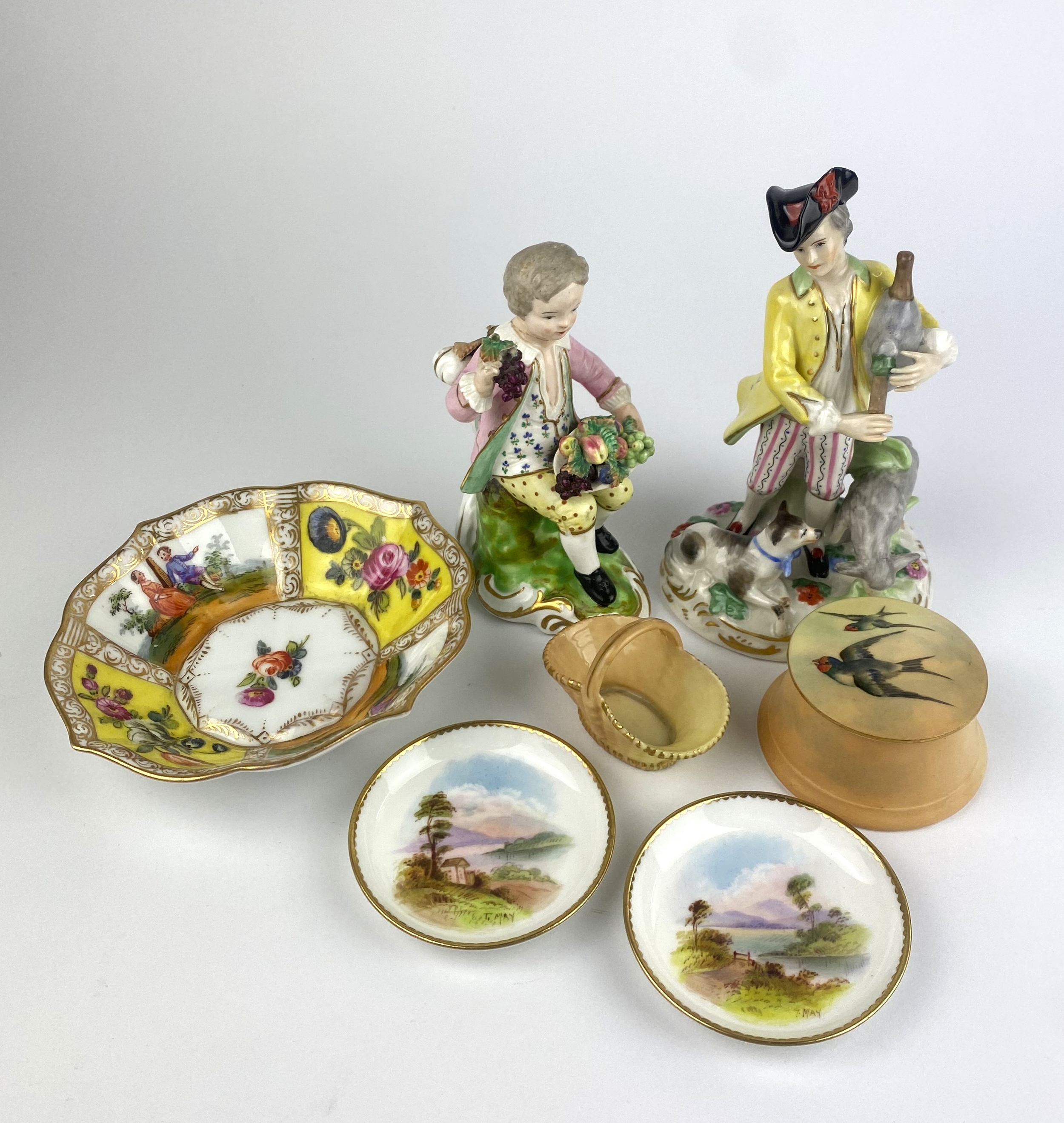 A Royal Worcester porcelain blush ivory trinket pot and cover decorated with swallows and a miniature basket, together with an Augustus Rex style saucer, a pair of Crown Staffordshire pin dishes decorated with scenic views, and two porcelain figures (a/f)