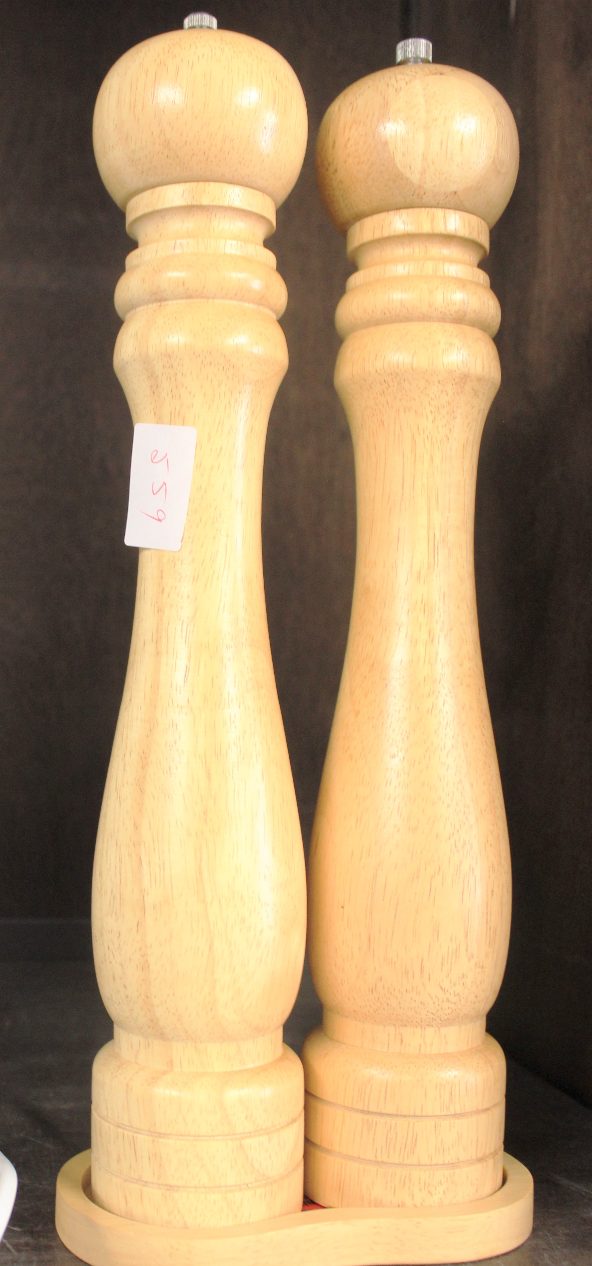 Two Tall Wooden Salt & Pepper Grinders on Matching Stand