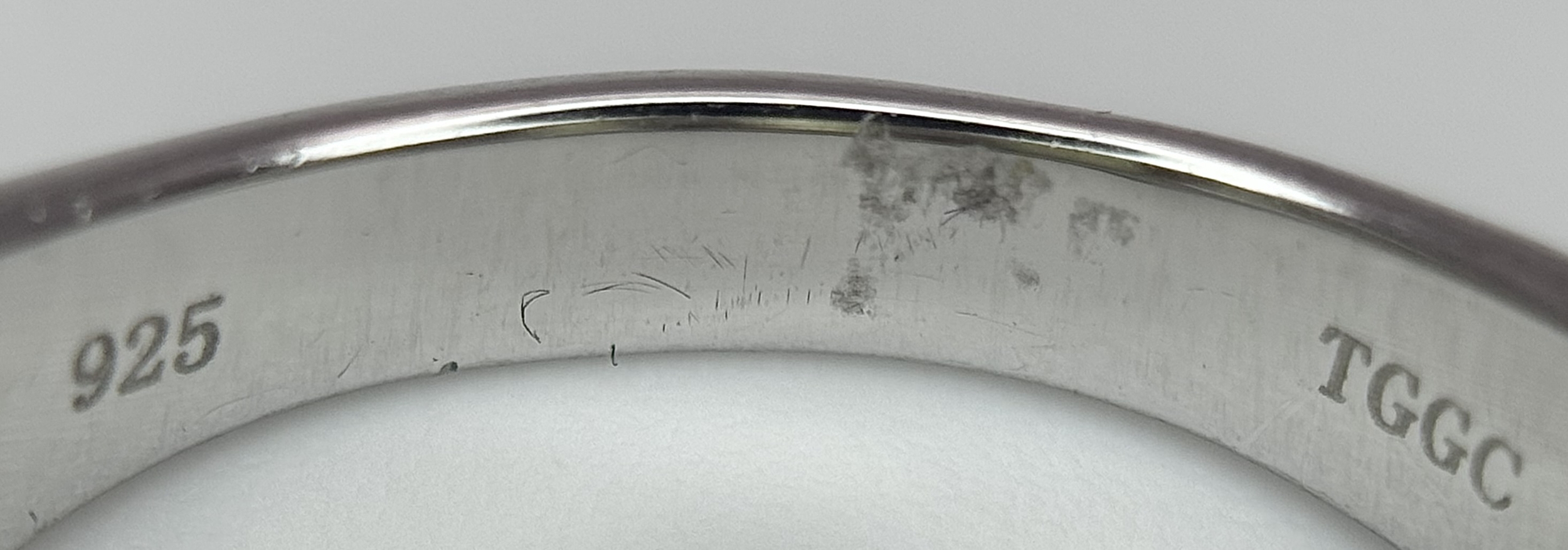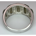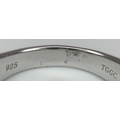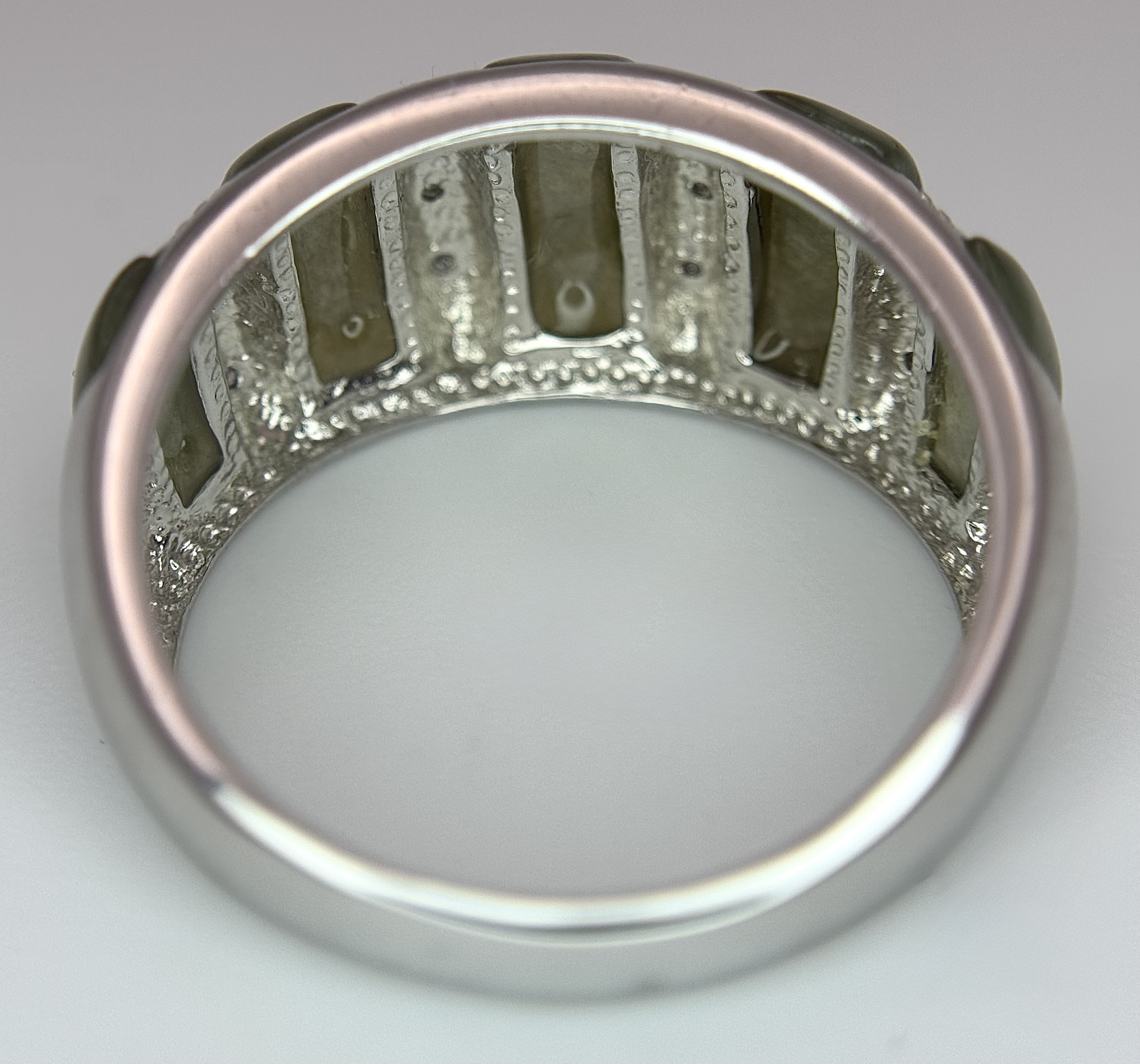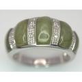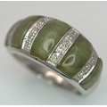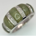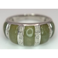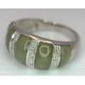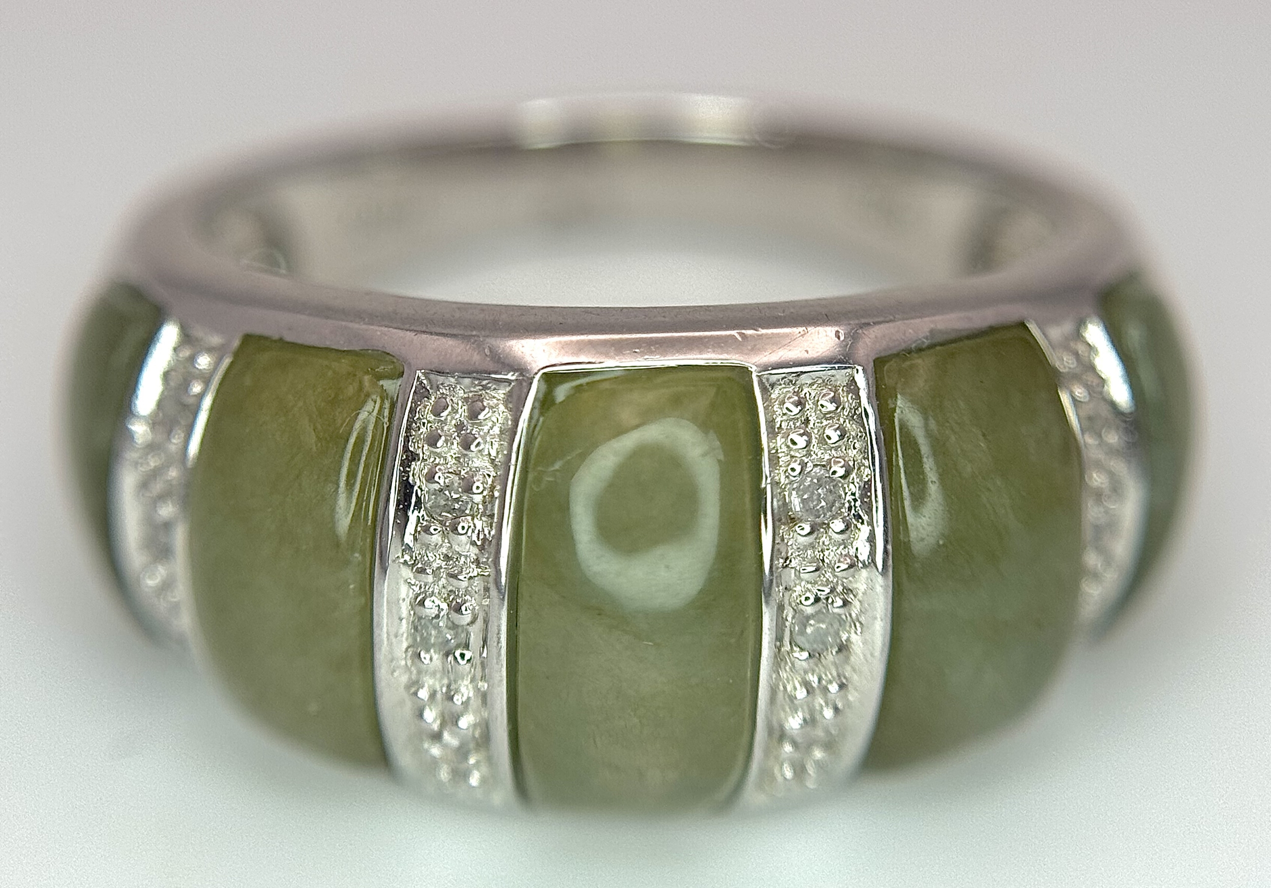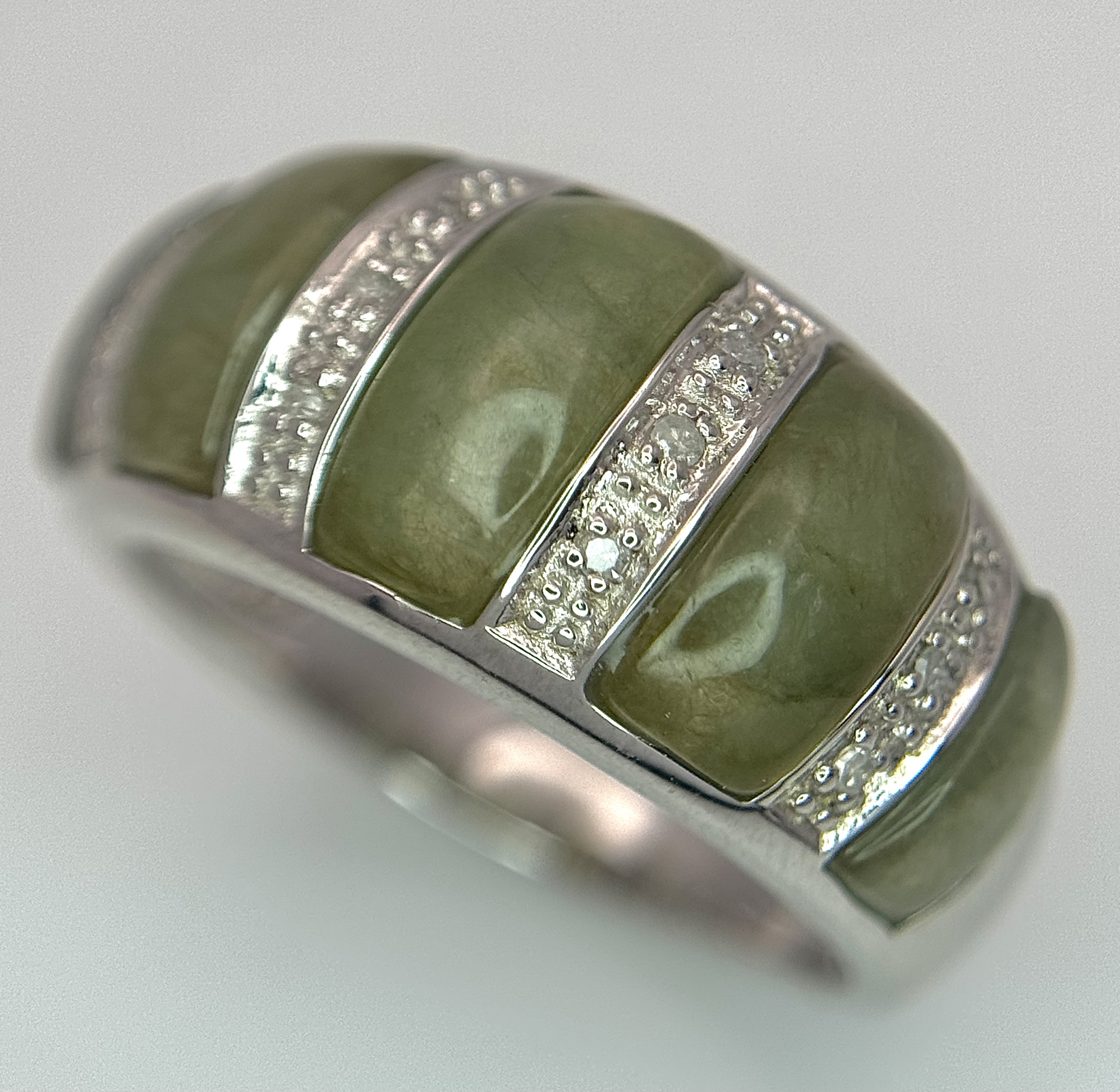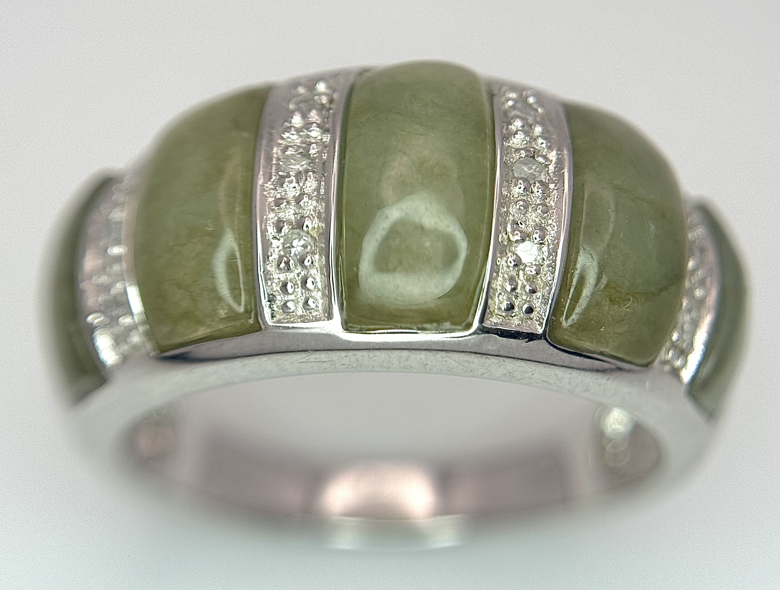 An Attractive Sterling Silver Jade and Diamond Ring Size P. The Ring is set with five graduating size Jade, with the centre largest stone measuring 1cm Length and with Twelve Round Cut Diamonds (Gross Diamond weight approximately 0.06 Carat). Gross weight 5 Grams.