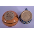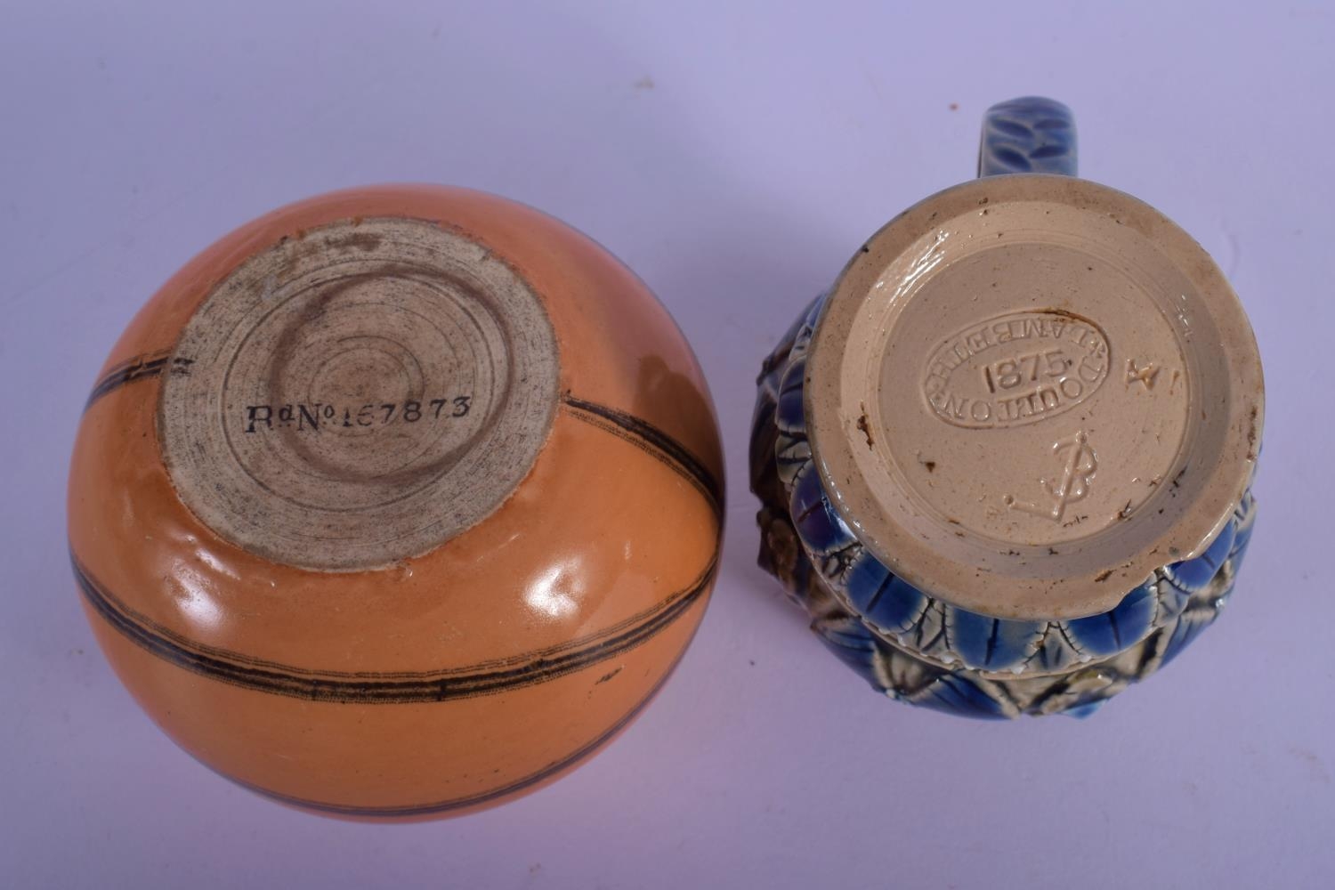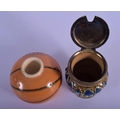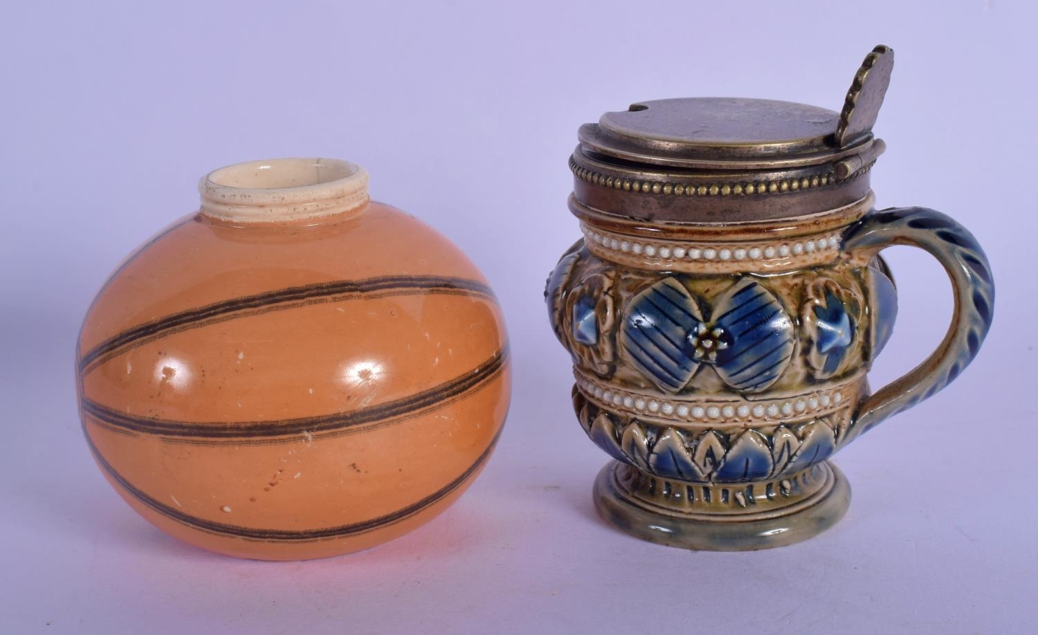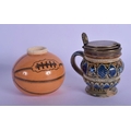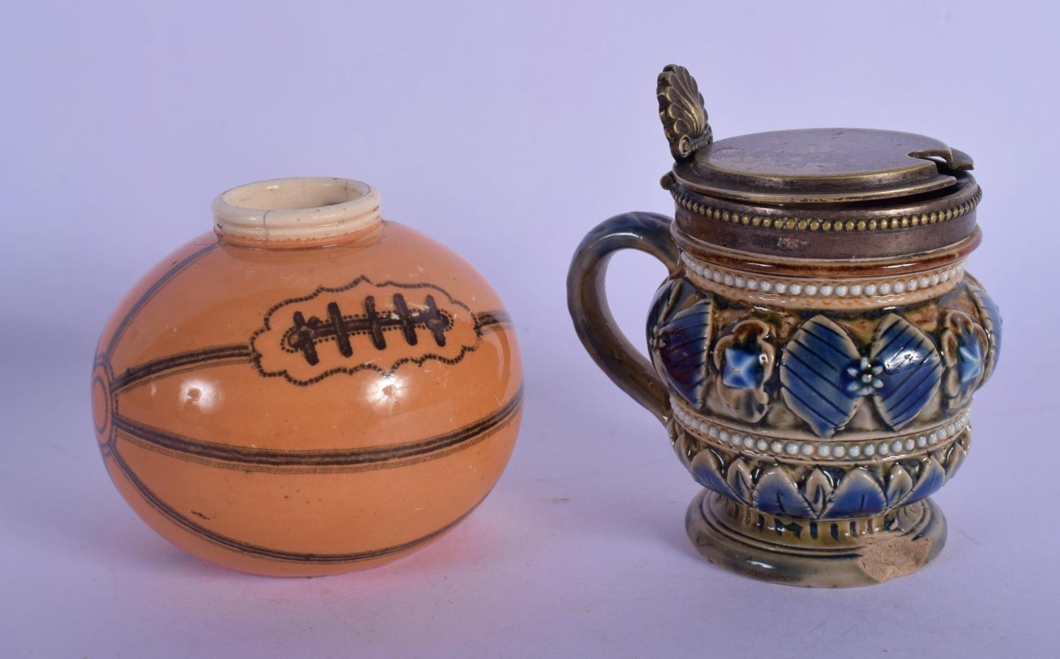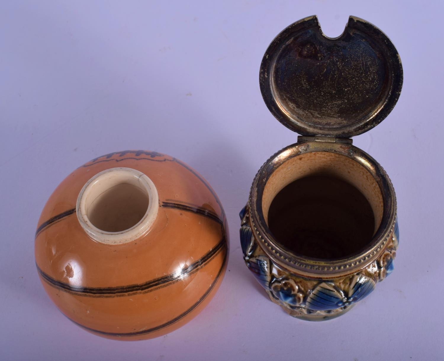A RARE ANTIQUE MACINTYRE SPORTS BALL INKWELL together with a Doulton Lambeth cruet. Largest 6.5 cm wide. (2)