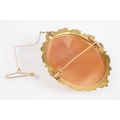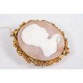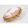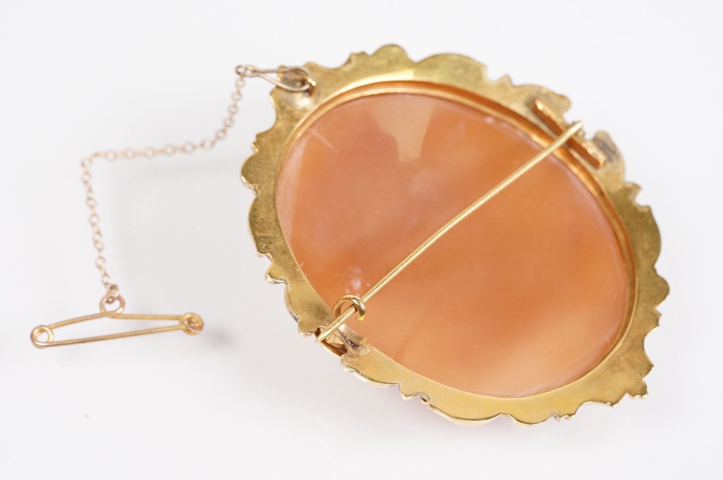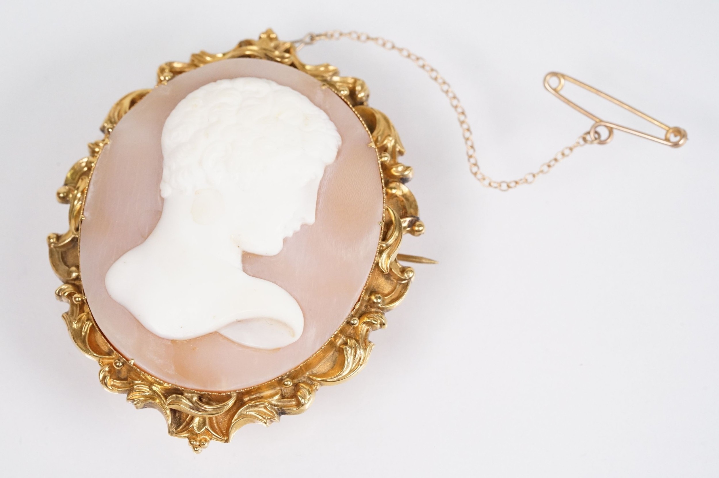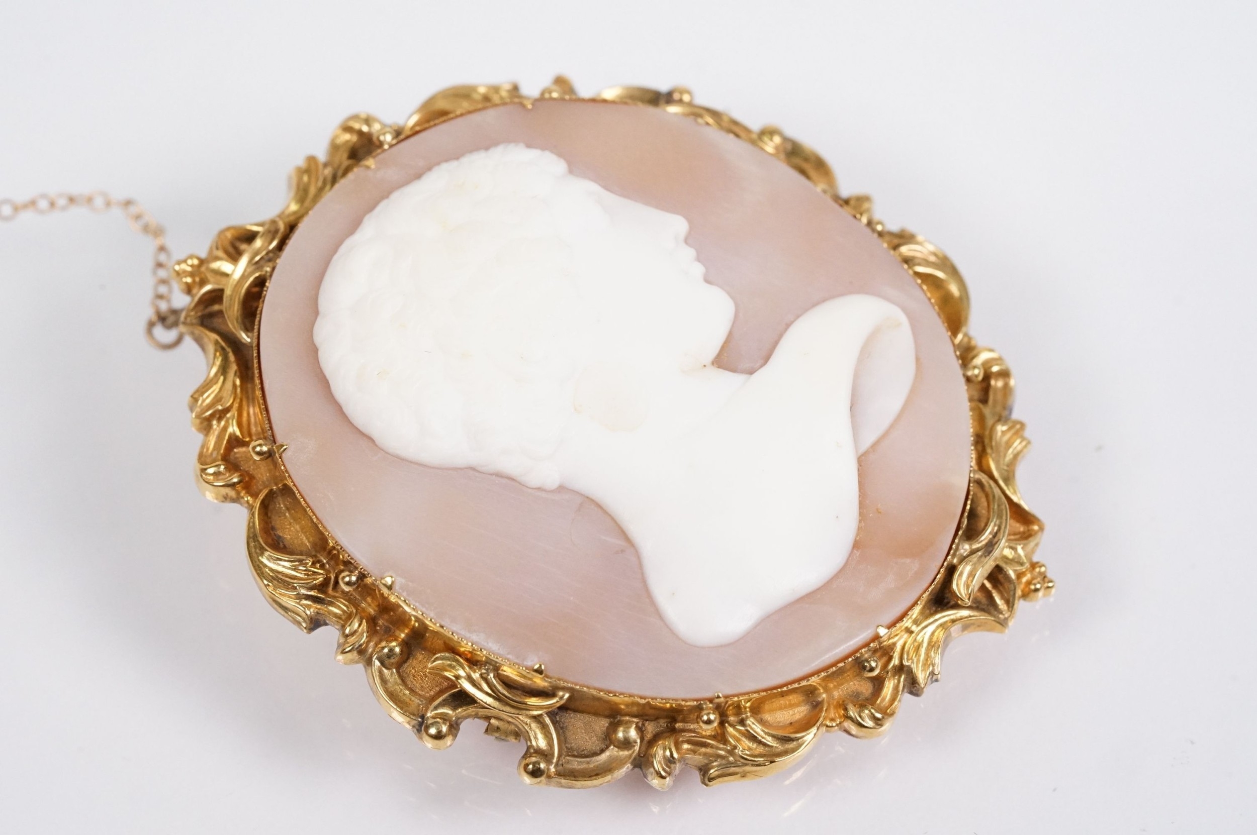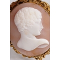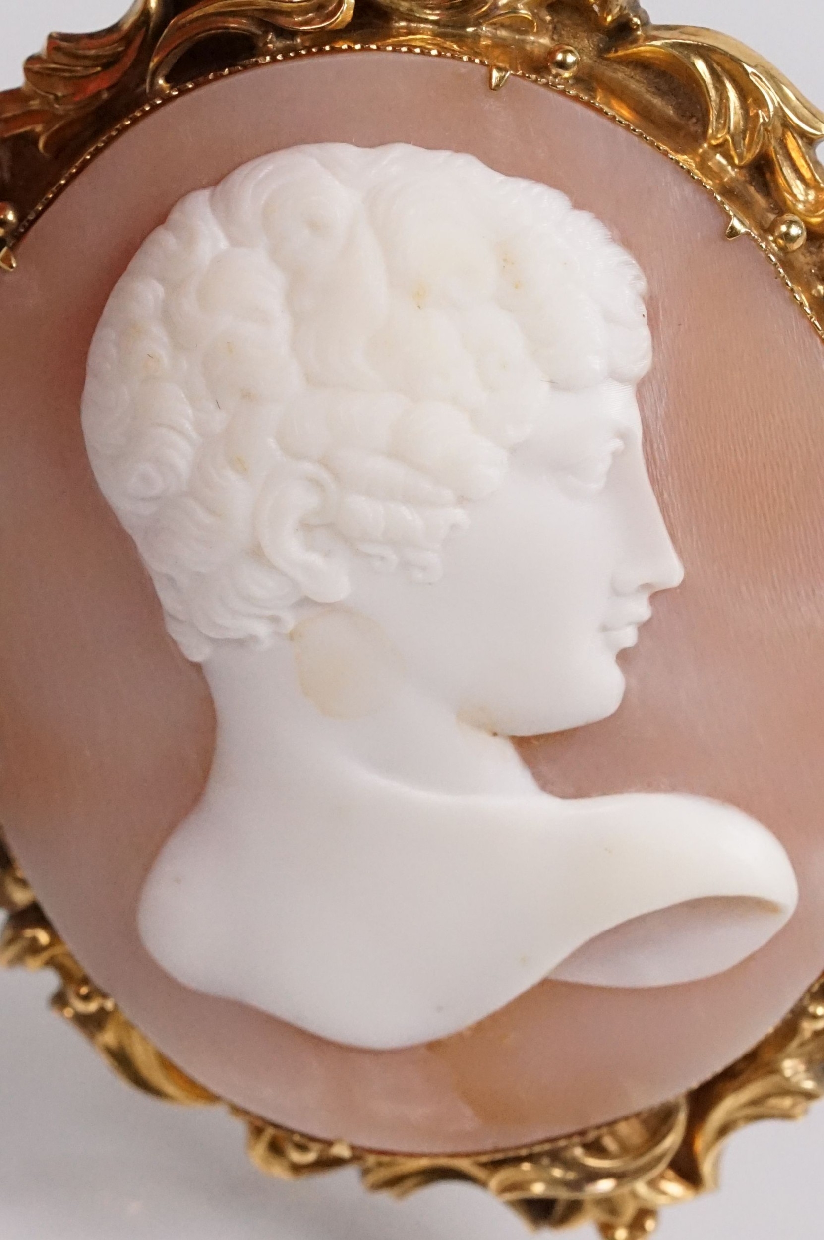19th Century Victorian carved conch shell cameo featuring a male right facing portrait set within a yellow metal mount with scrolled details. Hinge pin and c clasp to verso. Measures 6cm tall.