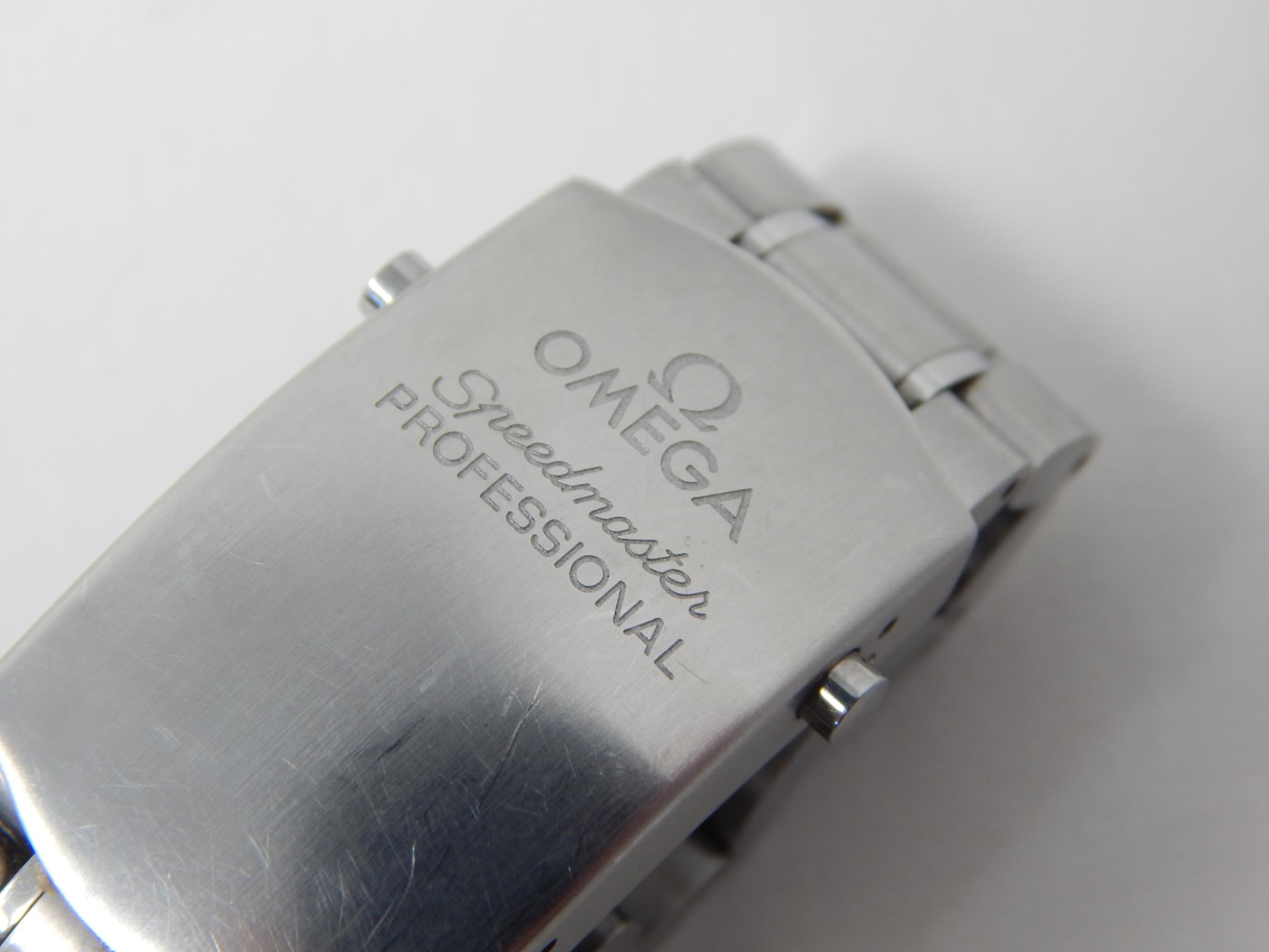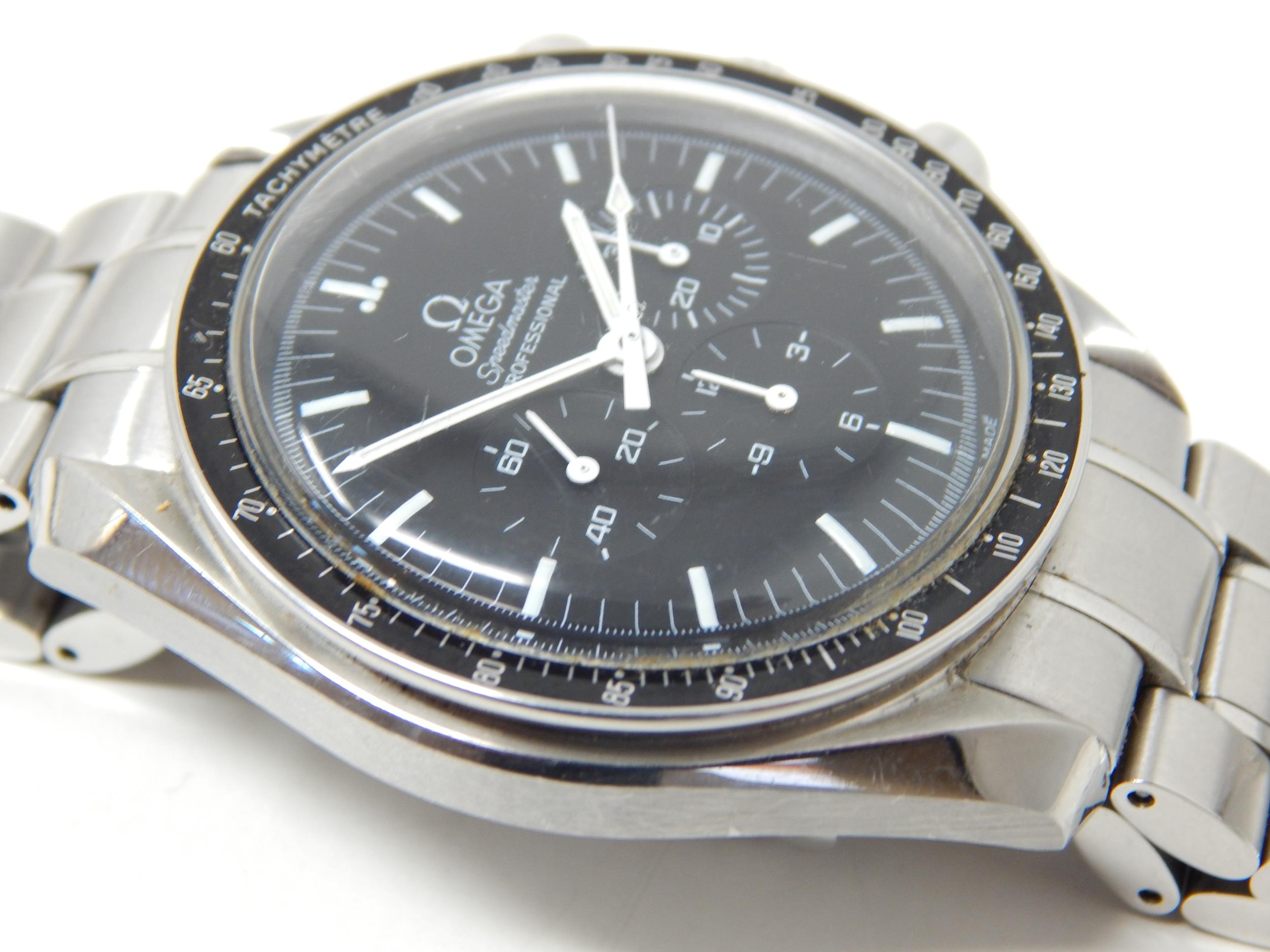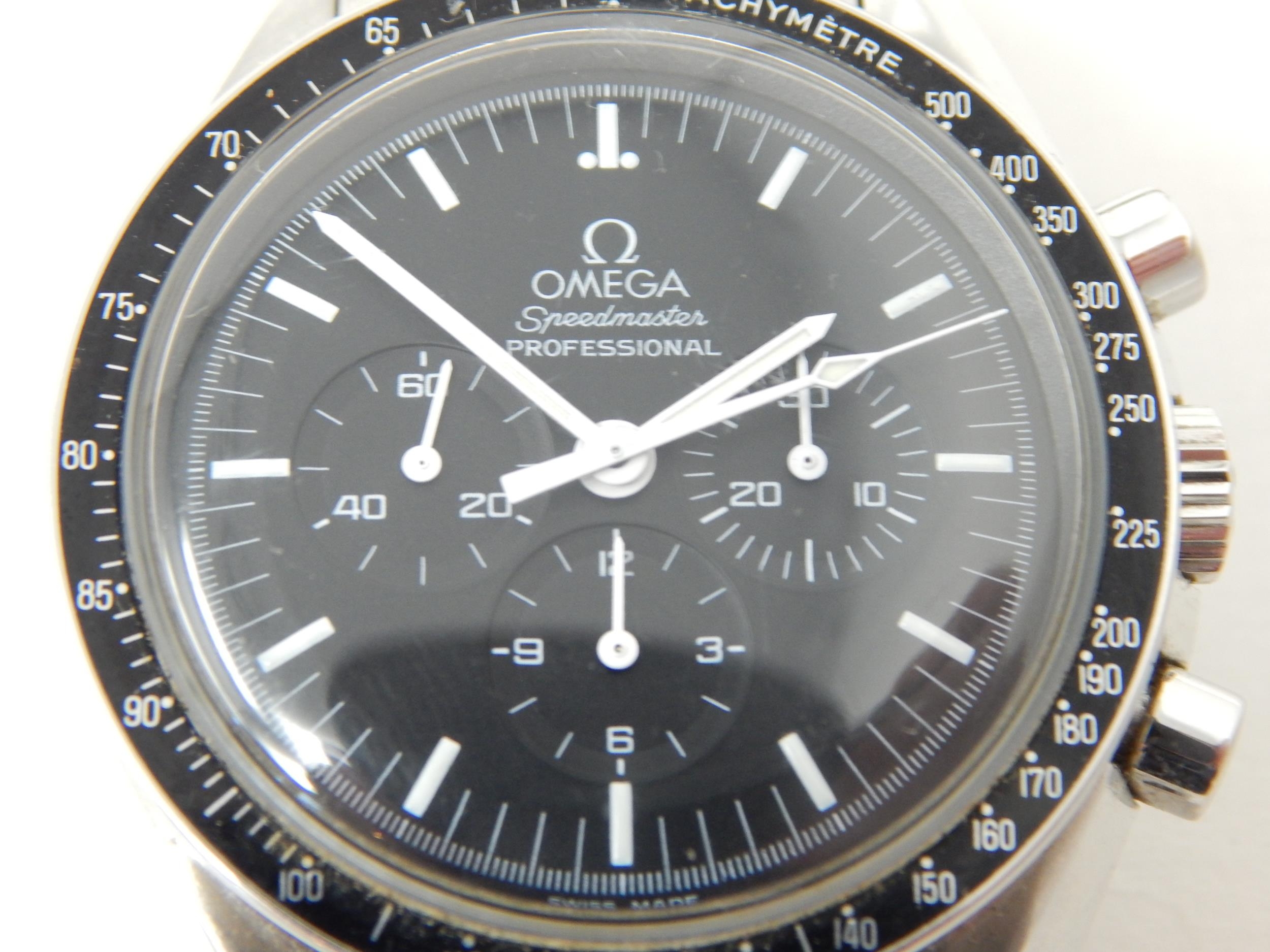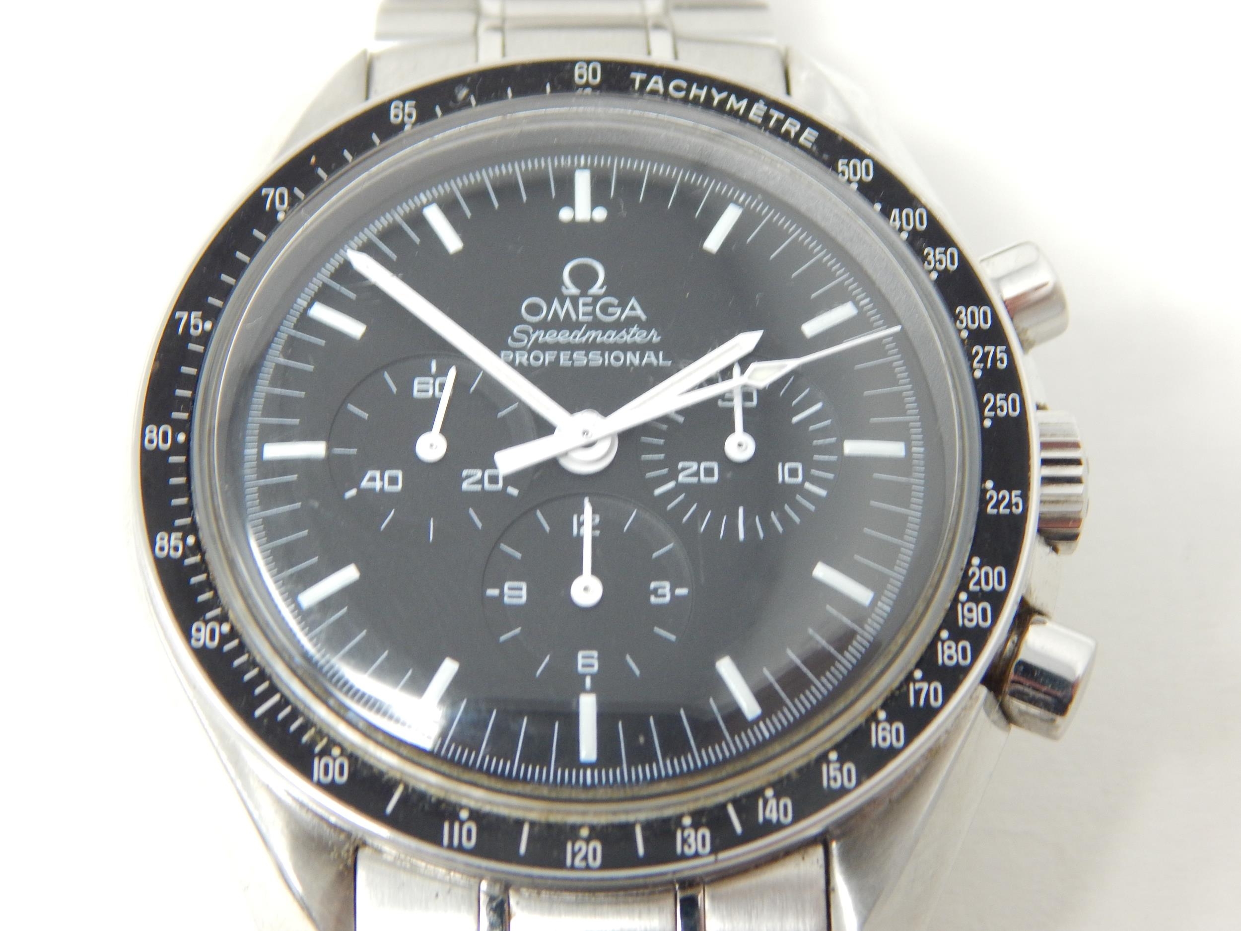 An Omega Speedmaster Professional 'Moon Watch' stainless steel chronograph bracelet watch, Purchased 2009, ref 35705000, manual wind cal. 861 movement signed Omega, 42mm, screw back case with Speedmaster emblem embossed with NASA moon landing tribute, 'Flight-Qualified by NASA for all Manned Space Missions The First Watch Worn on the Moon', signed black dial with luminous batons and hands, black tachymetre bezel, Omega crown, Omega Speedmaster Professional bracelet: Complete with Warranty Card, Original Receipt, Wallet, Instruction Manual & Tag. Working When Catalogued.