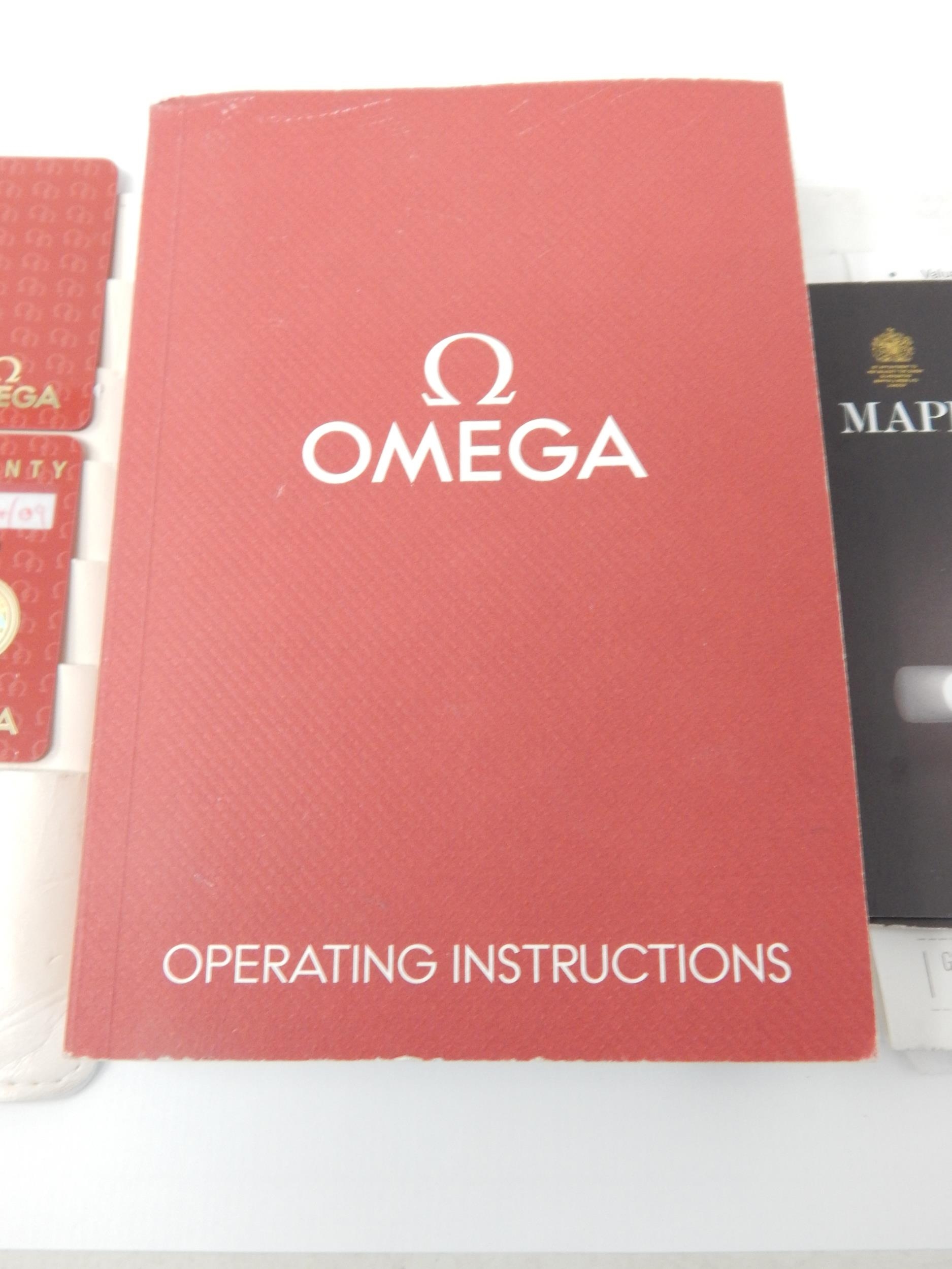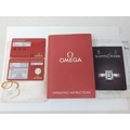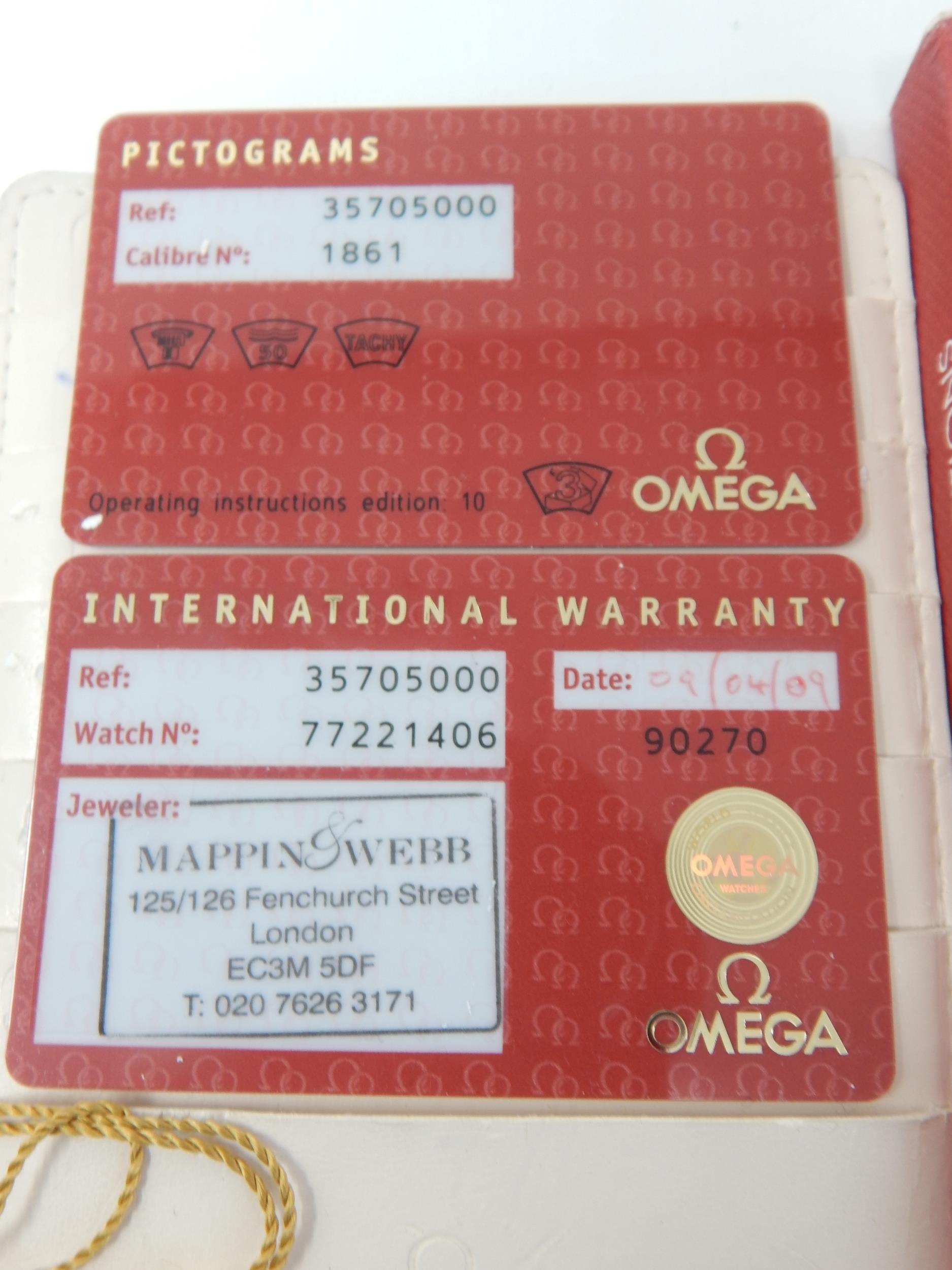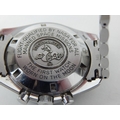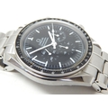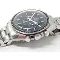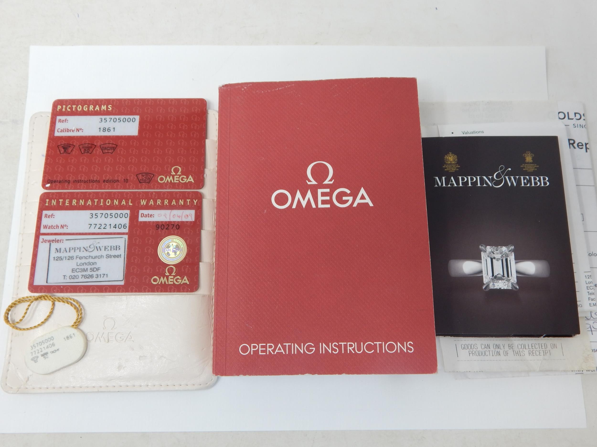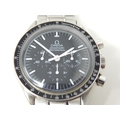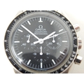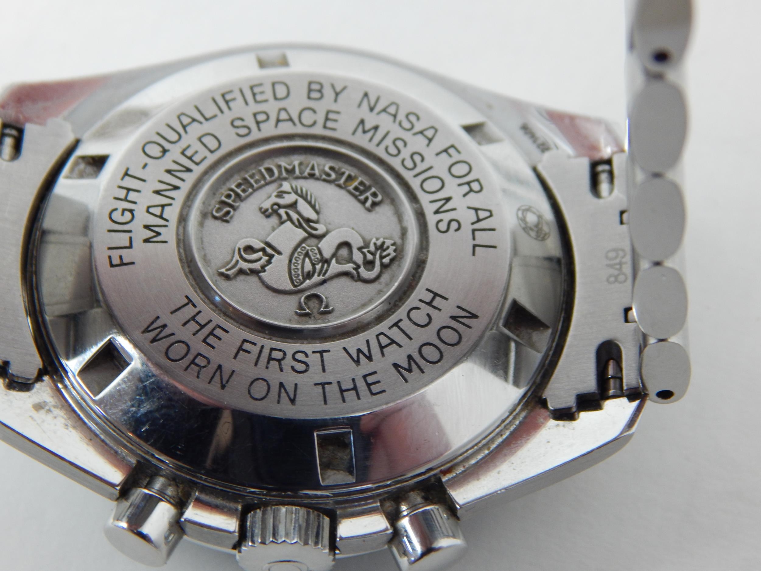 An Omega Speedmaster Professional 'Moon Watch' stainless steel chronograph bracelet watch, Purchased 2009, ref 35705000, manual wind cal. 861 movement signed Omega, 42mm, screw back case with Speedmaster emblem embossed with NASA moon landing tribute, 'Flight-Qualified by NASA for all Manned Space Missions The First Watch Worn on the Moon', signed black dial with luminous batons and hands, black tachymetre bezel, Omega crown, Omega Speedmaster Professional bracelet: Complete with Warranty Card, Original Receipt, Wallet, Instruction Manual & Tag. Working When Catalogued.