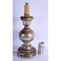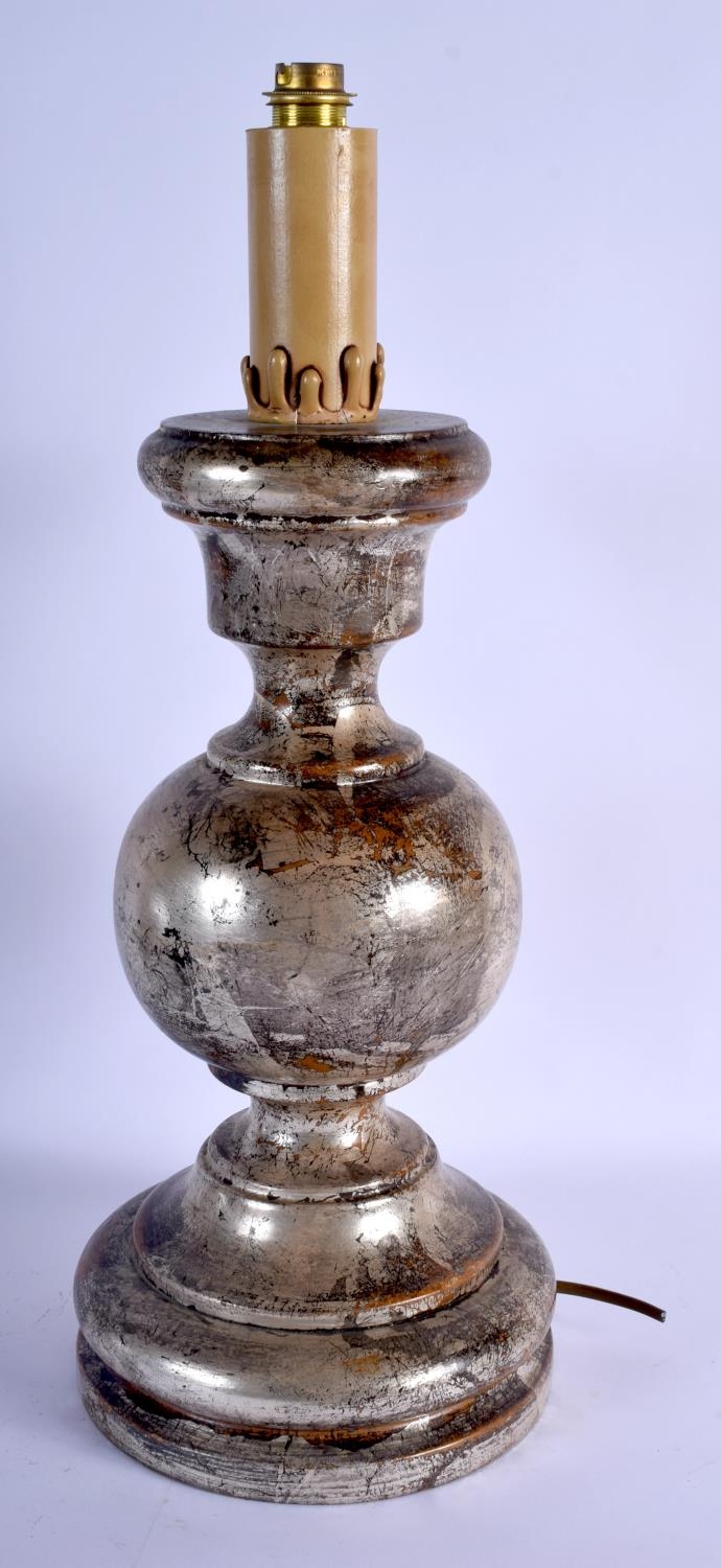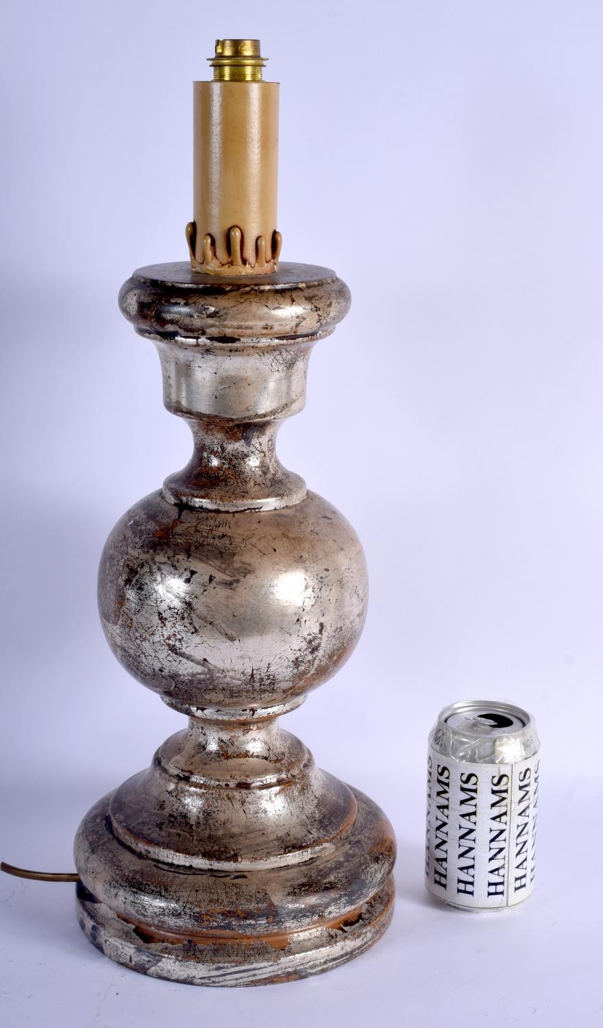 AN ANTIQUE SILVERED CONTINENTAL WOOD CANDLESTICK LAMP. 49 cm high.