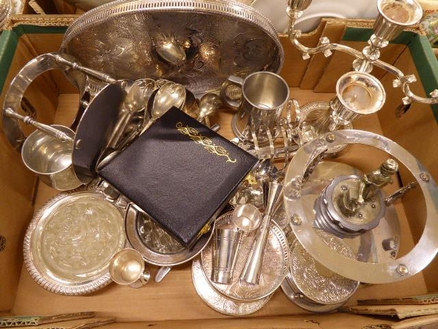Silver plated bottle stands, candelabra, coasters, tray, cutlery, spirit measures, blacksmith figures etc