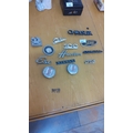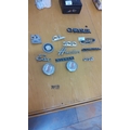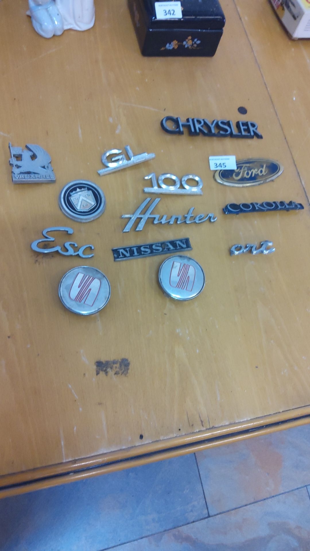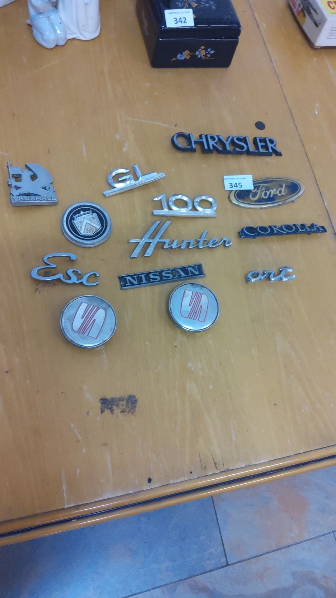 Collection of vintage car badges and emblems, featuring brands like Chrysler, Ford, Nissan, Vauxhall, and Toyota Corolla. Metal construction with varied styles.