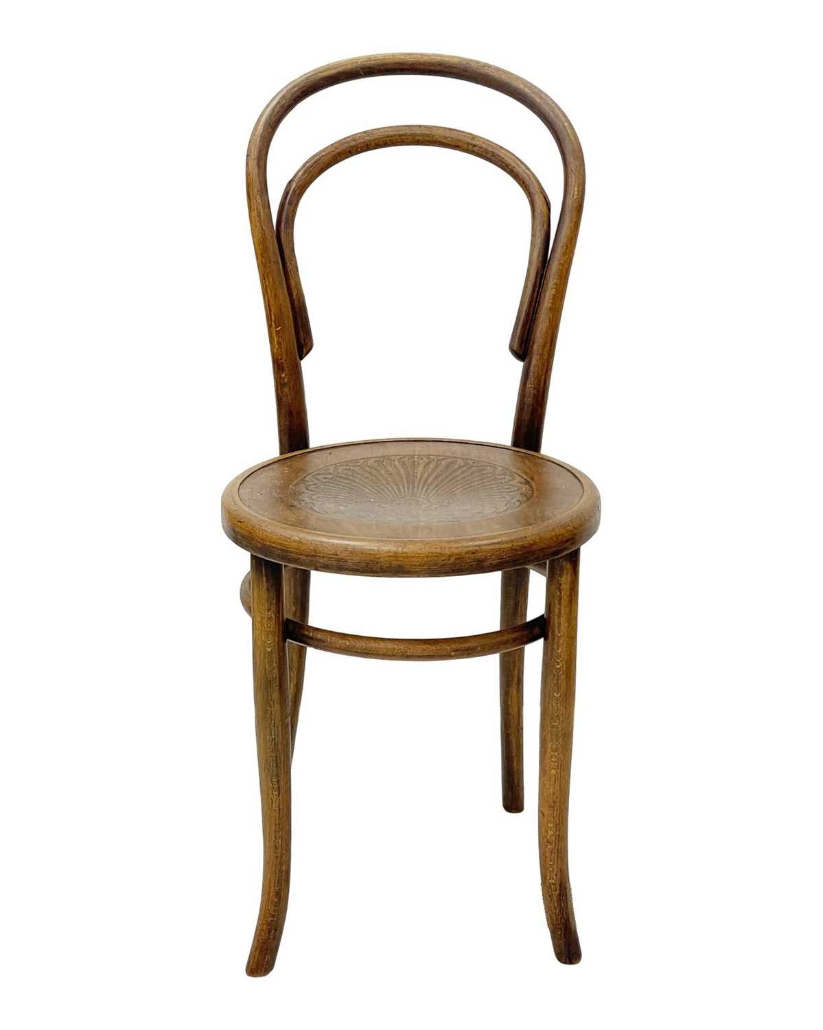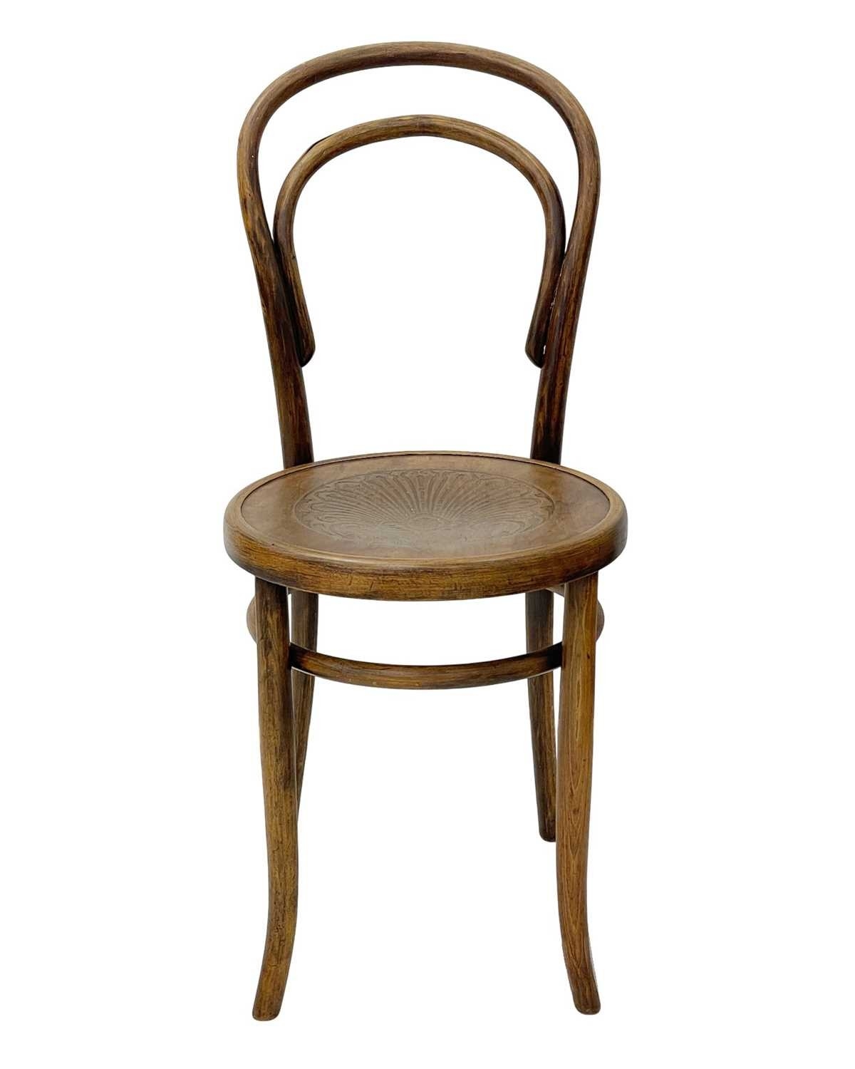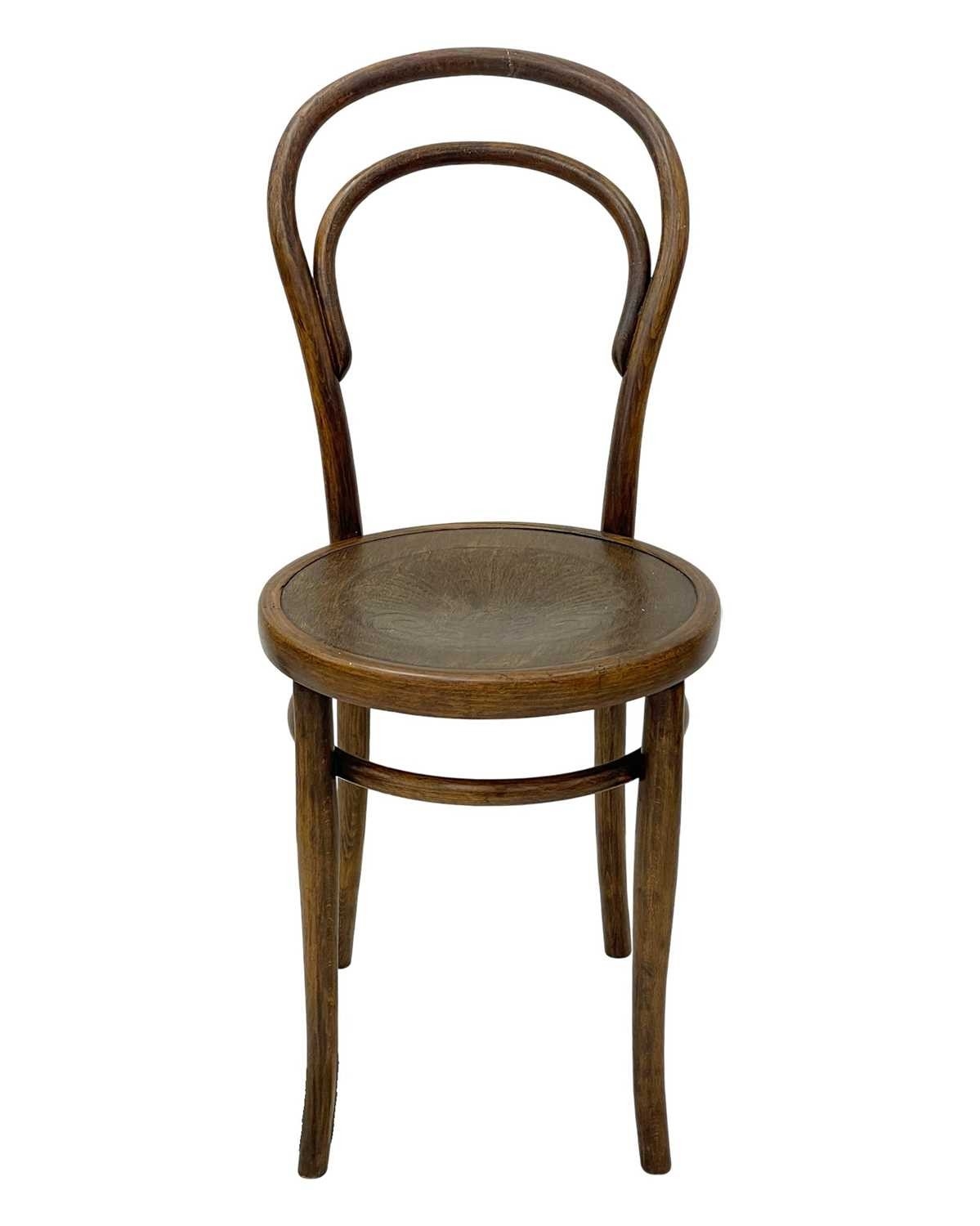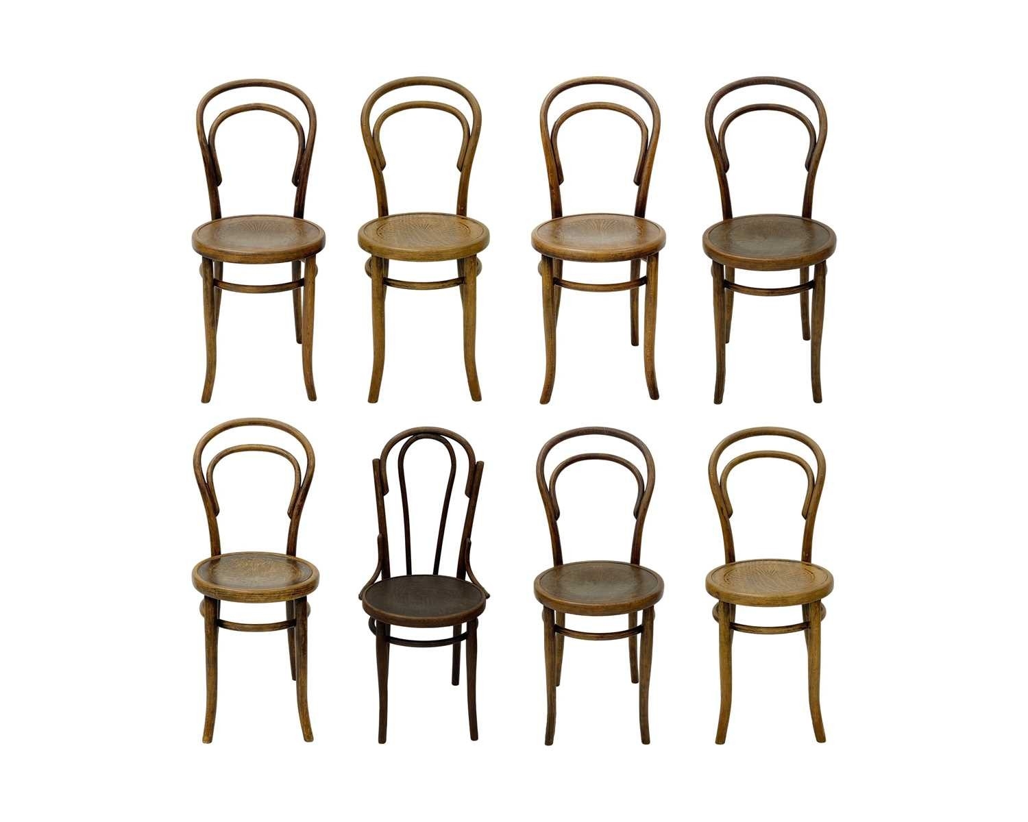 A set of seven bentwood bistro chairs. Thonet style, early 20th century, with double hoop backs and anthemeon stamped circular seats, height 89cm, width 44cm, depth 45cm, together with one other similar chair (8).