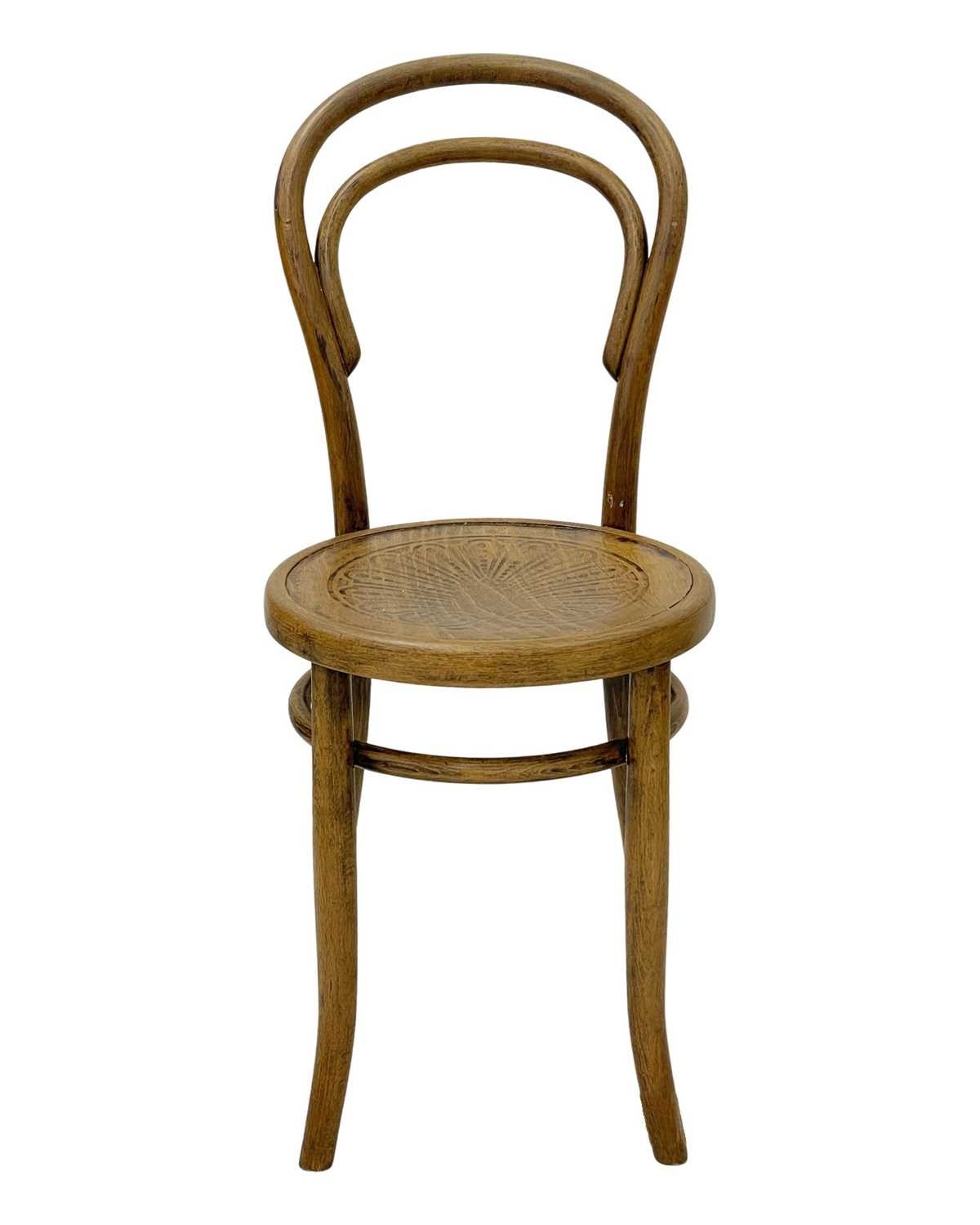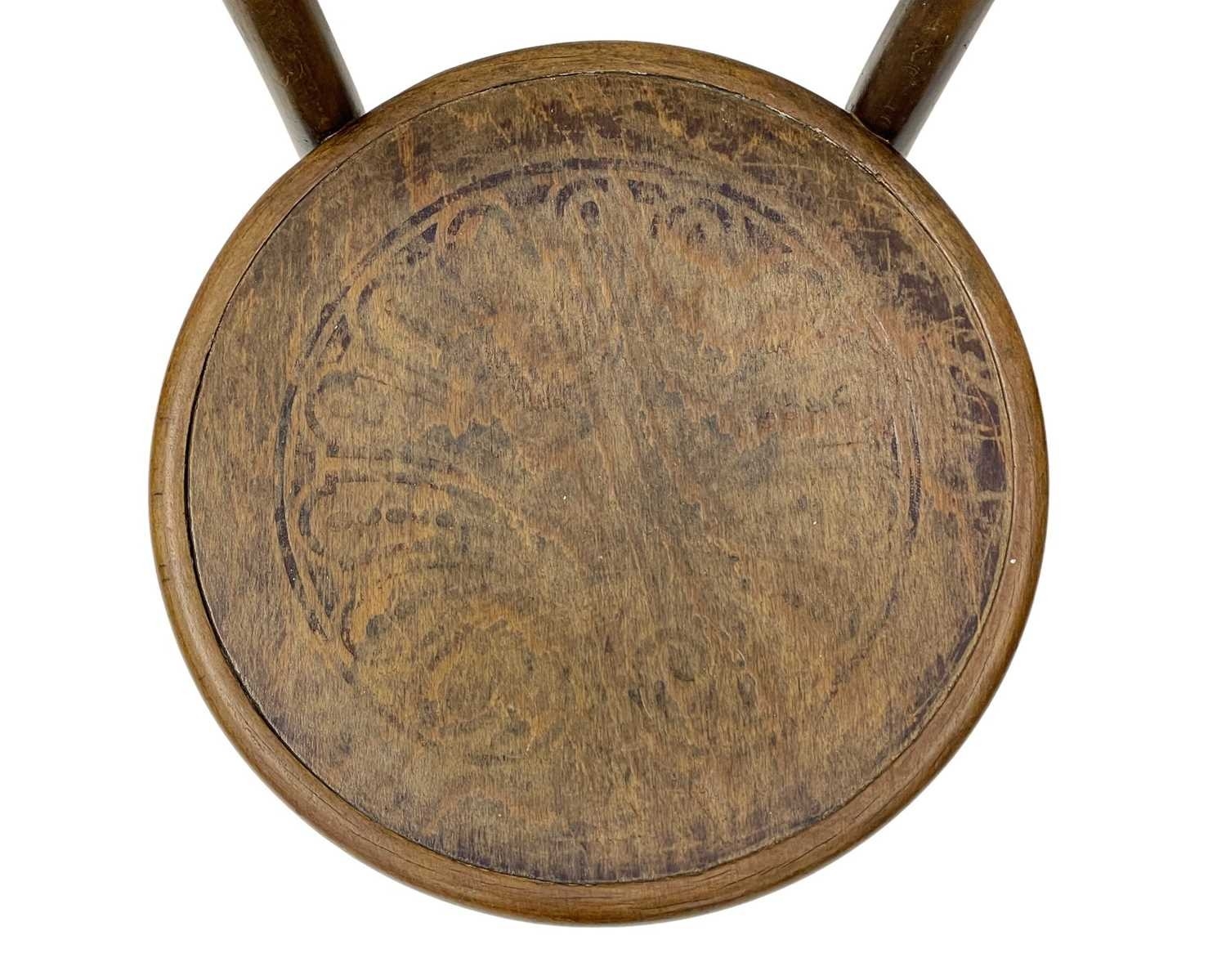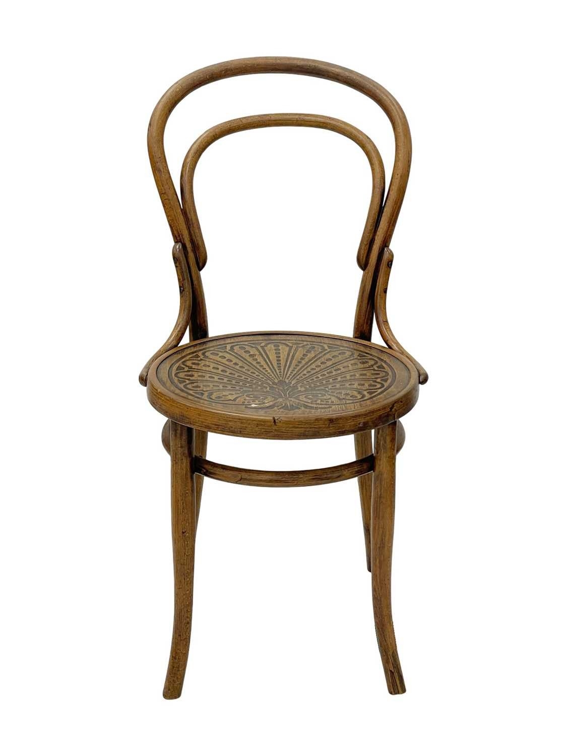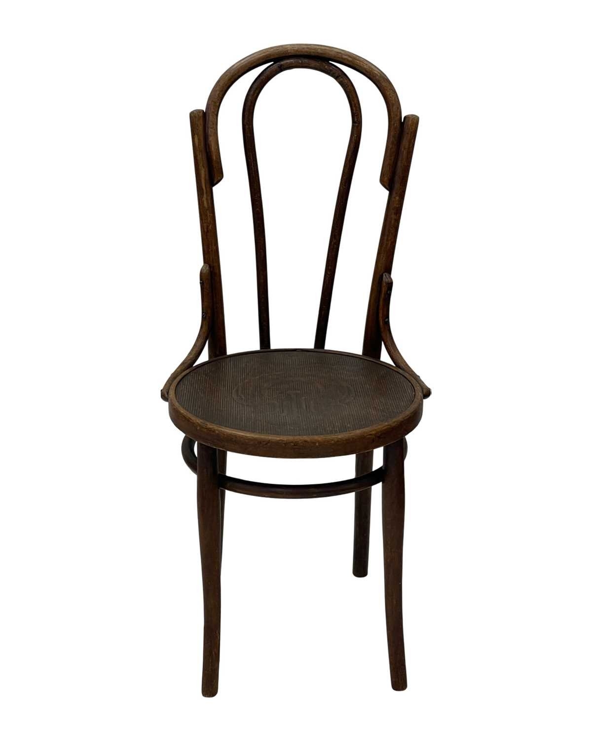 A set of seven bentwood bistro chairs. Thonet style, early 20th century, with double hoop backs and anthemeon stamped circular seats, height 89cm, width 44cm, depth 45cm, together with one other similar chair (8).