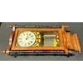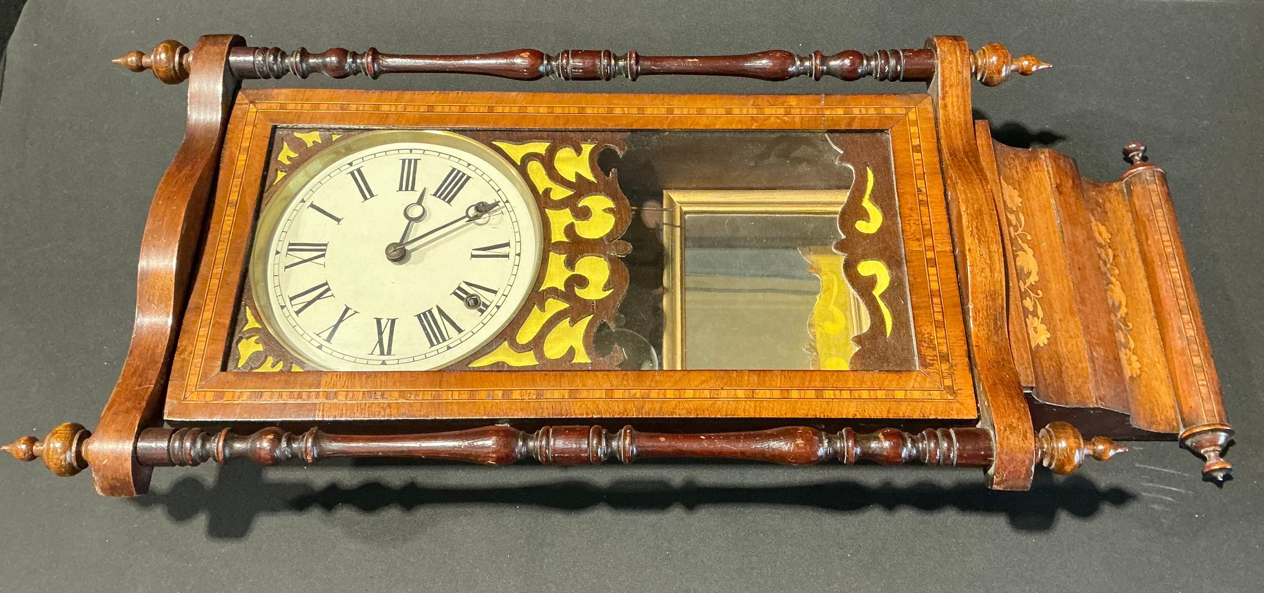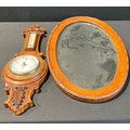 A 19th century American walnut drop-dial wall clock, 89cm high; an early 20th century carved oak wall barometer; an oak oval looking glass, bevelled mirror plate, 69cm high (3)