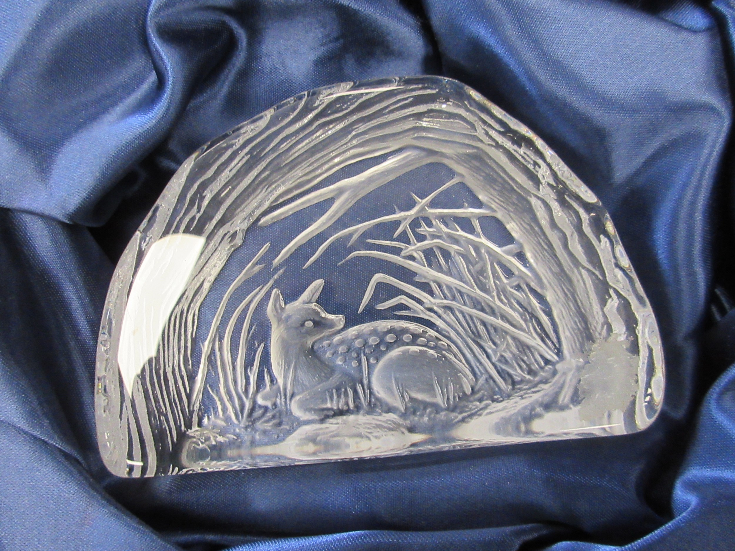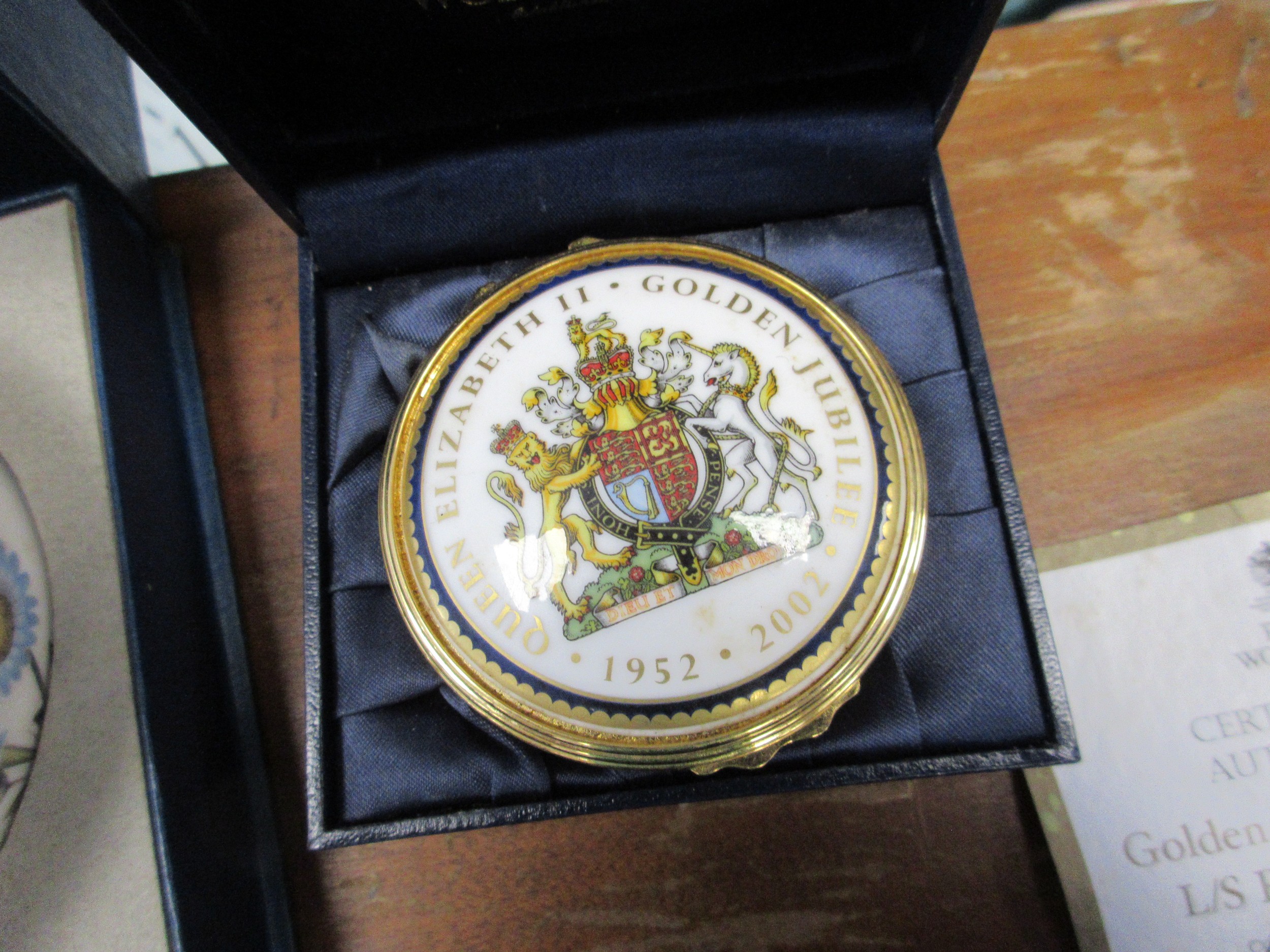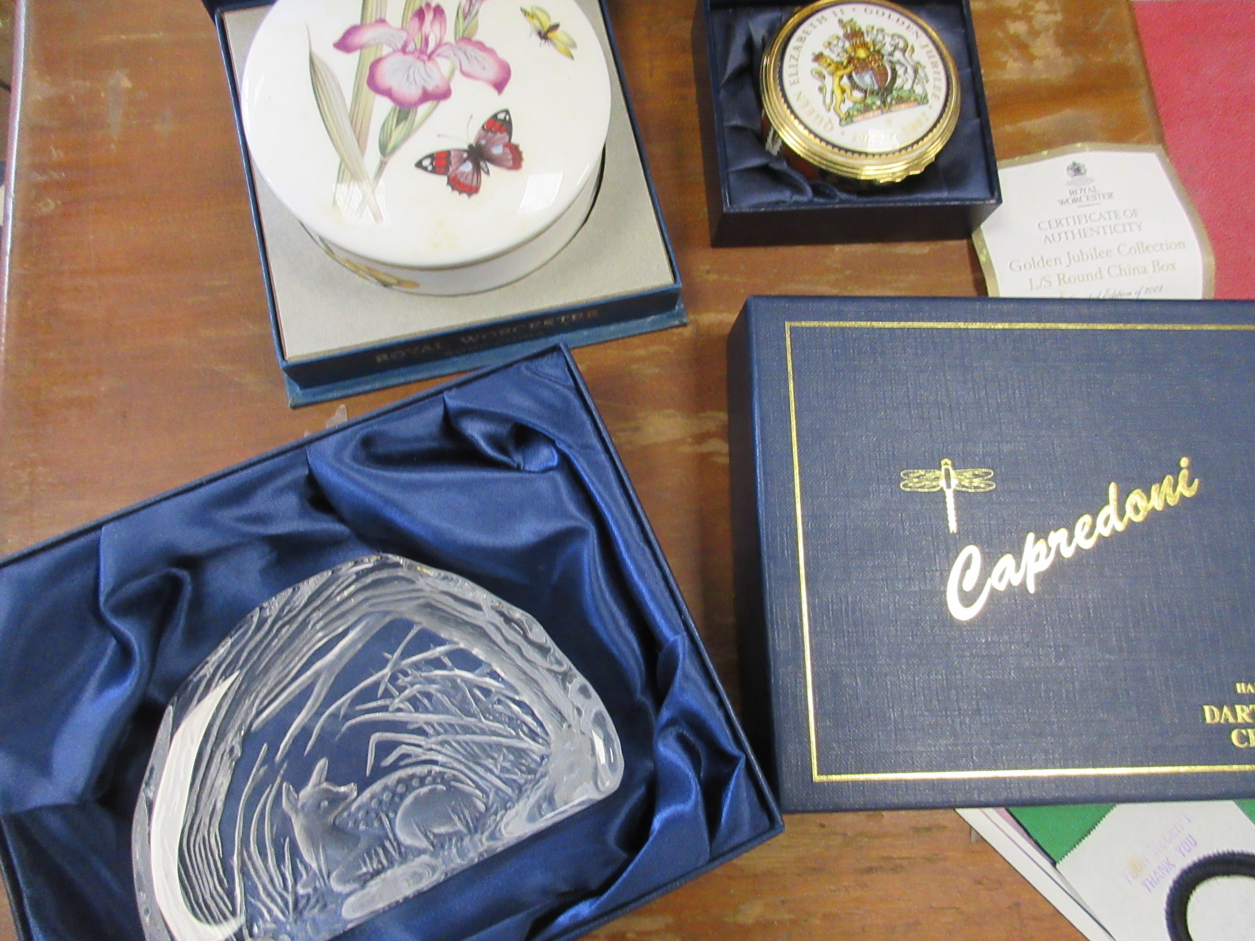 Two china boxes and a crystal paperweight - a Royal Worcester L/S Round China box to celebrate QEII Golden Jubilee limited edition 376/2002 with certificate. A Royal Worcester bone china round jar decorated with butterflies and flowers. An Alfred Capredoni Dartington Crystal fawn iceberg paperweight C10011.