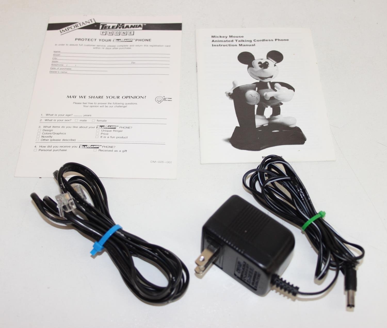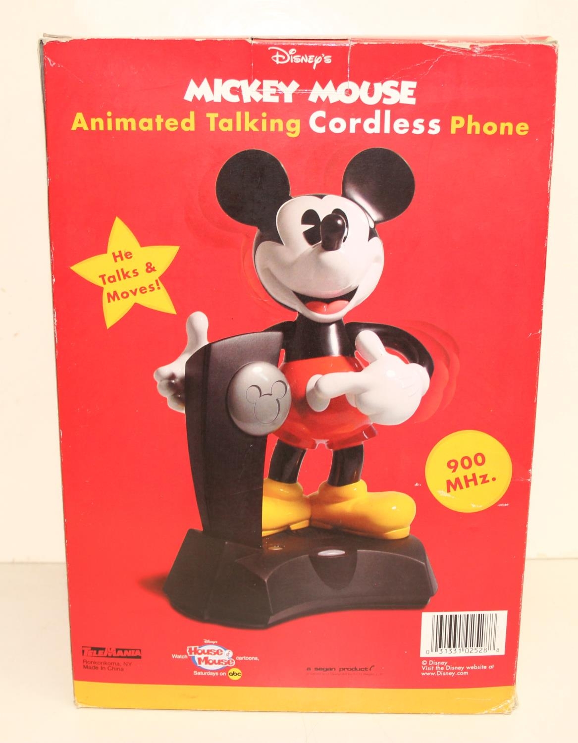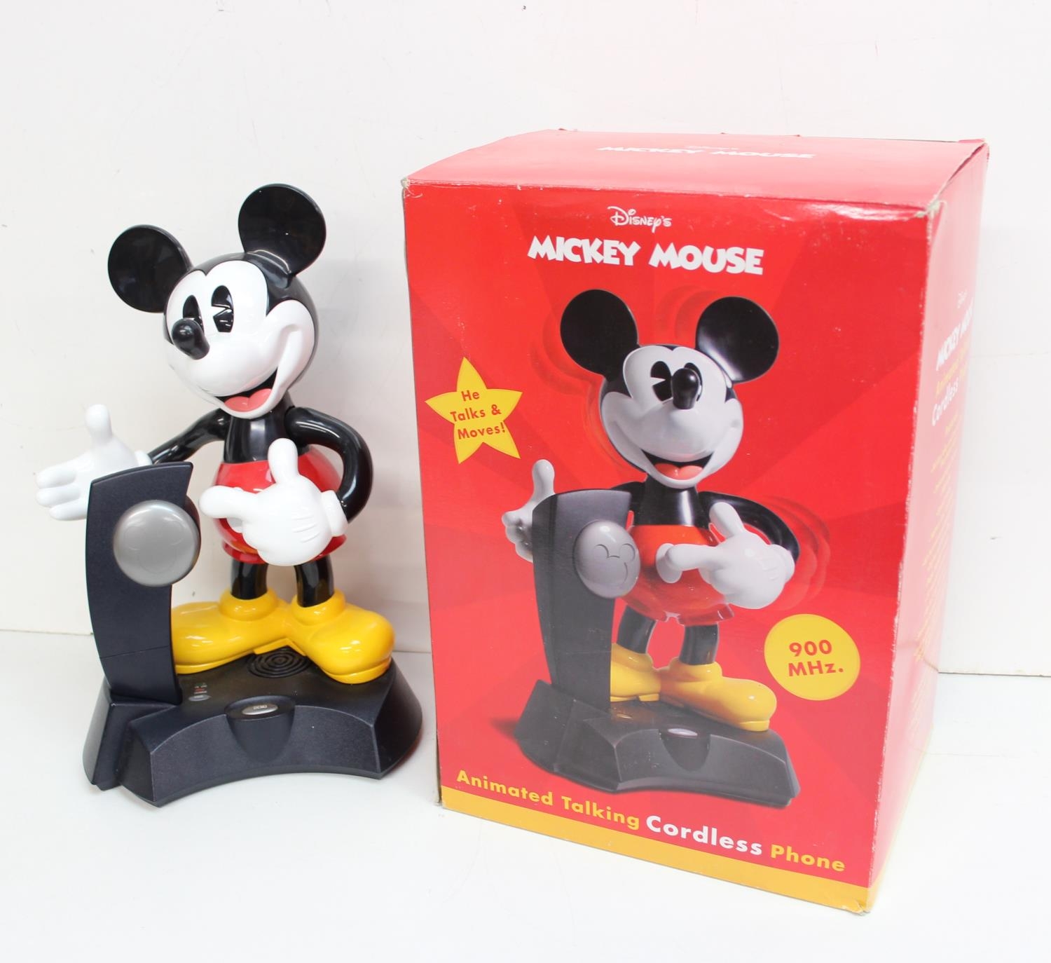 Retro Mickey Mouse animated talking cordless phone, complete with box and manual. Manufactured by Telemania for Disney, box 27cm x 21cm x 39cm