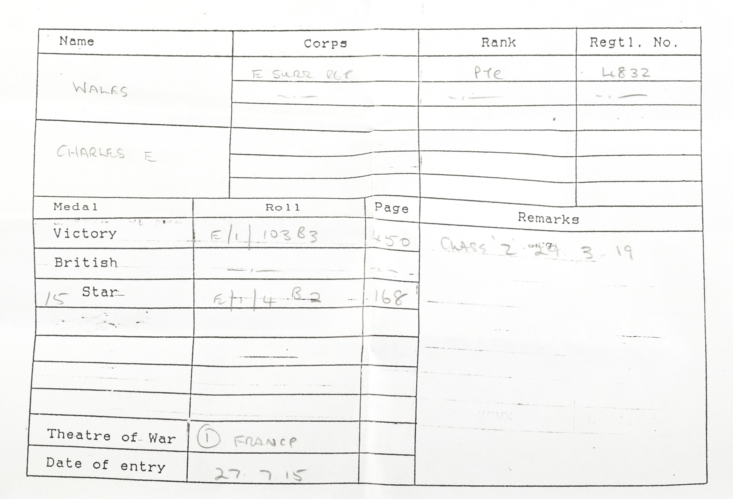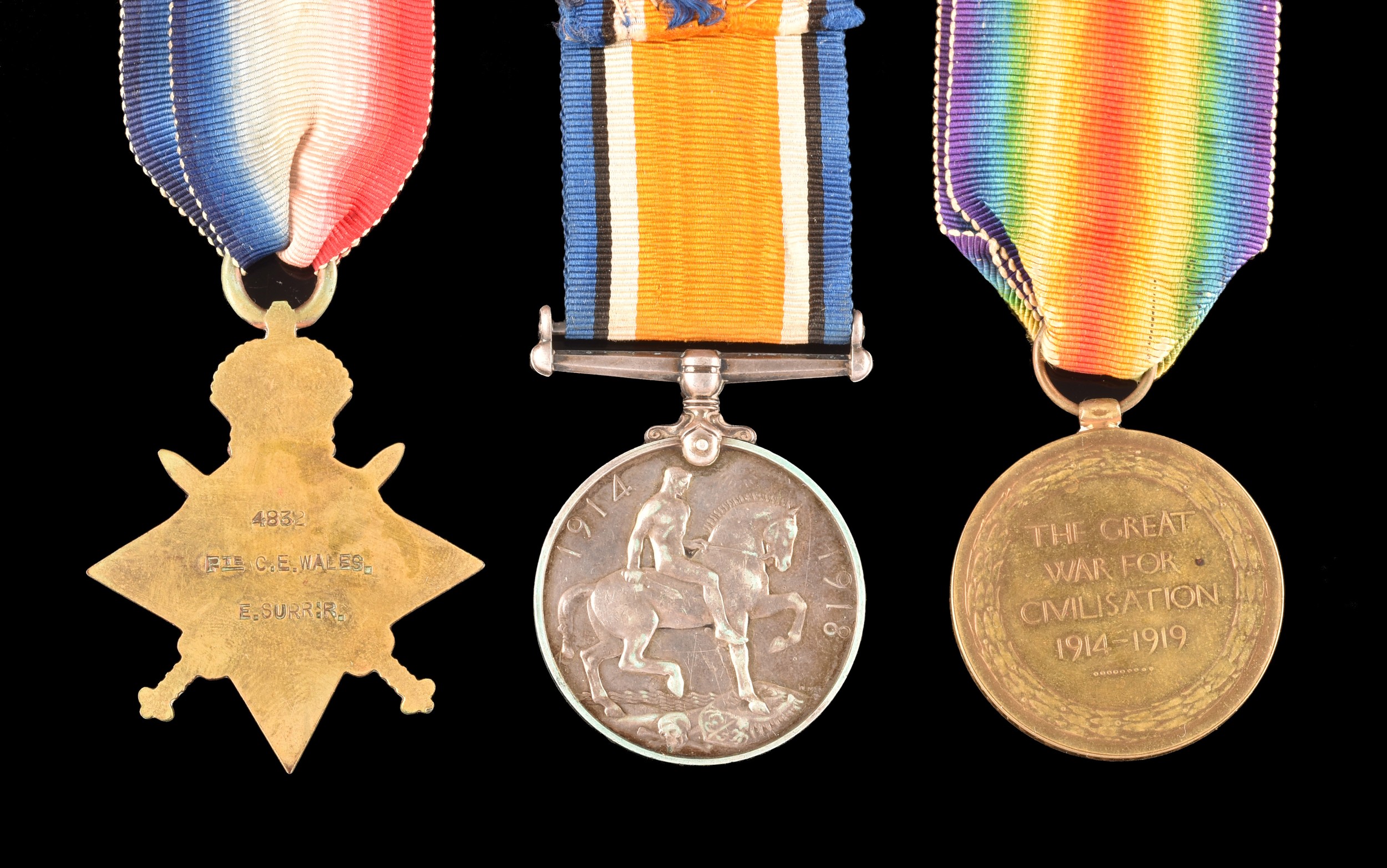 A Great War medal trio awarded to: 4832 Private Charles E. Wales, East Surrey Regiment. Comprising: a 1914-15 Star (4832 Pte. C. E. Wales, E. Surr: R); the British War Medal (4832 Pte. C. E. Wales, E. Surr. R); and the Victory Medal (4832 Pte. C. E. Wales, E. Surr. R), with medal card.