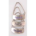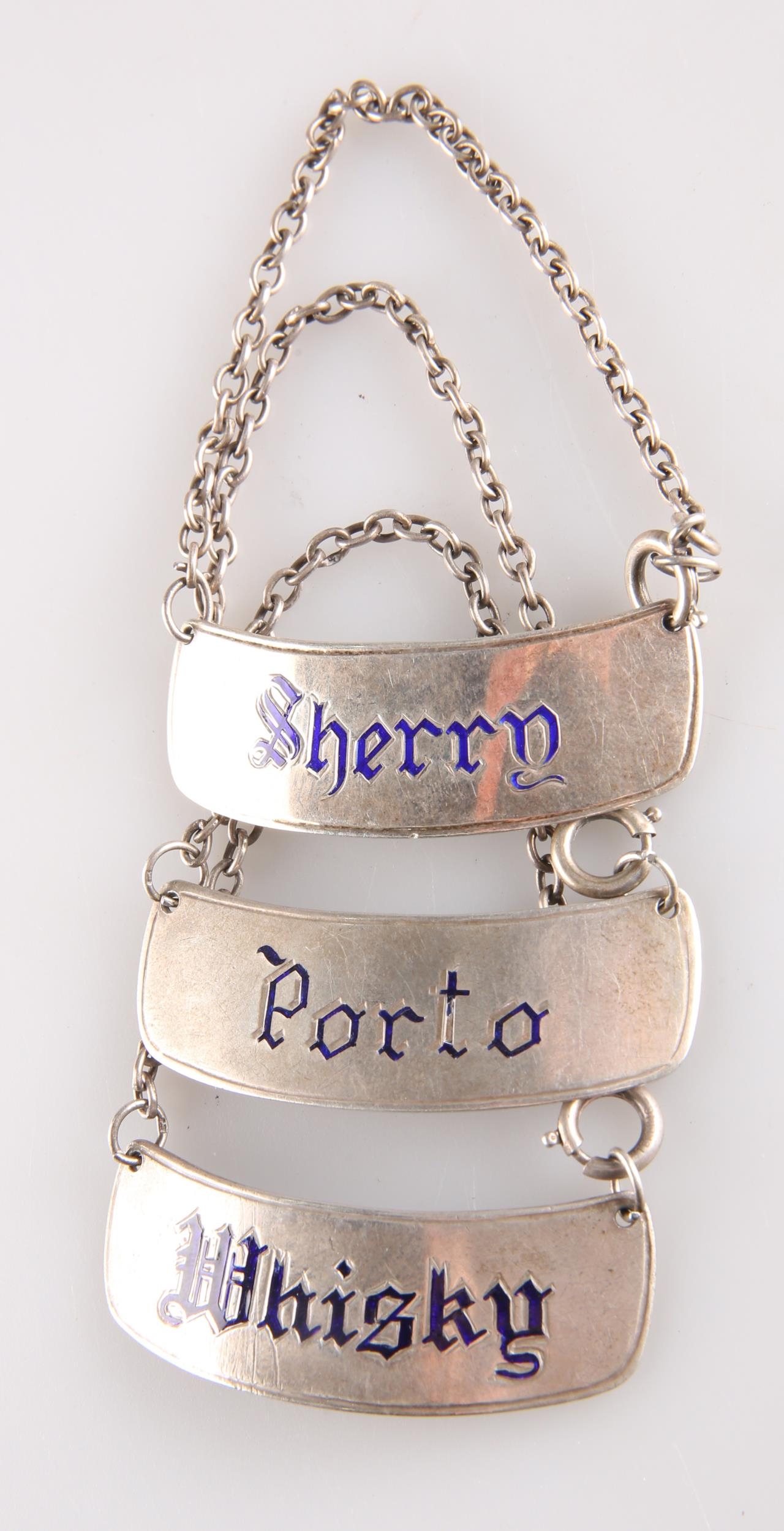 by Barker Ellis Silver Co, Birmingham 1965, curved and rounded rectangular, each with blue enamel script, for 'Porto', 'Sherry' and 'Whisky'. (3) 4.9cm wide, 1 troy ounce gross