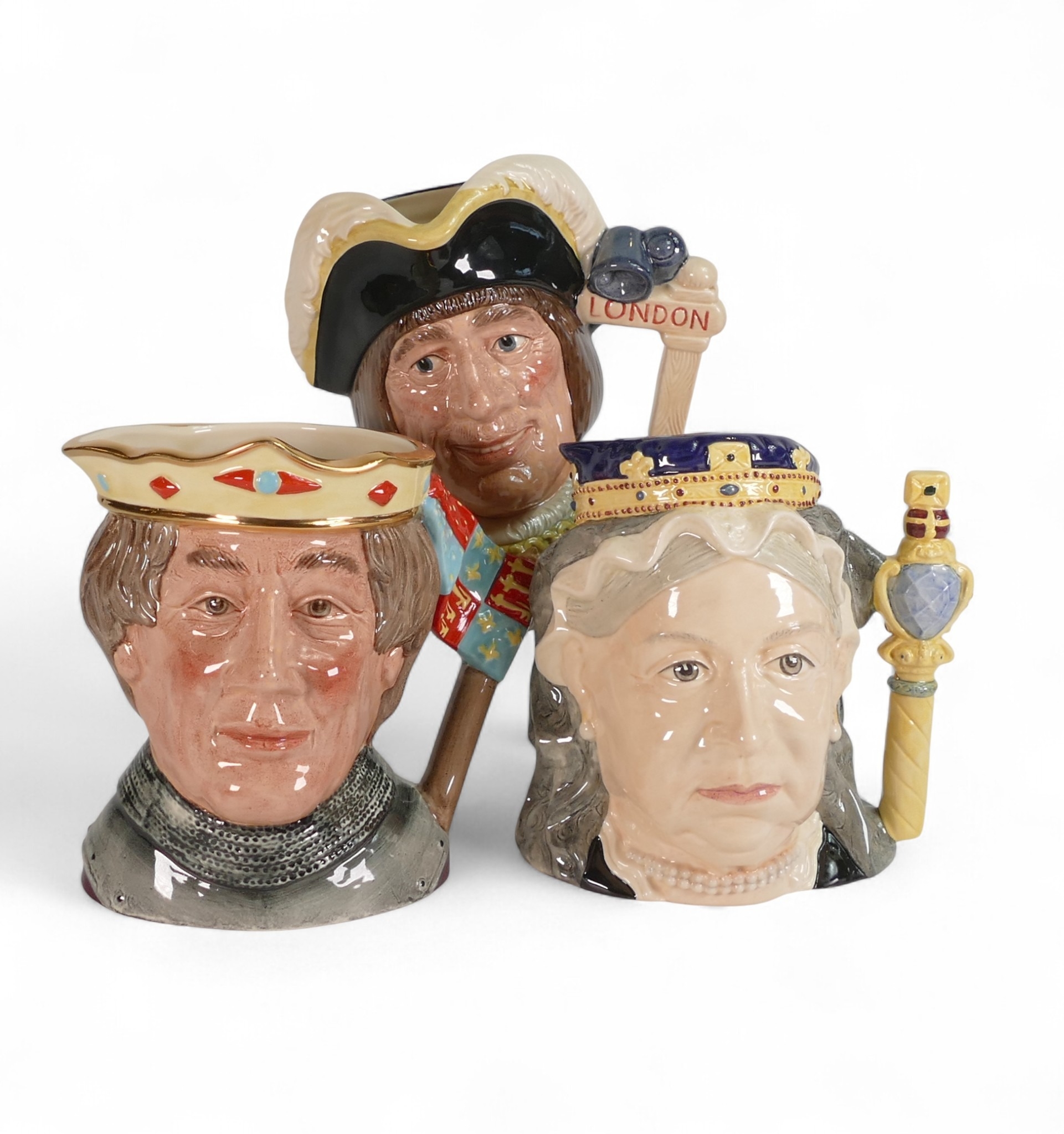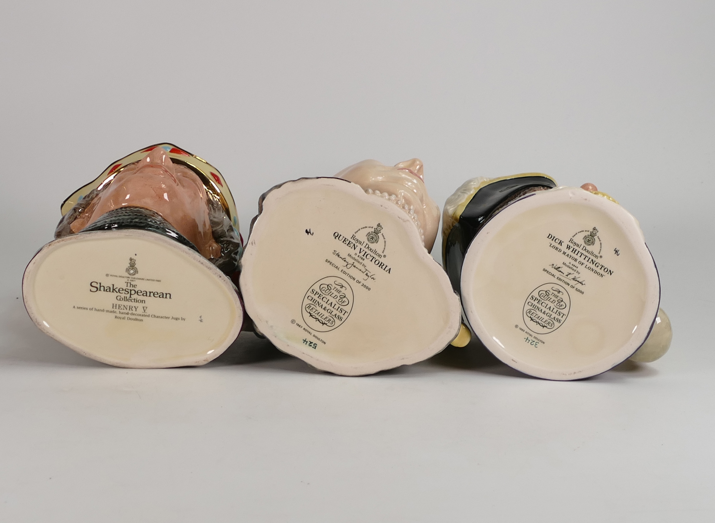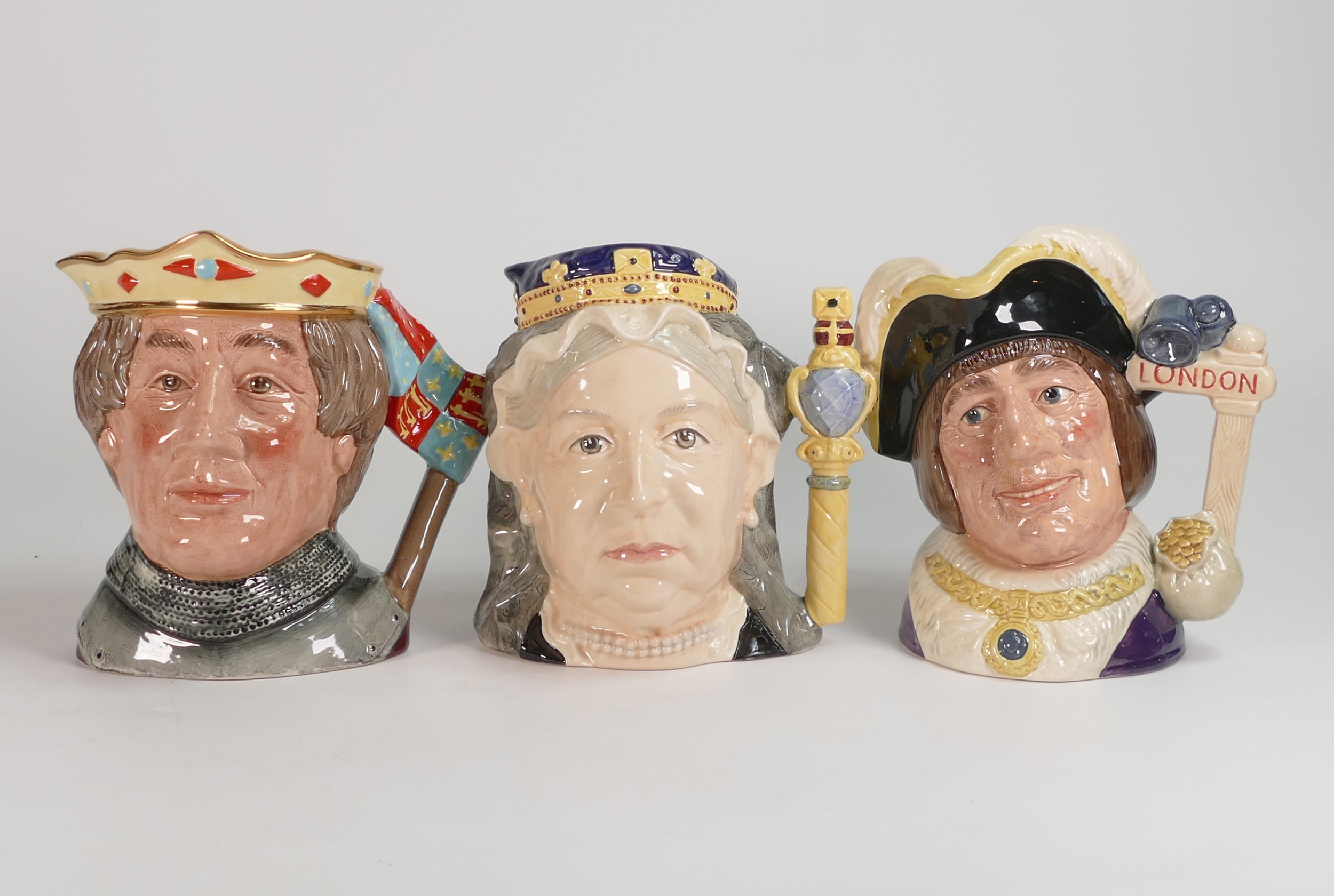 Royal Doulton large character jugs to include Queen Victoria D6788, Dick Whittington D6846, Lord Mayor of London and Henry V D6671, The Shakespearean Collection (seconds). (3)