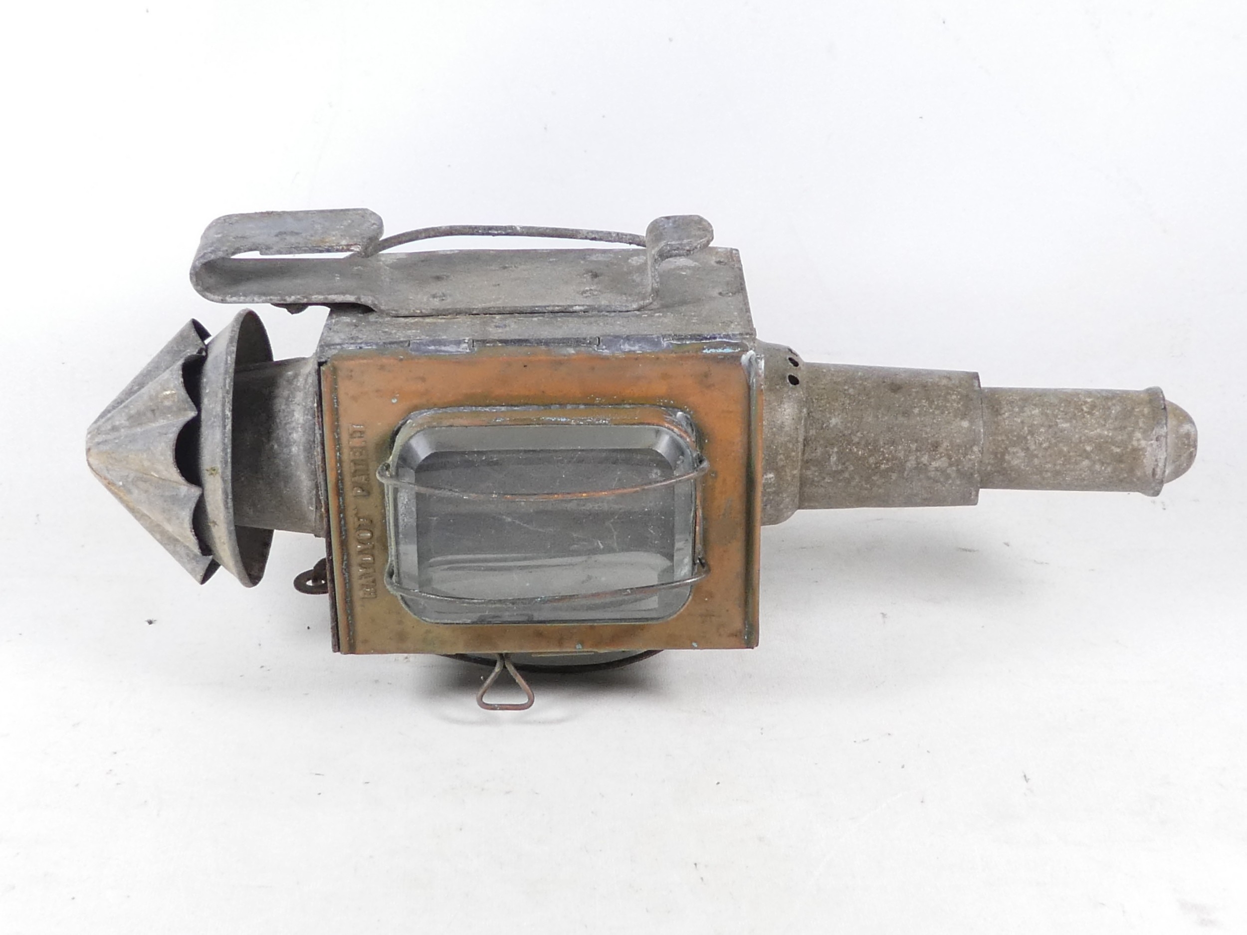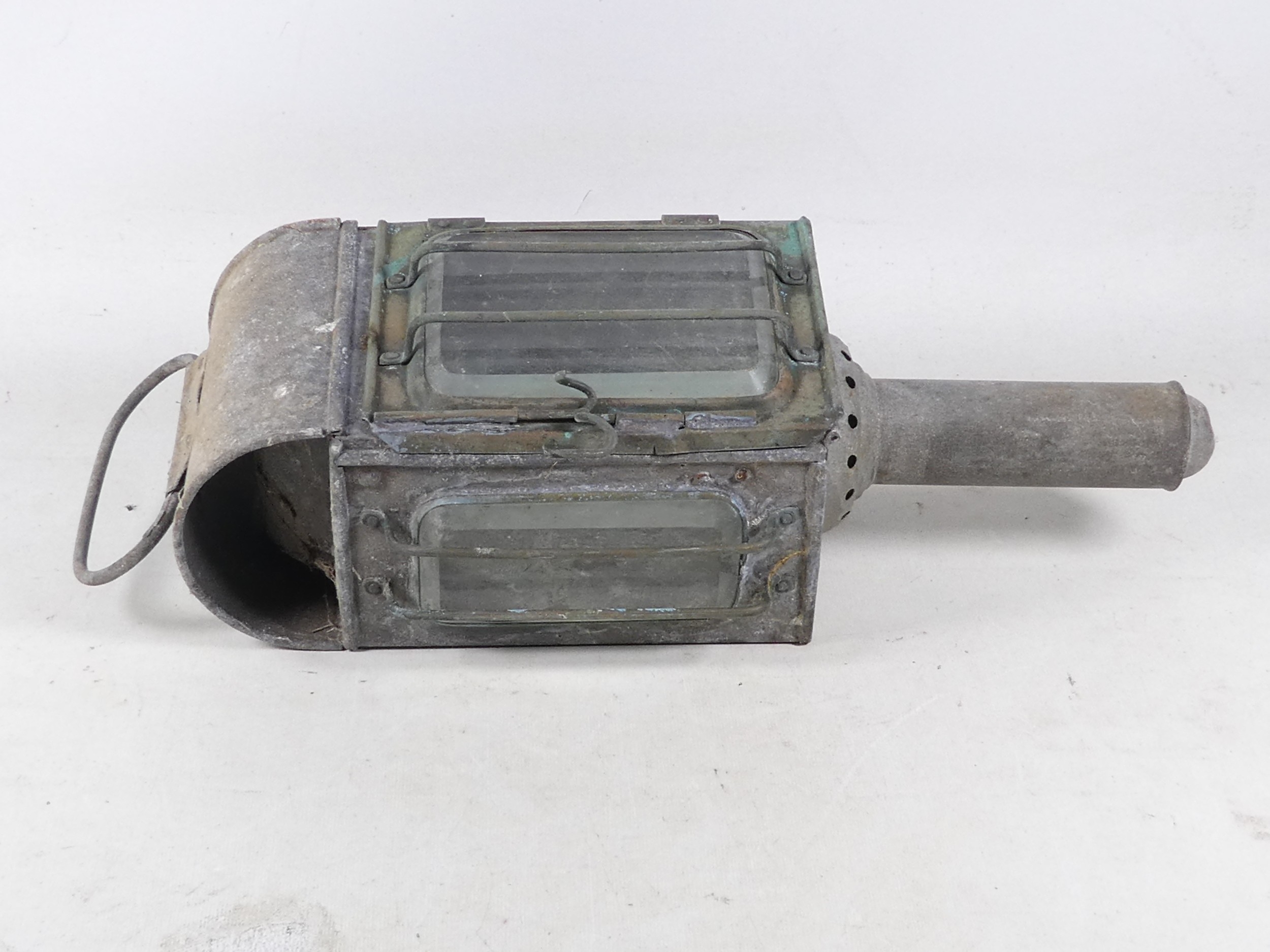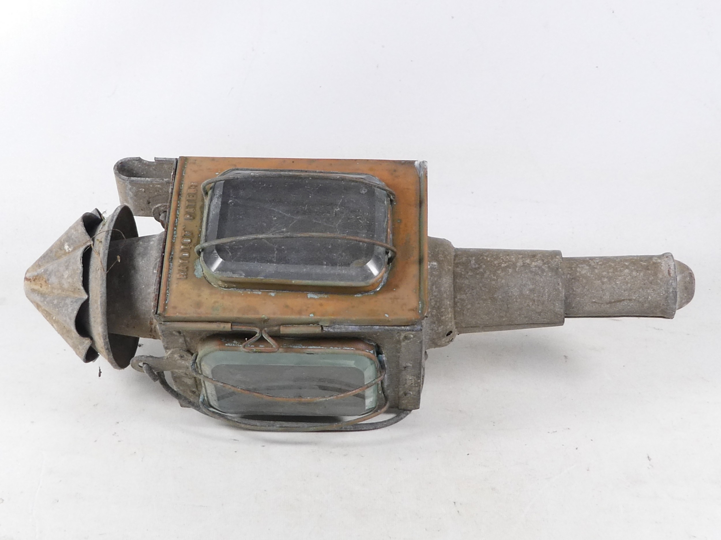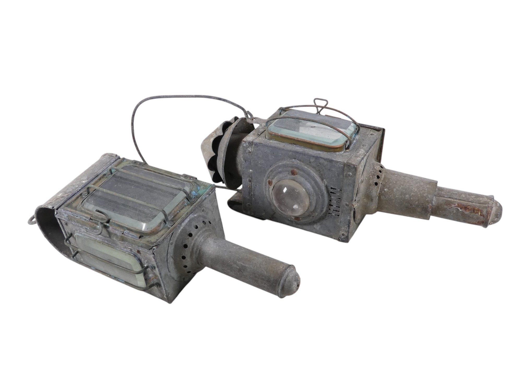 A 19th century Raydyot zinc and brass carriage lamp - with two caged rectangular glass panels and a red bulls eye to rear, 40cm high, together with another similar carriage lamp. (2)