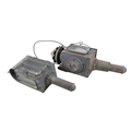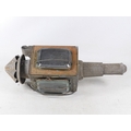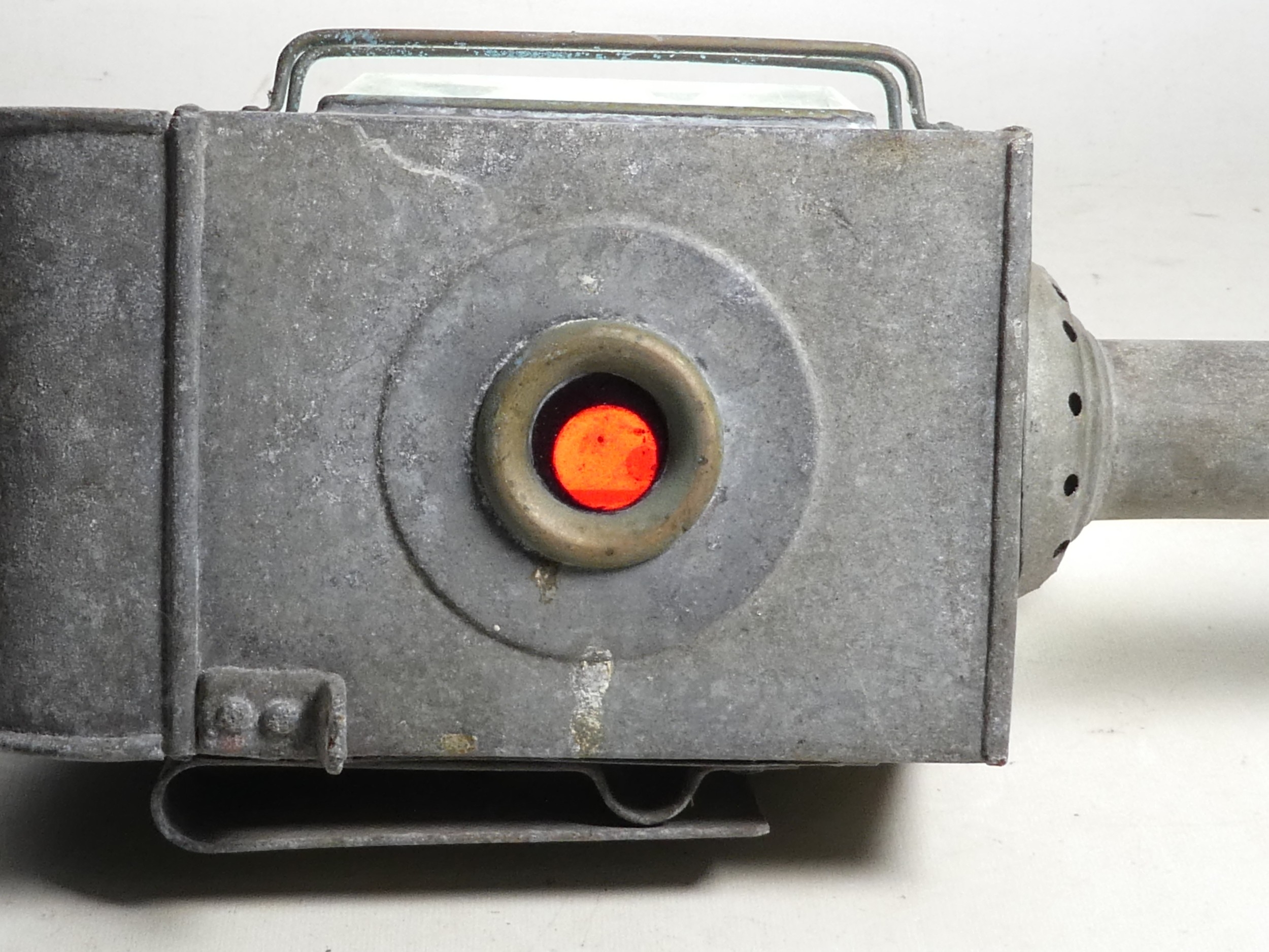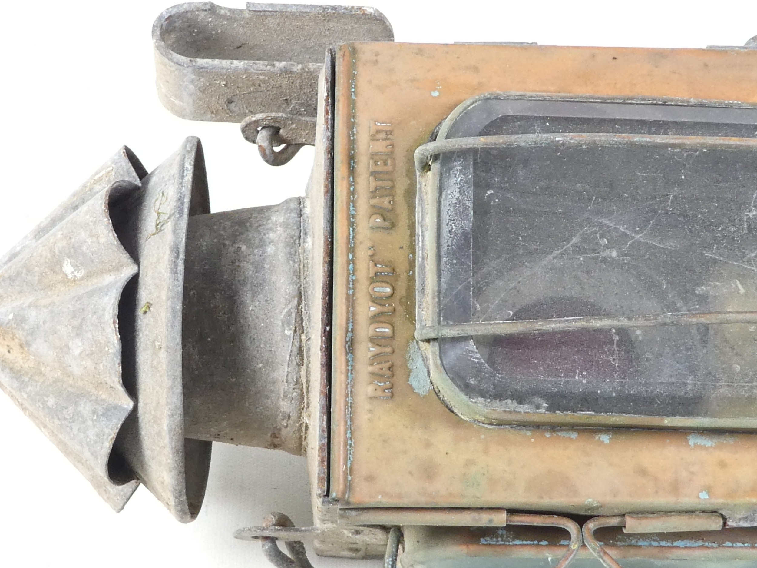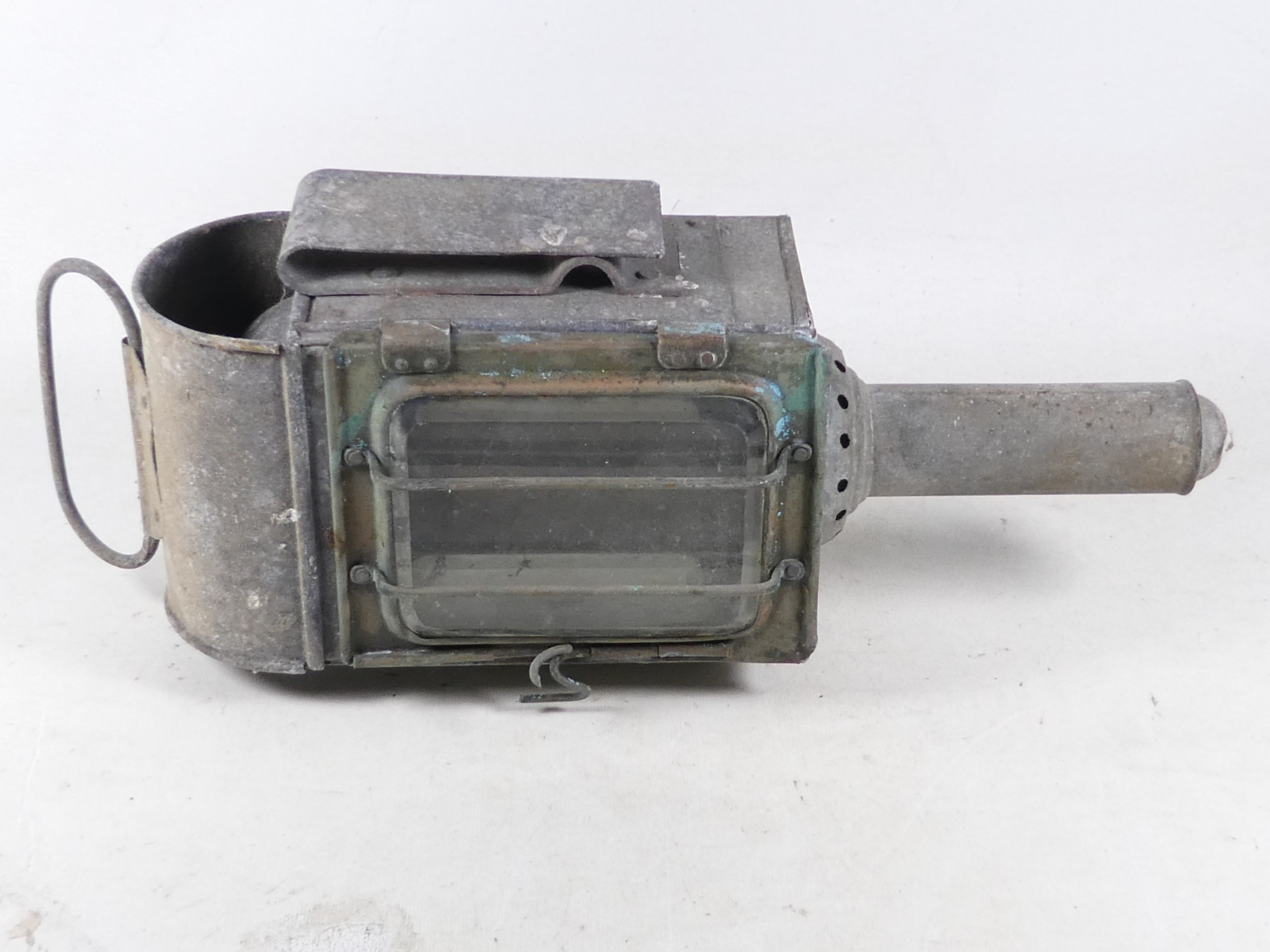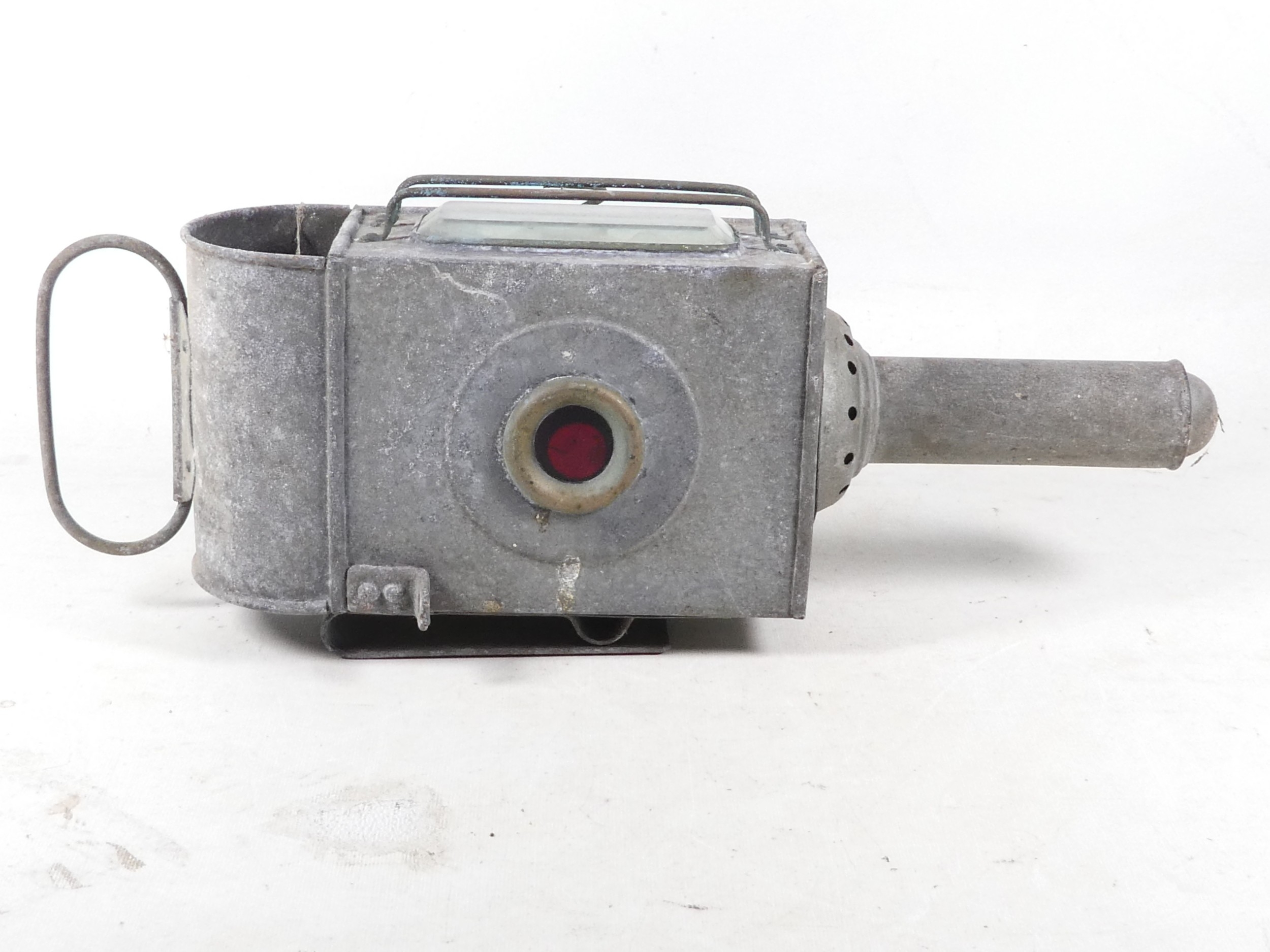 A 19th century Raydyot zinc and brass carriage lamp - with two caged rectangular glass panels and a red bulls eye to rear, 40cm high, together with another similar carriage lamp. (2)