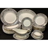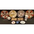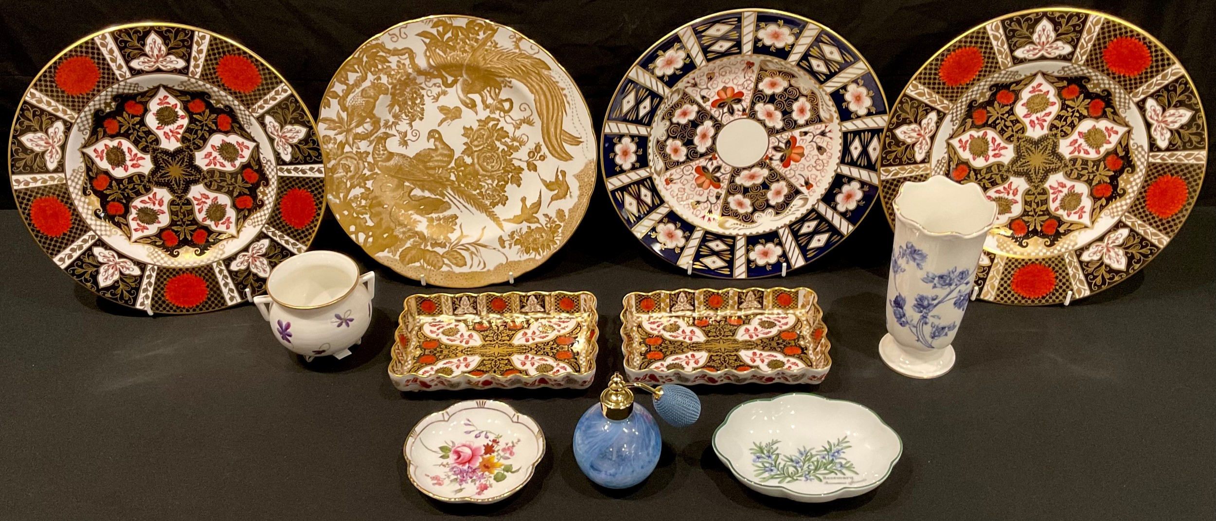A Royal Crown Derby Gold Aves shaped circular plate, 26.5cm; a 2451 pattern plate; a Derby King Street Stevenson & hancock cauldron vase, painted with forget-me-knots; a pair of Abbeydale Chrysanthemum dinner plates; a pair of Chrysanthemum pattern rectangular dishes; a Caithness scent atomiser; etc