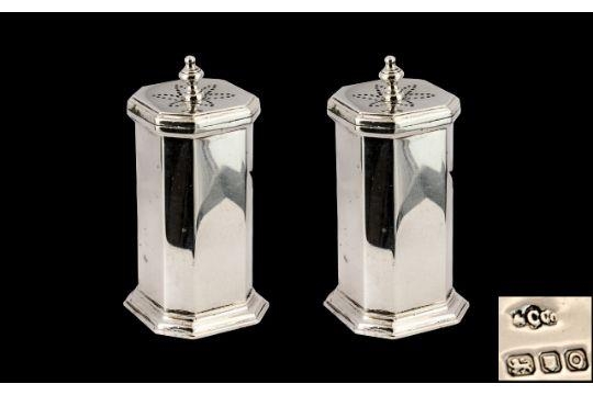George VI Excellent Pair of Sterling Silver Pepperettes of Cylindrical and Octagonal Form of Solid Construction. Hallmark London 1949. Both Pepperettes 3 Inches - 7.5 cms High. 153.6 grams. Both Pepperettes Excellent Condition.