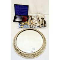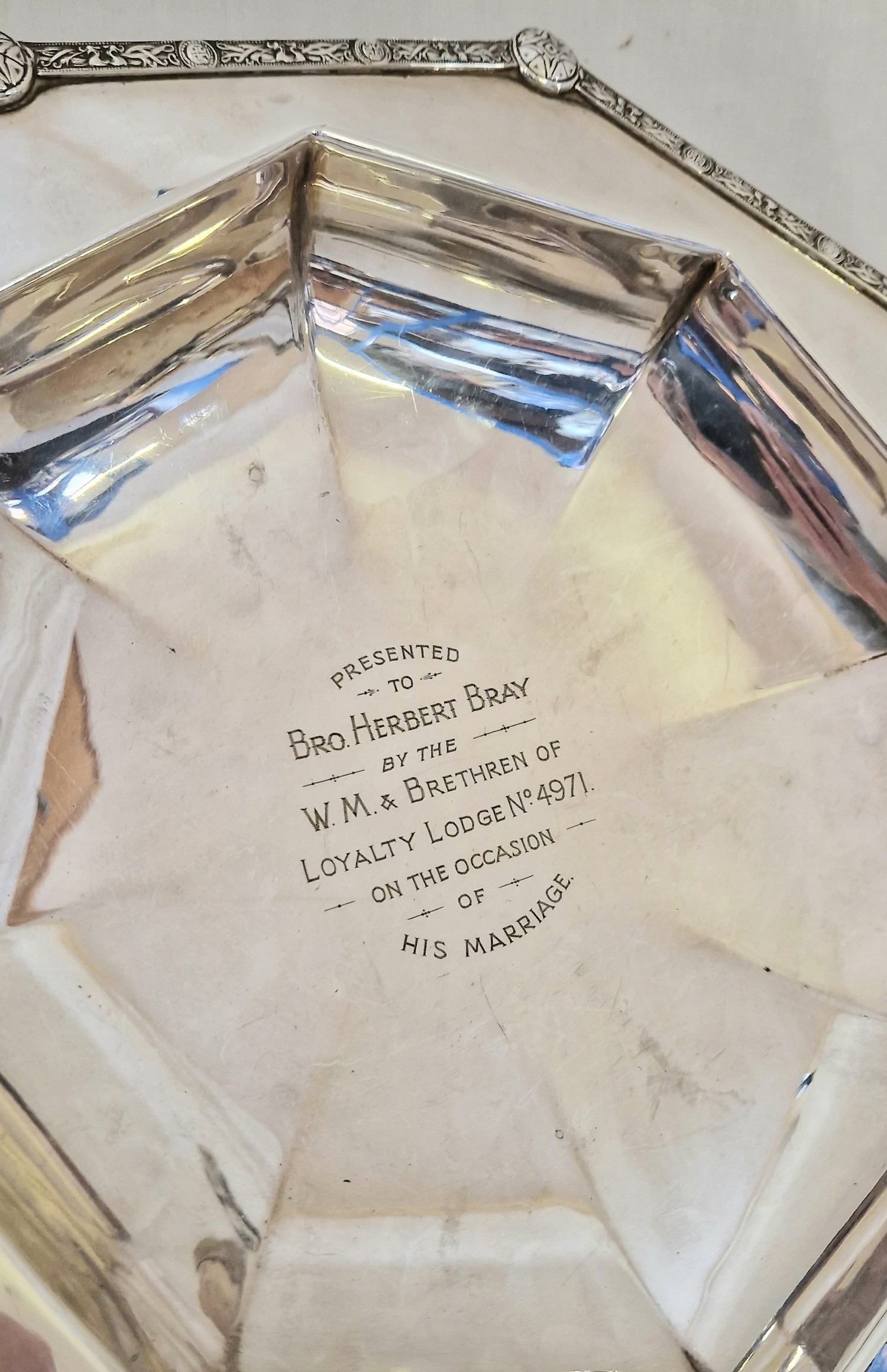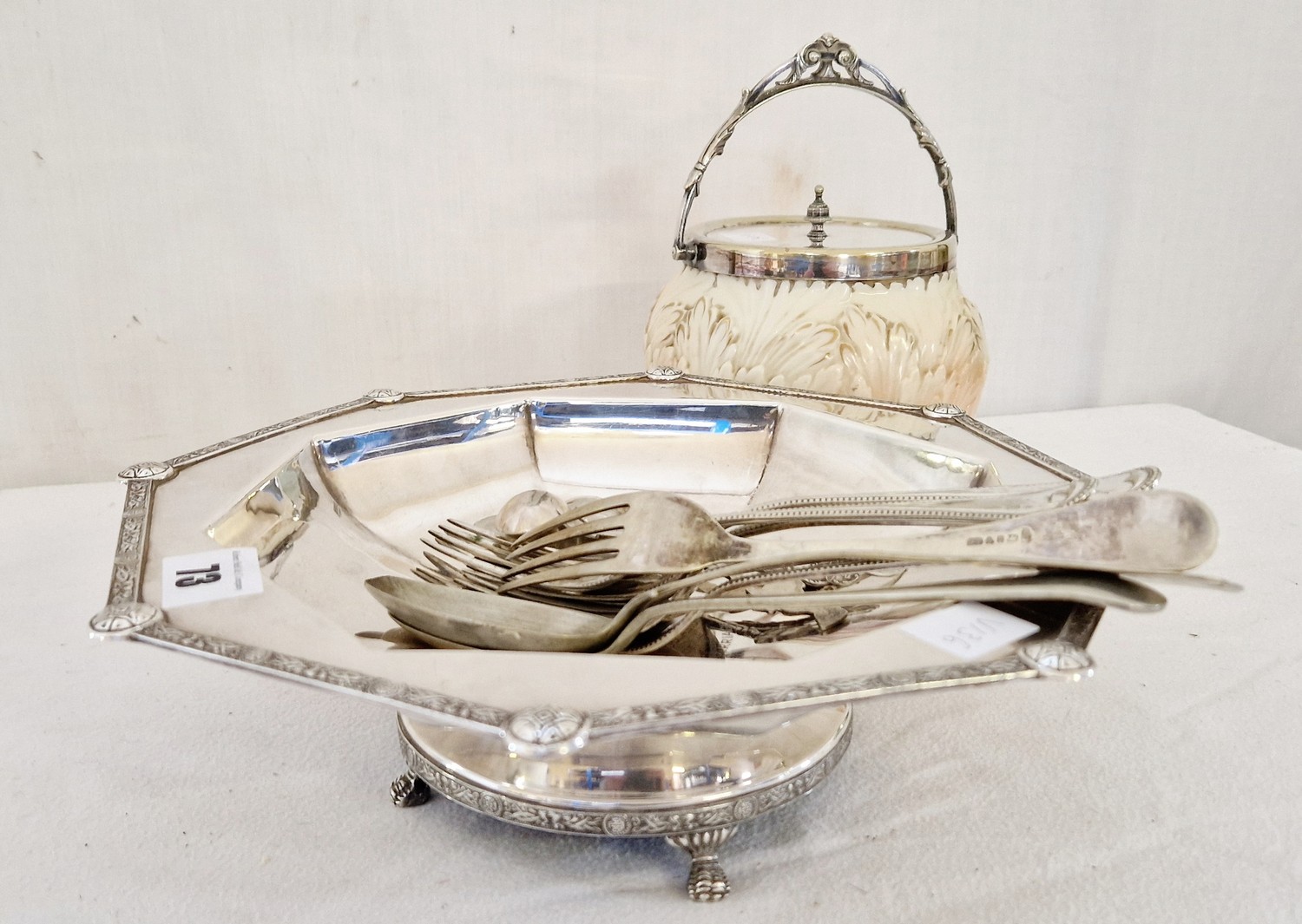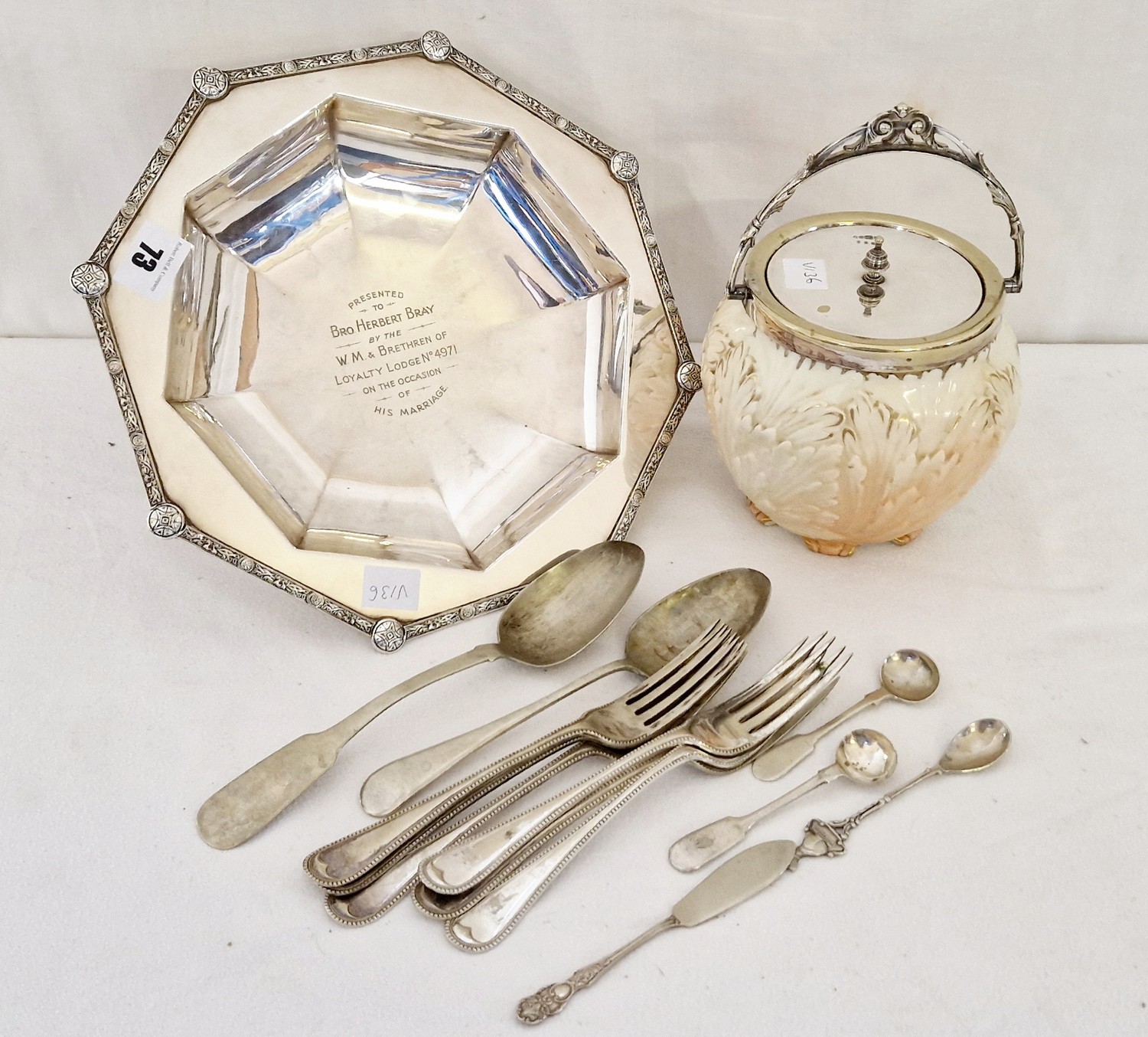Qty of EPNS tableware comprising Locke & Co Worcester biscuit barrel with acanthus leaf body and plate lid & mounts; various flatware tablespoons, dinner forks, mustard spoons etc and an octagonal presentation bowl with Masonic matrimonial inscription