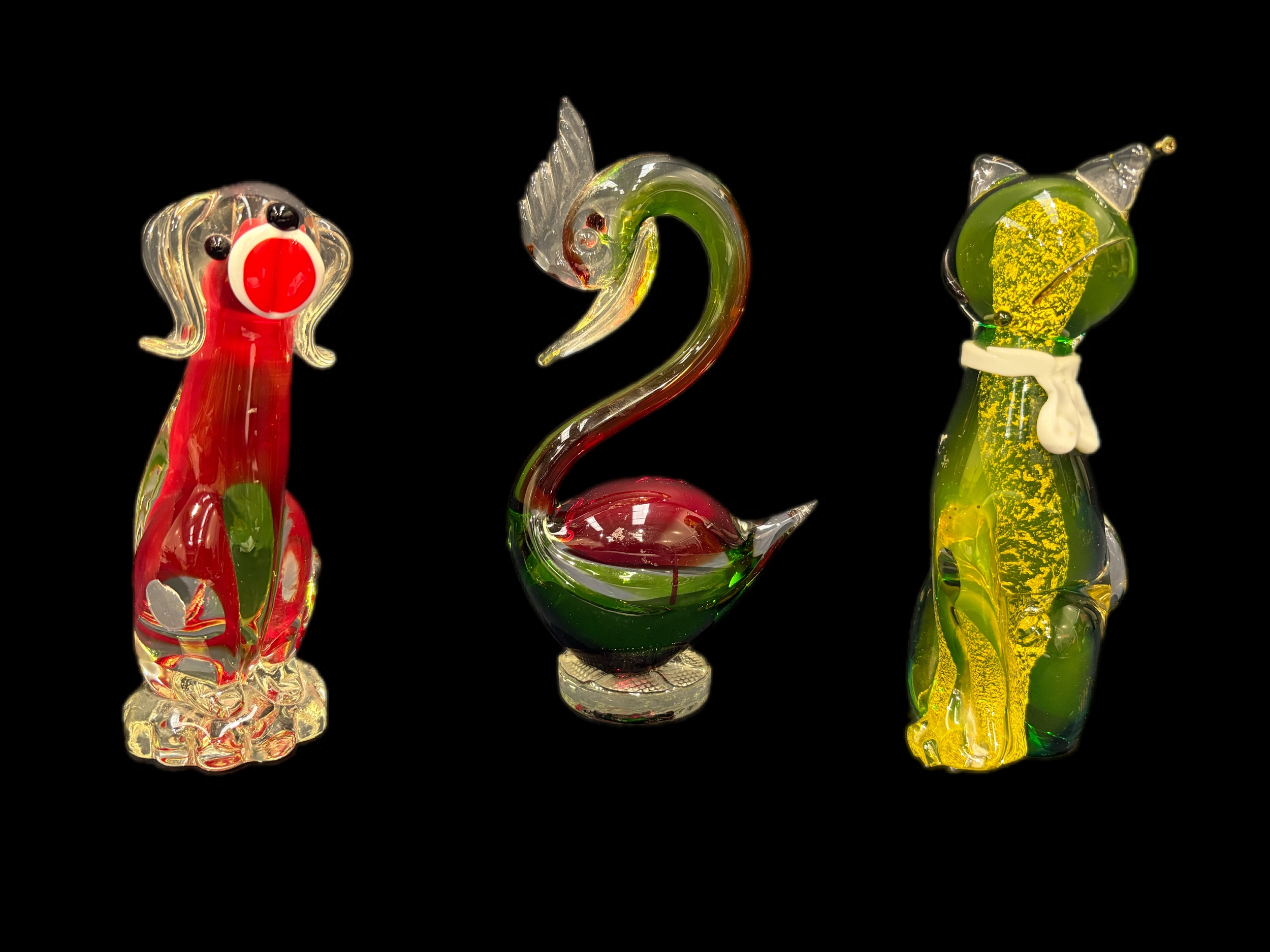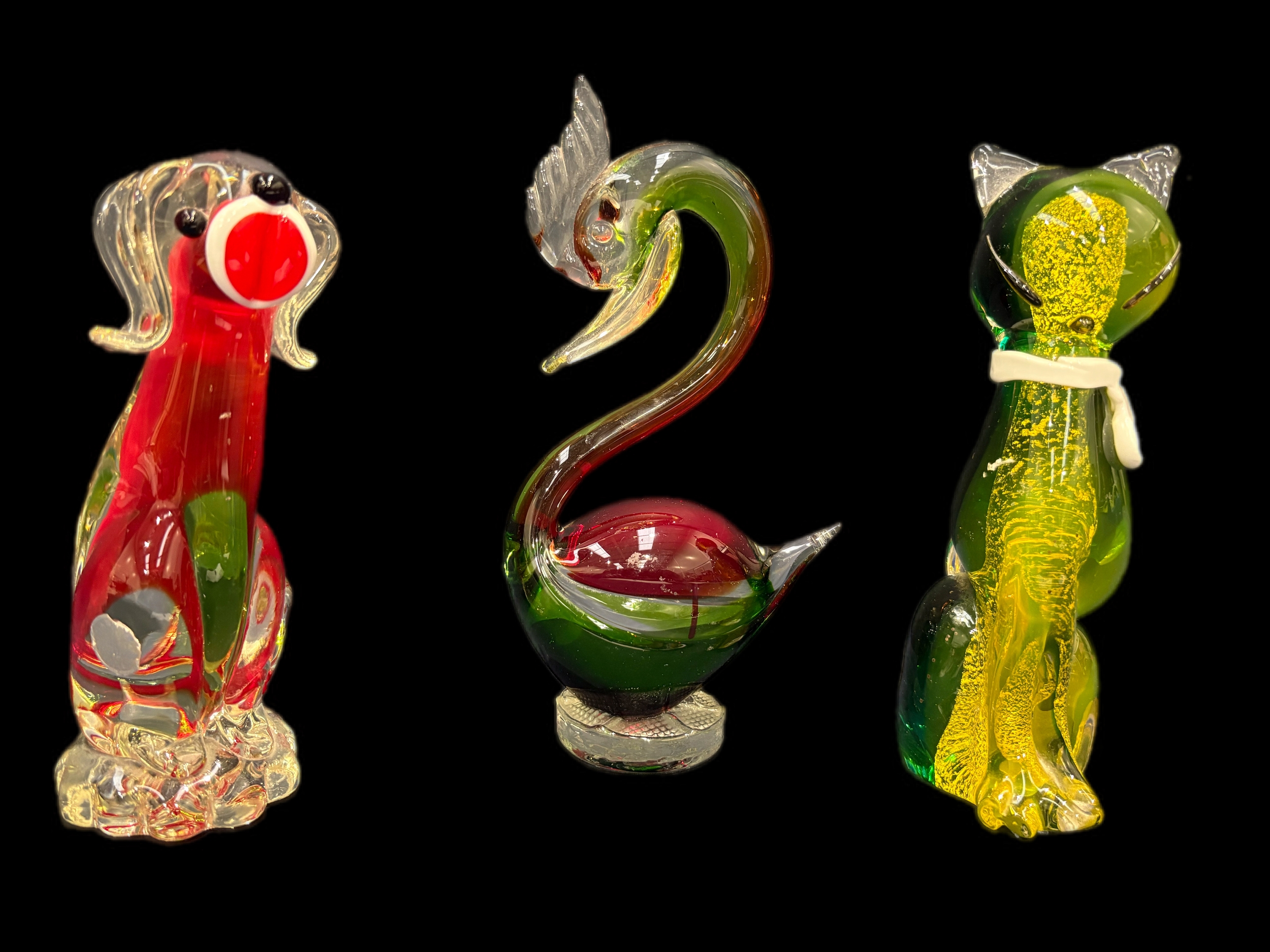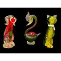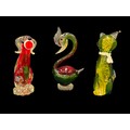 3 pieces of Murano glass, Great crested grebe, cat and dog