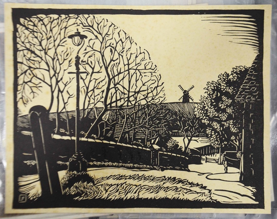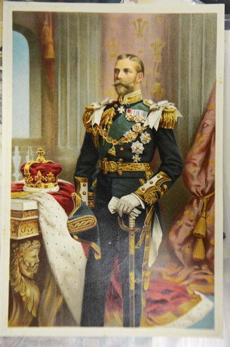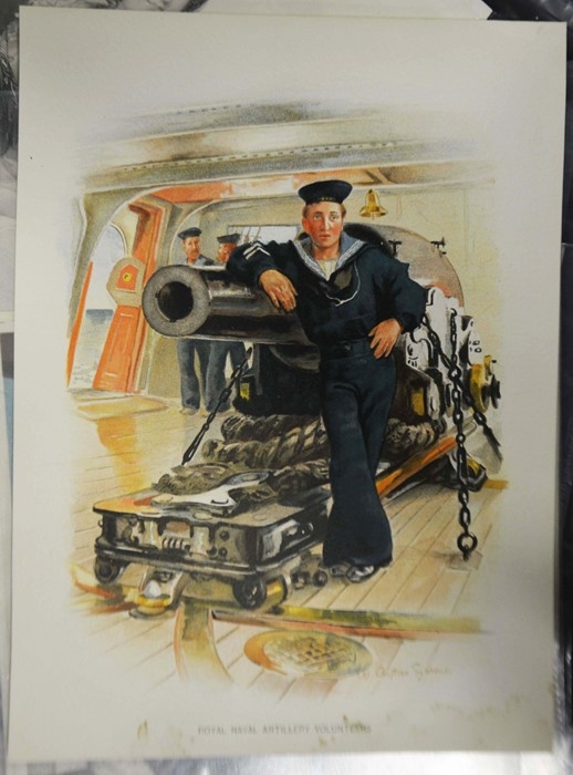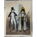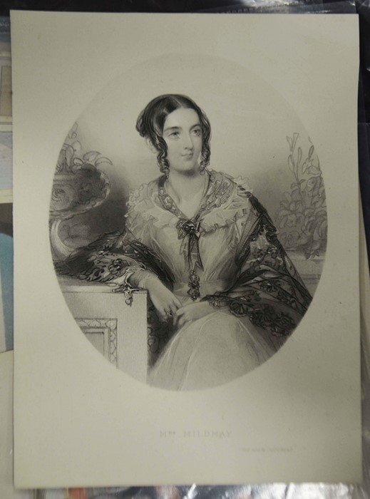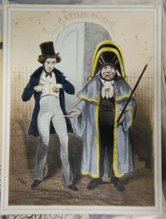 A selection of 19th century prints or later, including two satirical prints by Cham (circa 1830), three engravings of young women Mrs Mildway, Bertie Browne and Feathers and Flowers (circa 1860), four naval and Royal lithographs (circa 1901), a woodblock print of a village landscape monogrammed F, photograph of crew at HMS Ganges (dated 39 verso), and others (15)