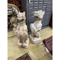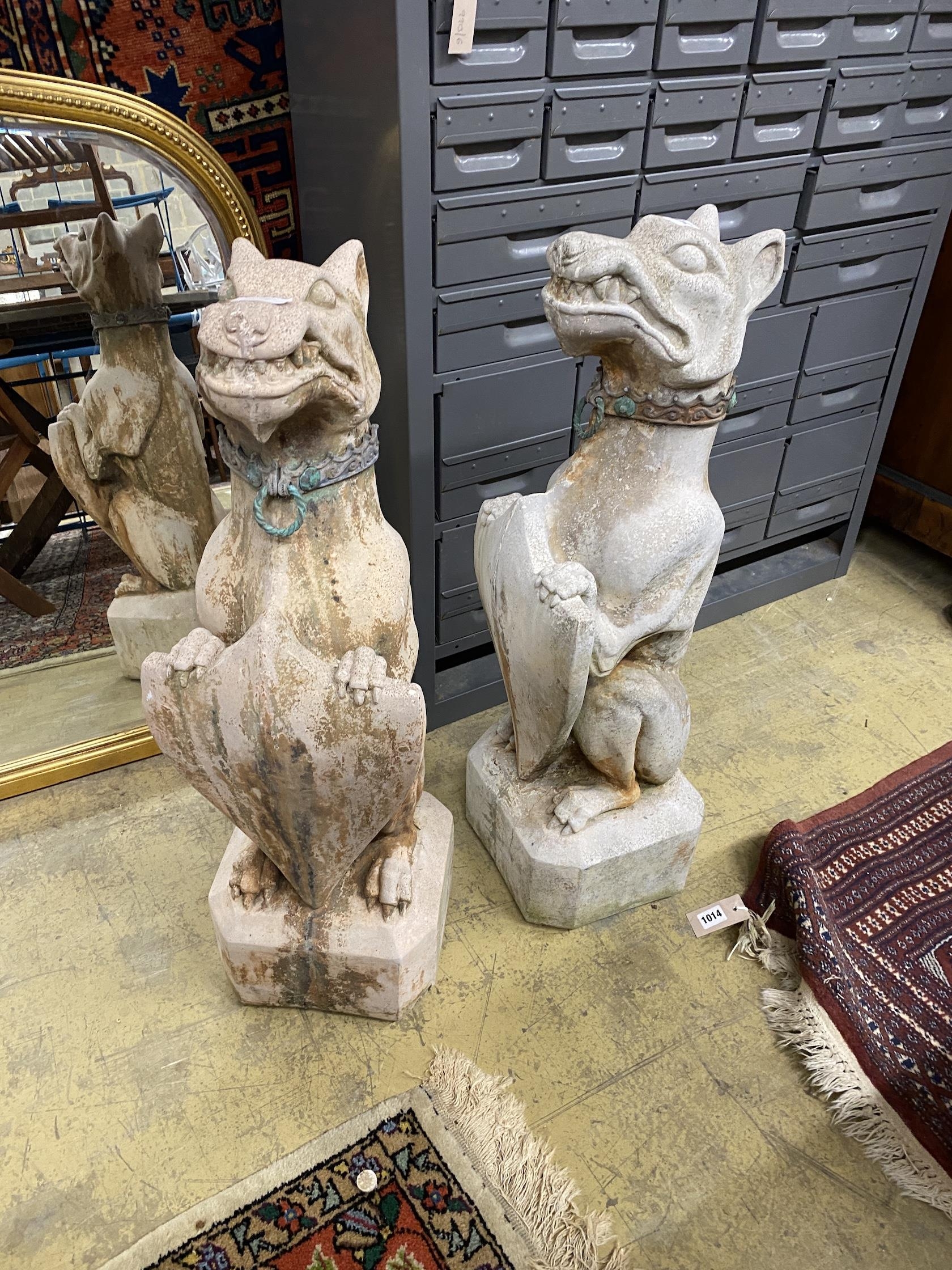 A pair of reconstituted stone dog and shield garden ornaments with cast metal collars, height 81cm