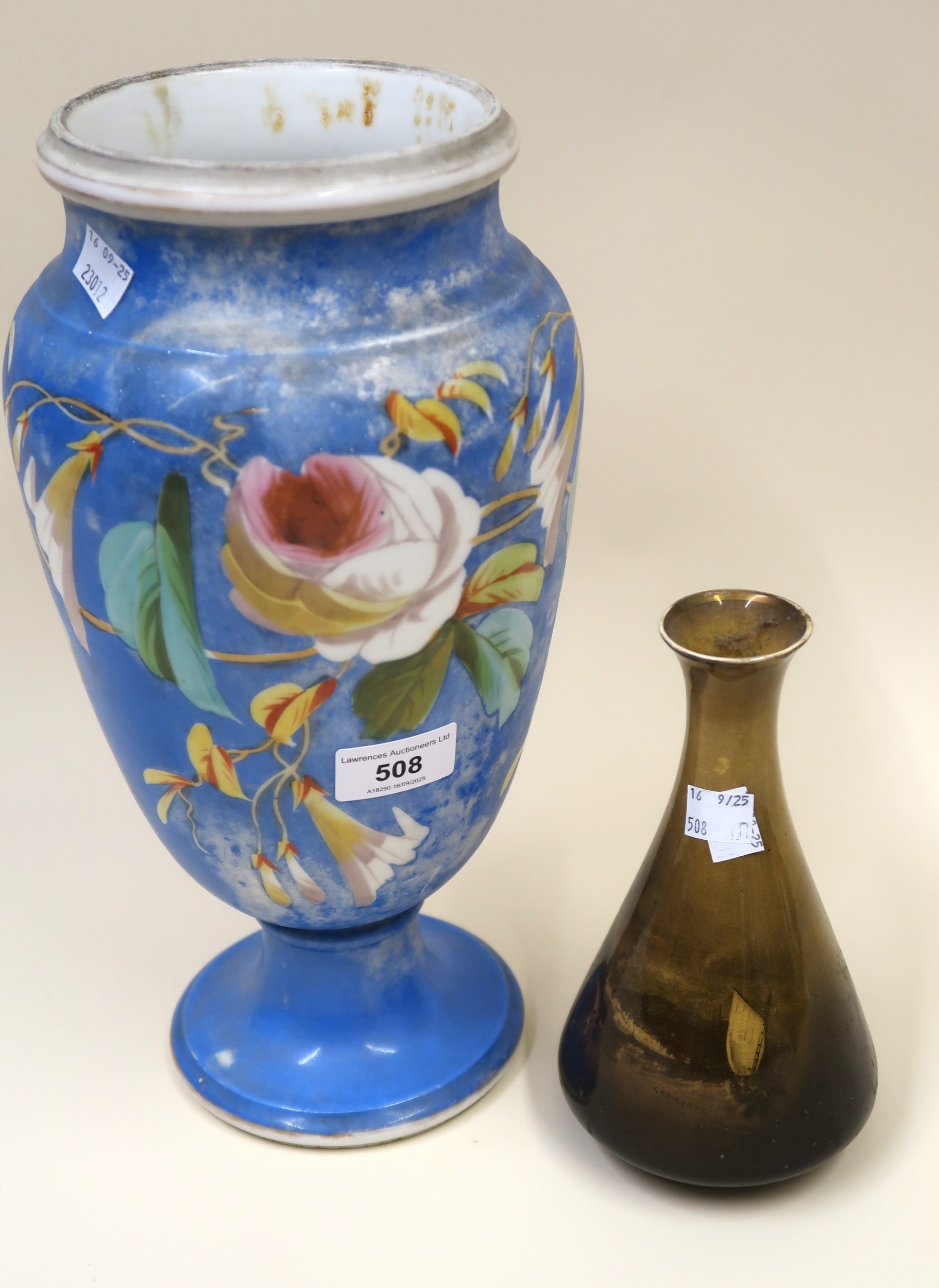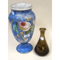 19th Century Paris porcelain pedestal vase having floral decoration on blue ground, together with another smaller Royal Vistas ware vase, 33cm and 19cm high
