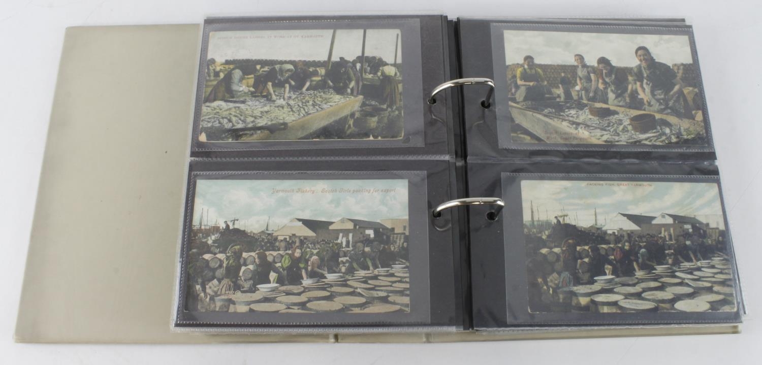 Norfolk, Great Yarmouth: Collection in an album of printed Fishing related cards. Comic greetings cards, boats, fish processing etc etc. Comprehensive lot (approx 80 cards)
