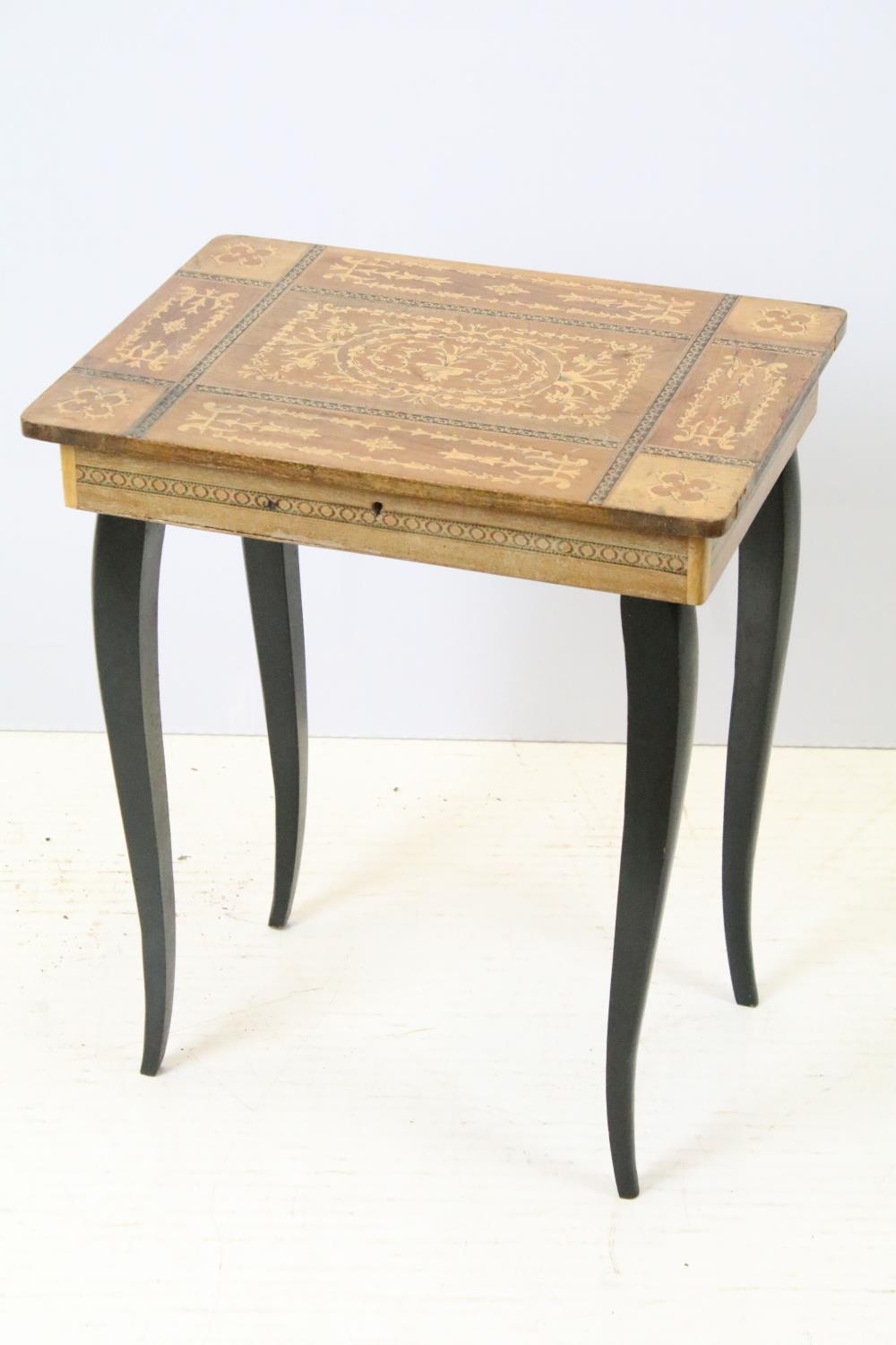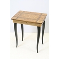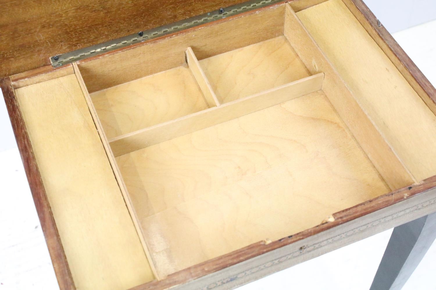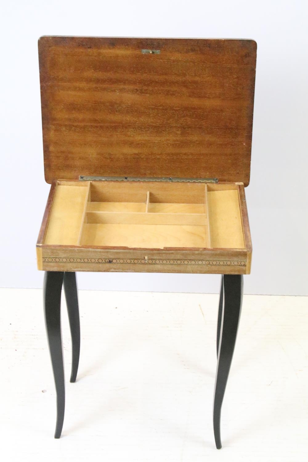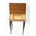 Sewing box on tapering legs, inlaid with foliage design and further inlaid with Tunbridge type banding 44cm high x 37cm wide x 27cm deep