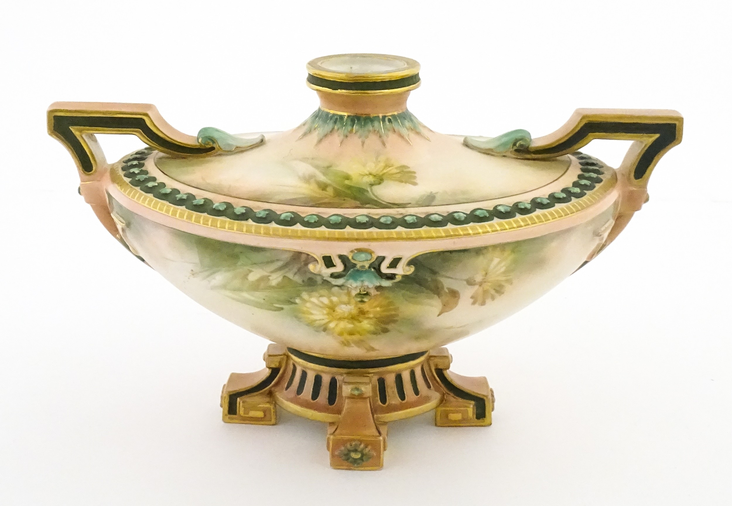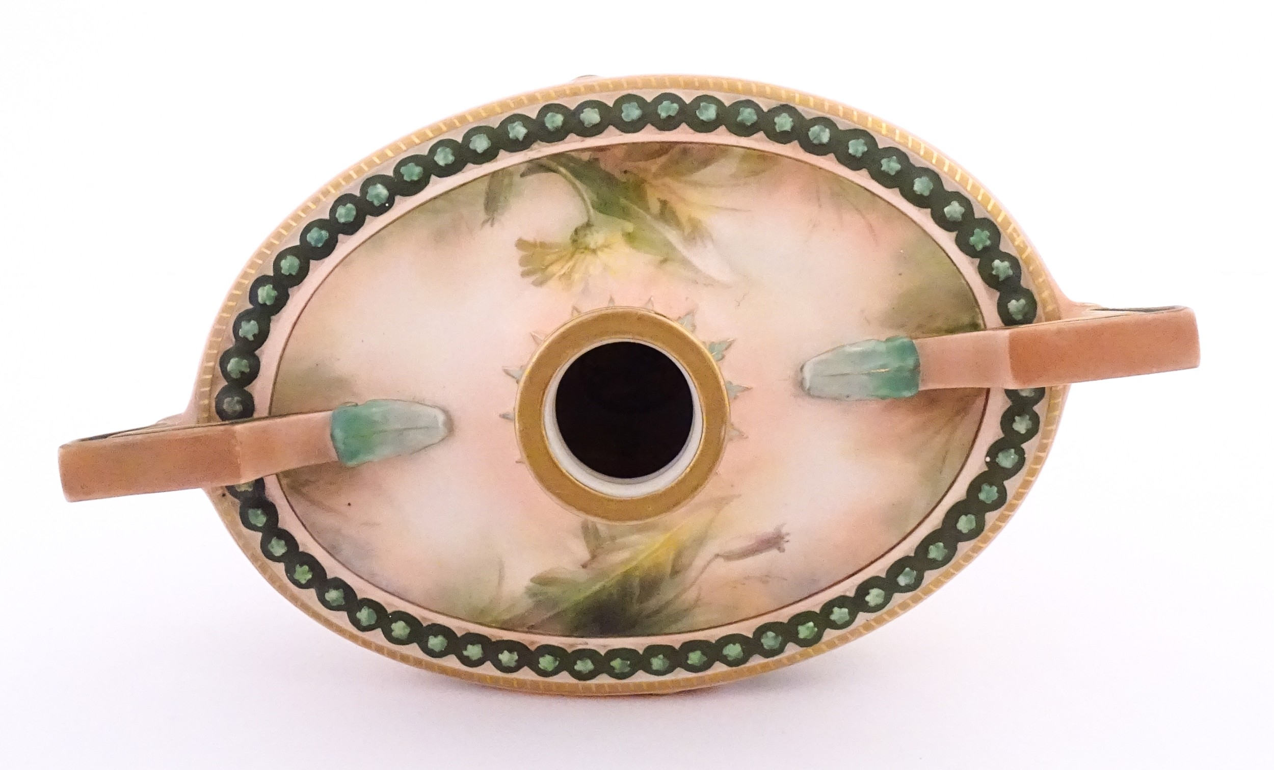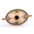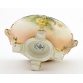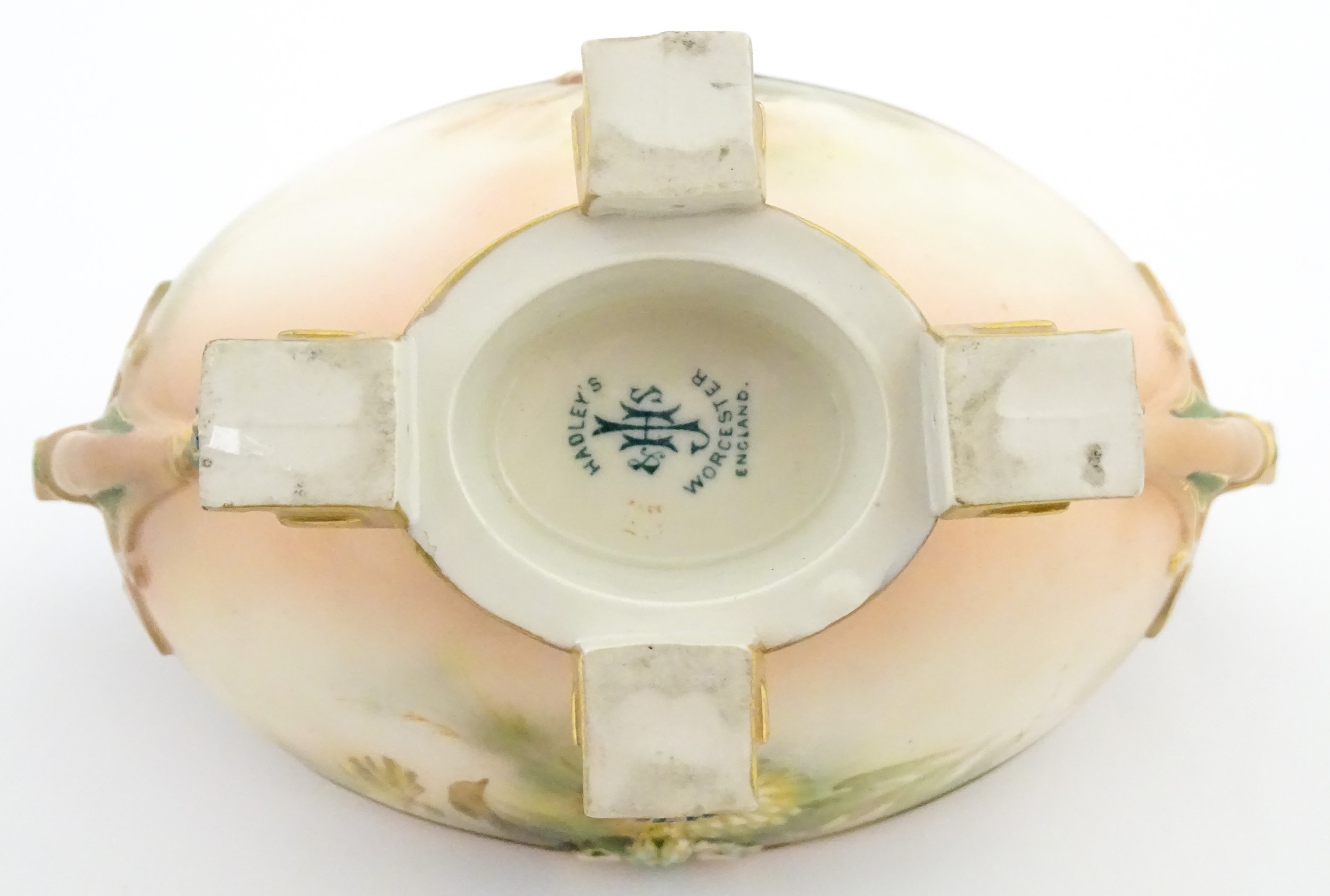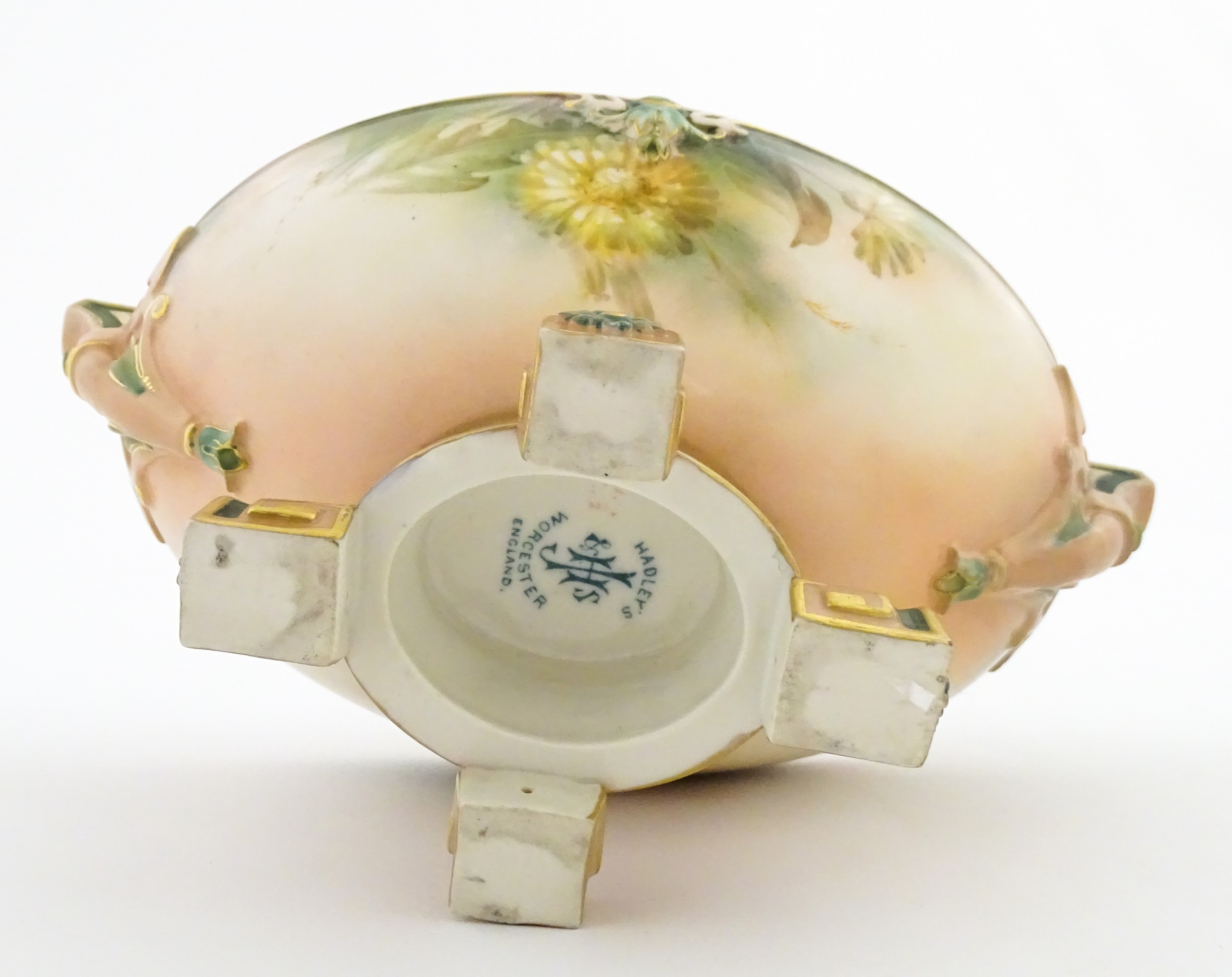 A Hadley's Worcester twin handled squat vase of boat form decorated with chrysanthemum flowers and foliage. Marked under. Approx. 5 1/4" high