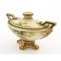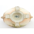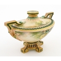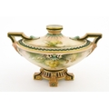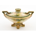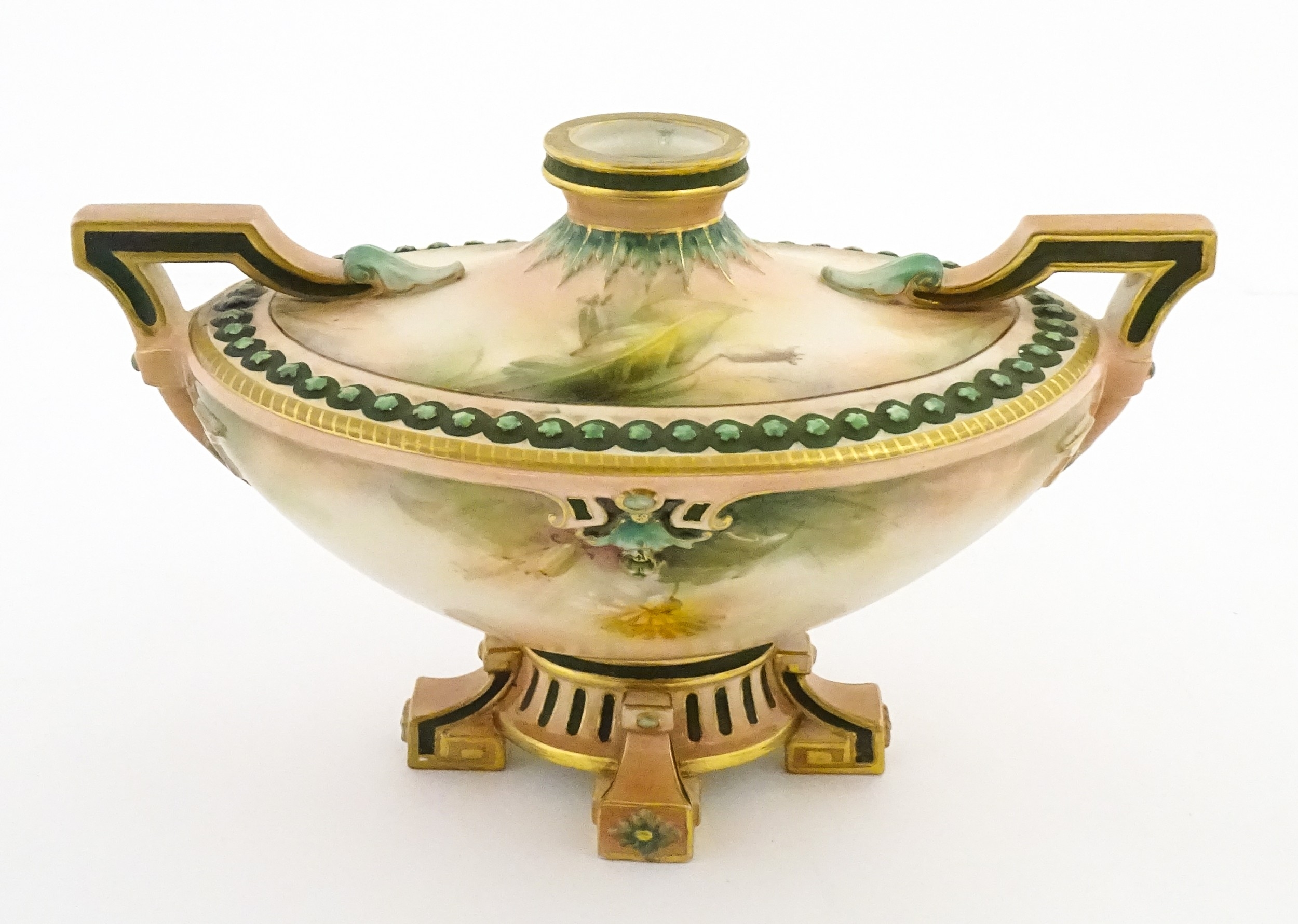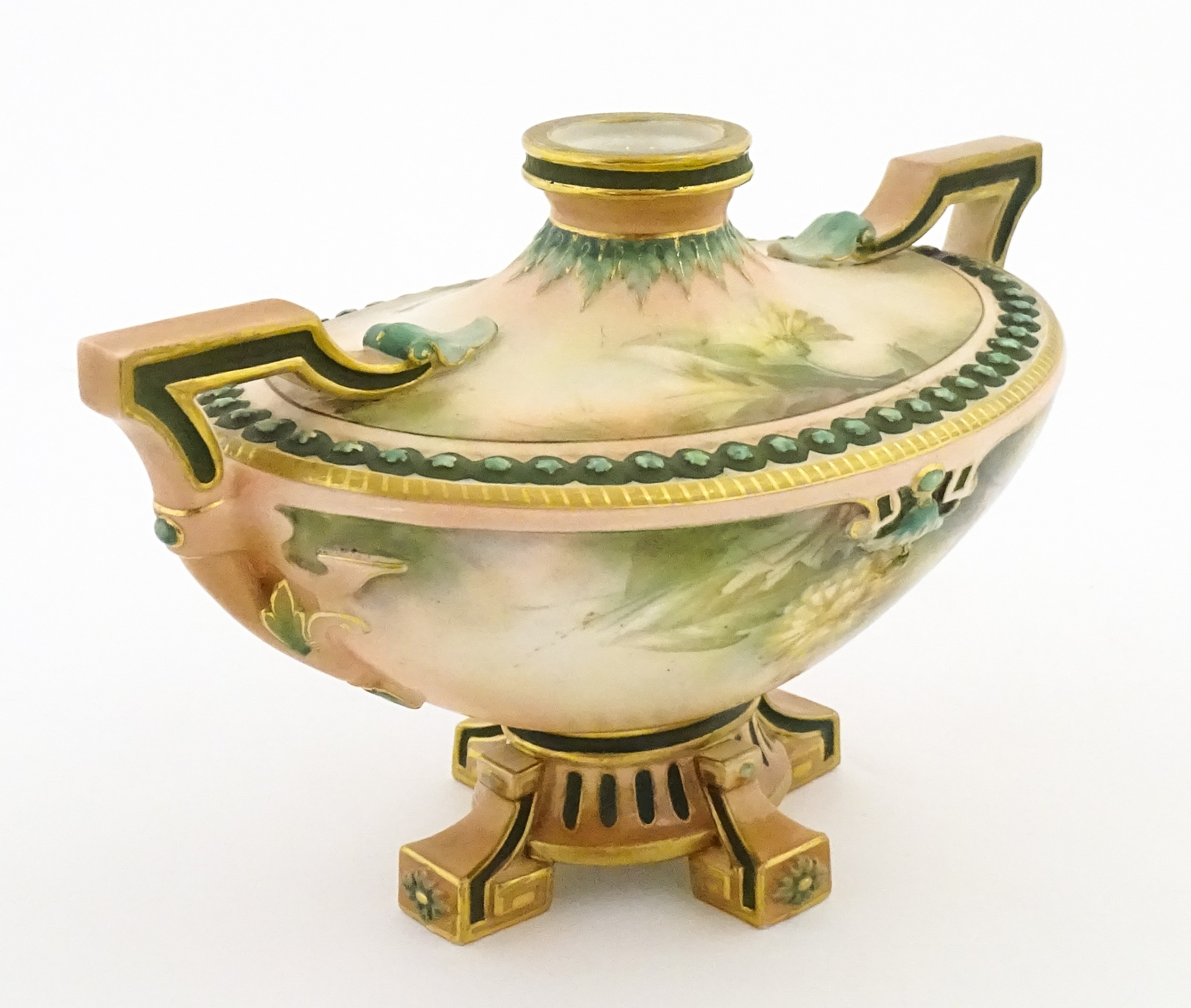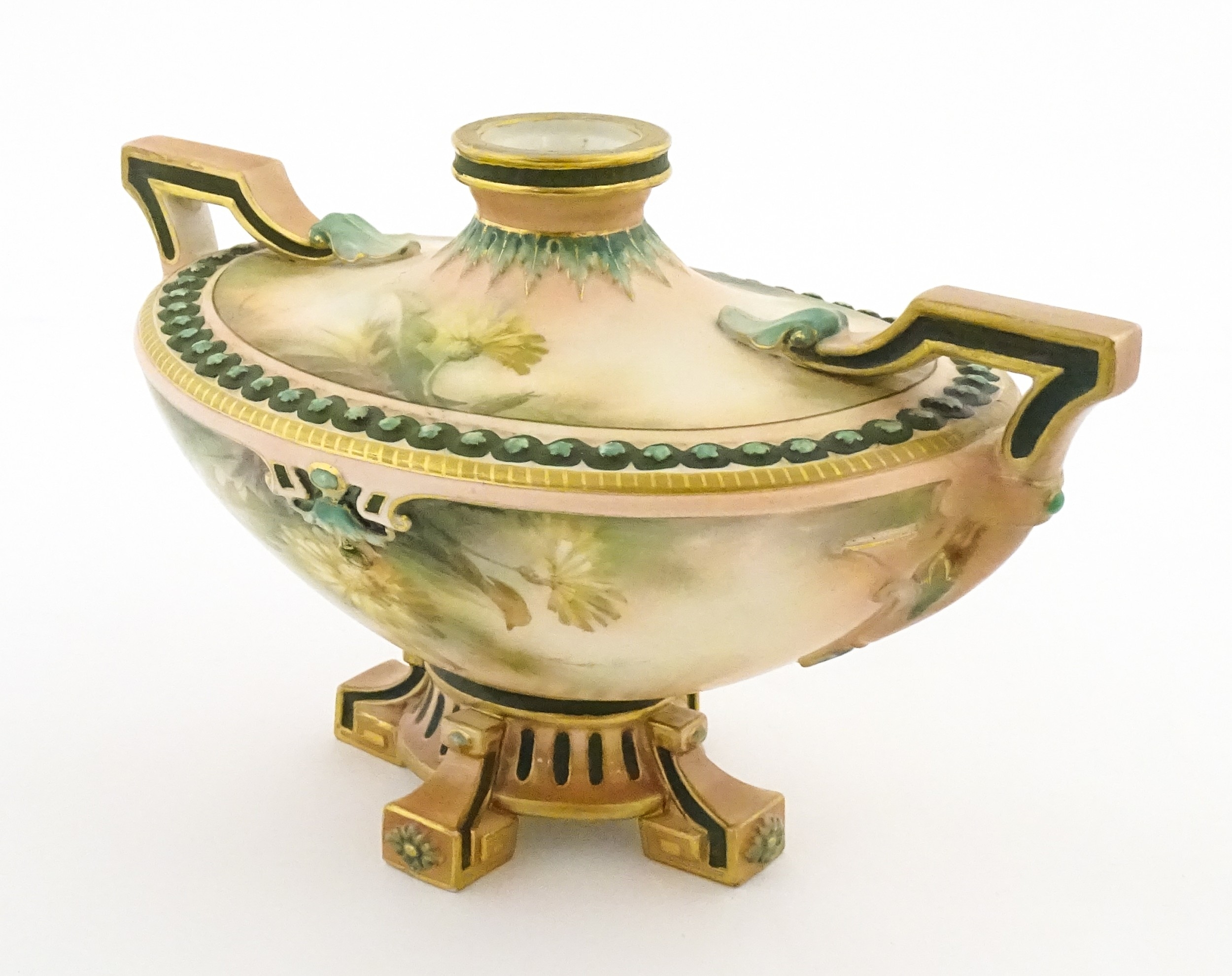 A Hadley's Worcester twin handled squat vase of boat form decorated with chrysanthemum flowers and foliage. Marked under. Approx. 5 1/4" high