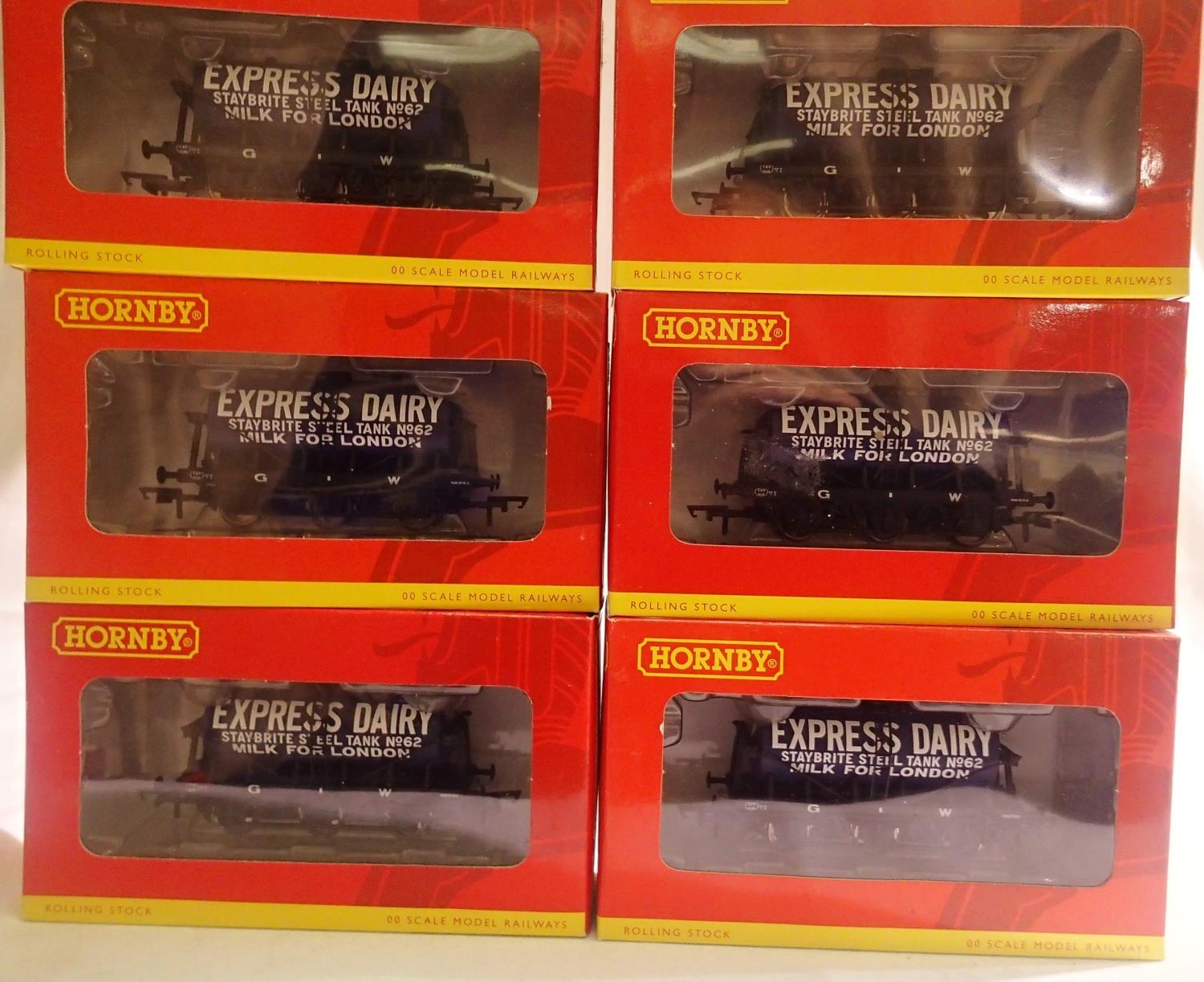 Six Hornby R6378 six wheel tanker, Express Dairy, near mint, slight storage wear to boxes. P&P Group 1 (£14+VAT for the first lot and £1+VAT for subsequent lots)