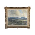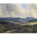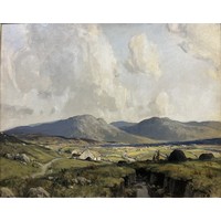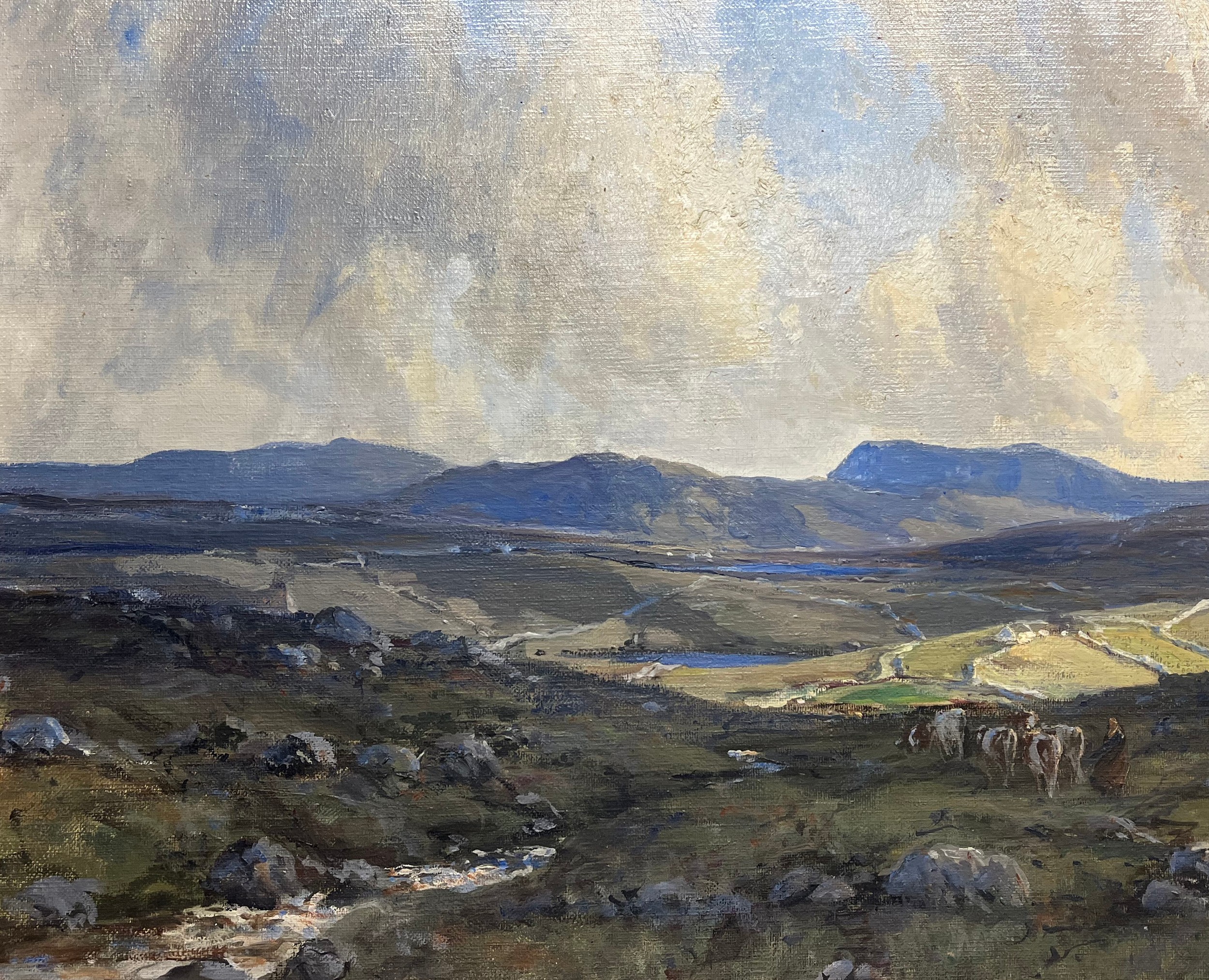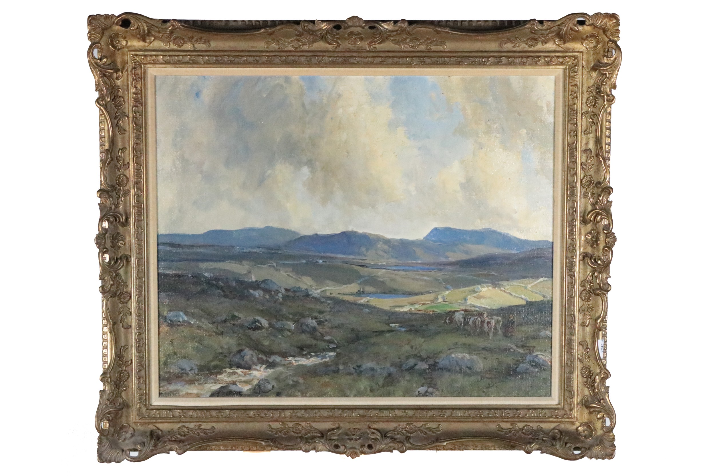 "Irish Moorland - Henley Cattle," O.O.C., extensive West of Ireland Landscape, with female and driver and cattle to right and ladies and mountains in distance, approx. 48cms x 61cms (19" x 24"), signed twice lower right, in contemporary ornate git frame label on reverse. (1)