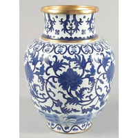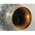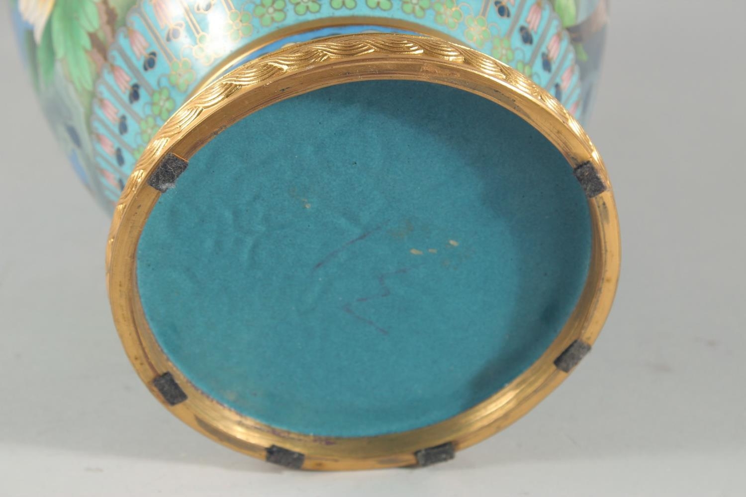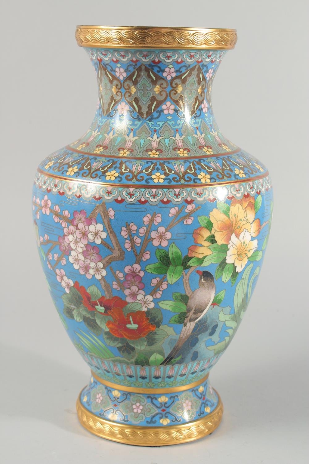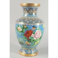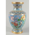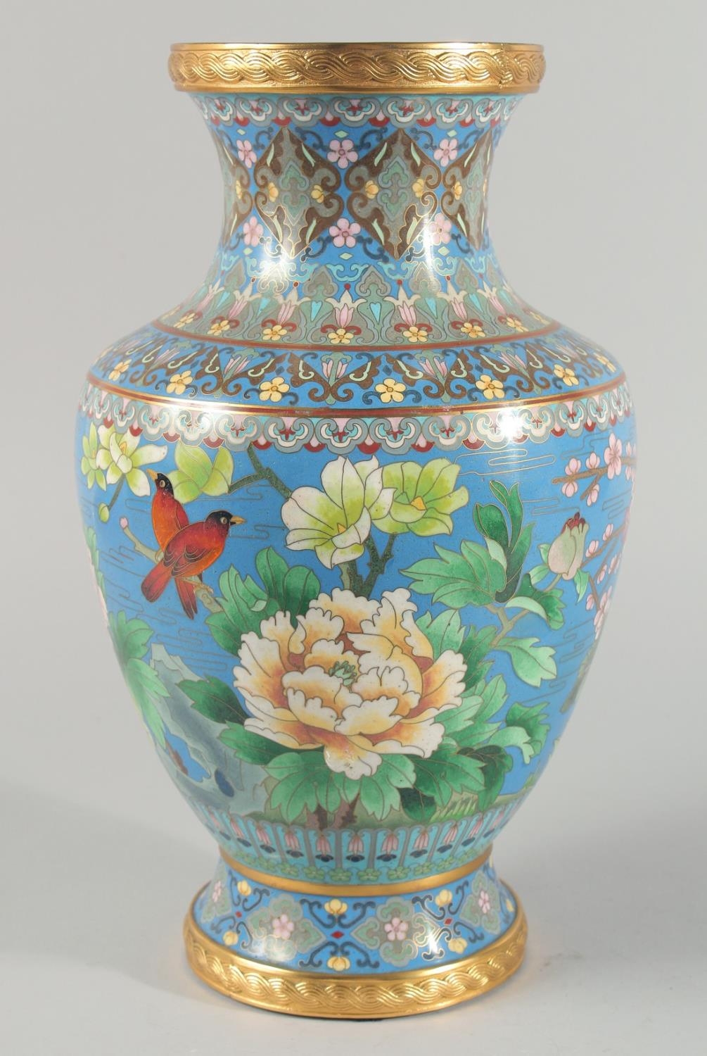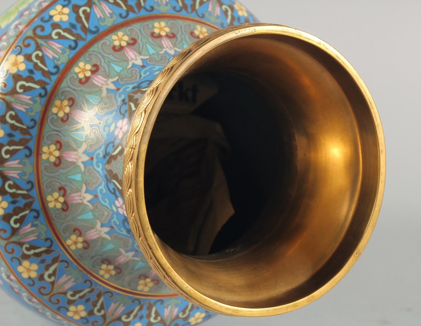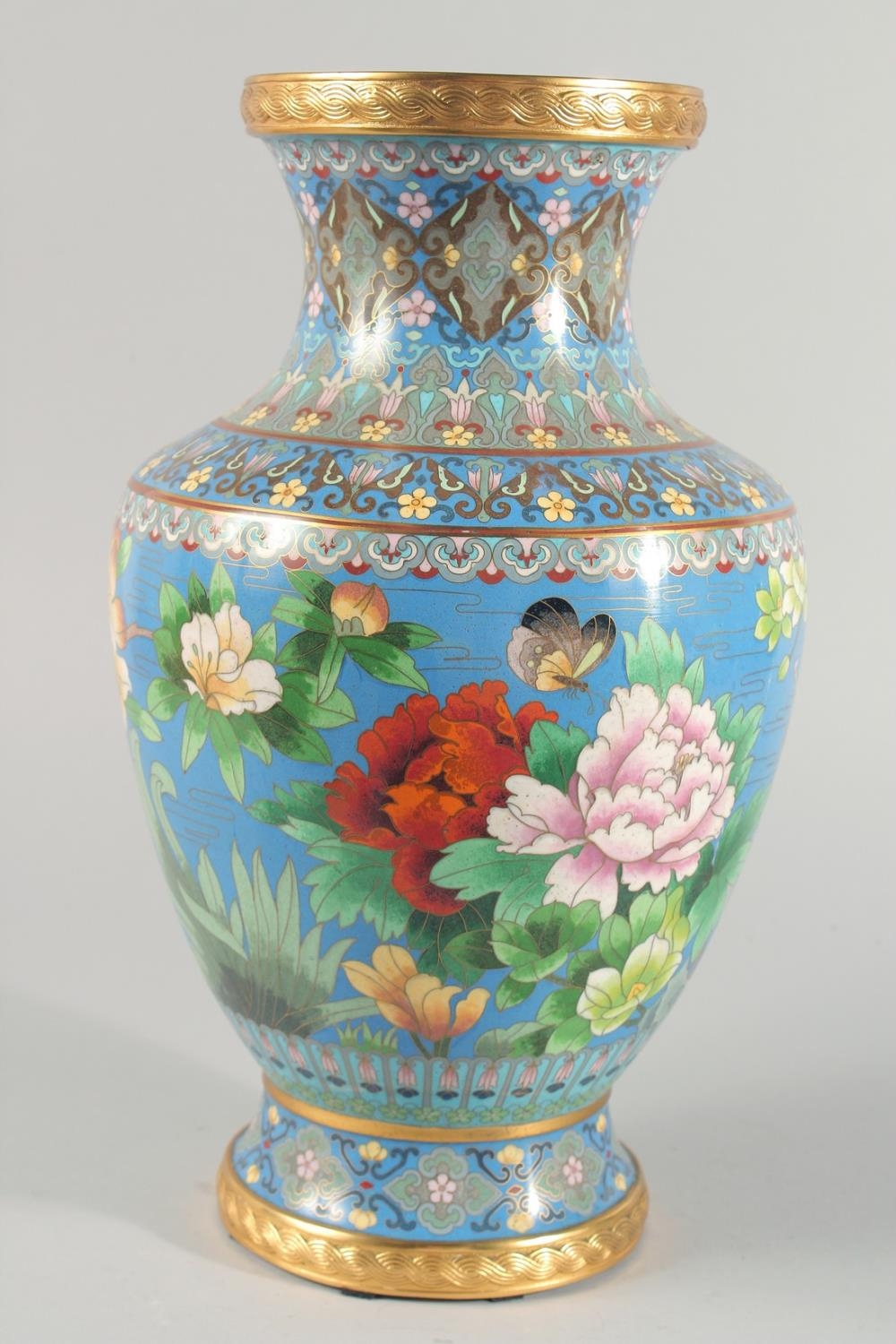 A GOOD LARGE CHINESE BLUE GROUND CLOISONNE VASE, decorated with flowers, birds and butterflies, the neck with bands of stylised floral motifs, 39cm high.