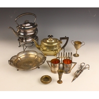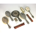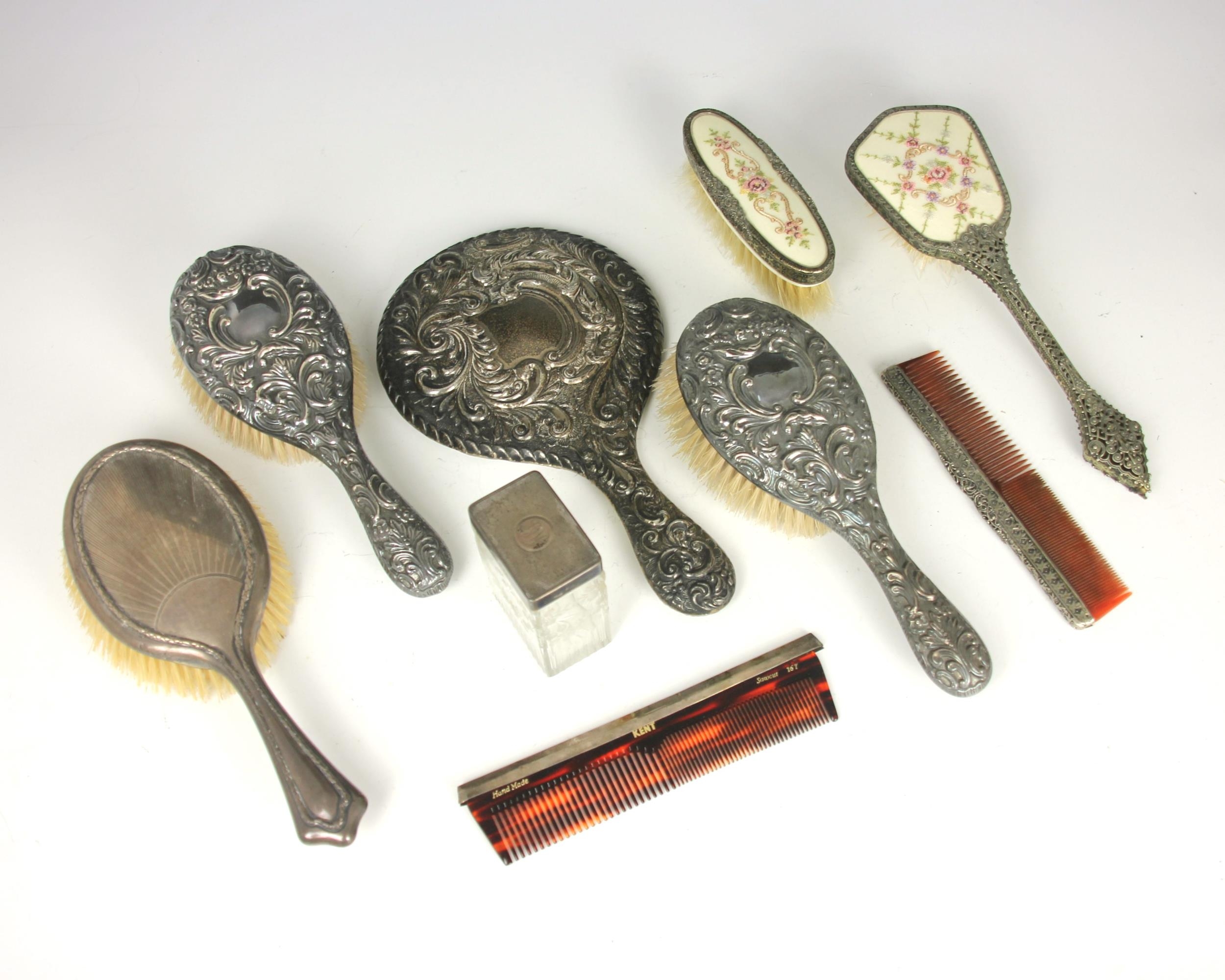 A selection of silver and silver coloured pieces, including two Edwardian silver mounted brushes, possibly Mappin and Webb, London 1903, 24cm long, five further silver/silver coloured mounted dressing table pieces, an embroidered part dressing table set and further pieces (qty) (at fault)